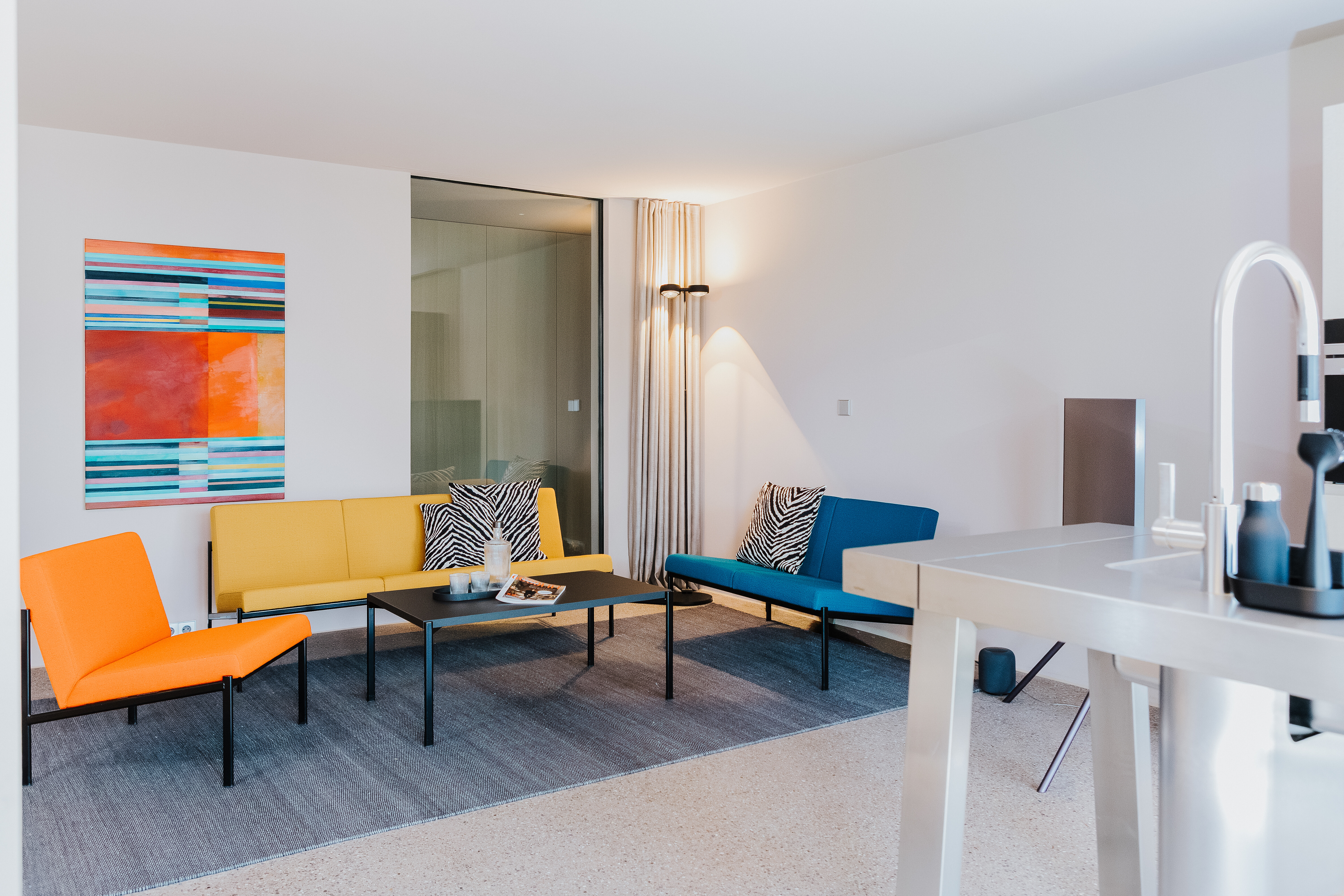 Der Wohnbereich lebt vom Spiel kräftiger Farbakzente: Die Sofas Kiki von Artek in kräftigem Orange, Gelb und Blau setzen lebendige Kontraste zur klaren Architektur. Ihre reduzierte Formensprache bringt Ruhe in den Raum, während die farbliche Gestaltung dem Ensemble eine selbstbewusste Note verleiht. Die weichen Polster und niedrige Silhouette machen die Sofas zu idealen Begleitern für entspannte Stunden am Tag.