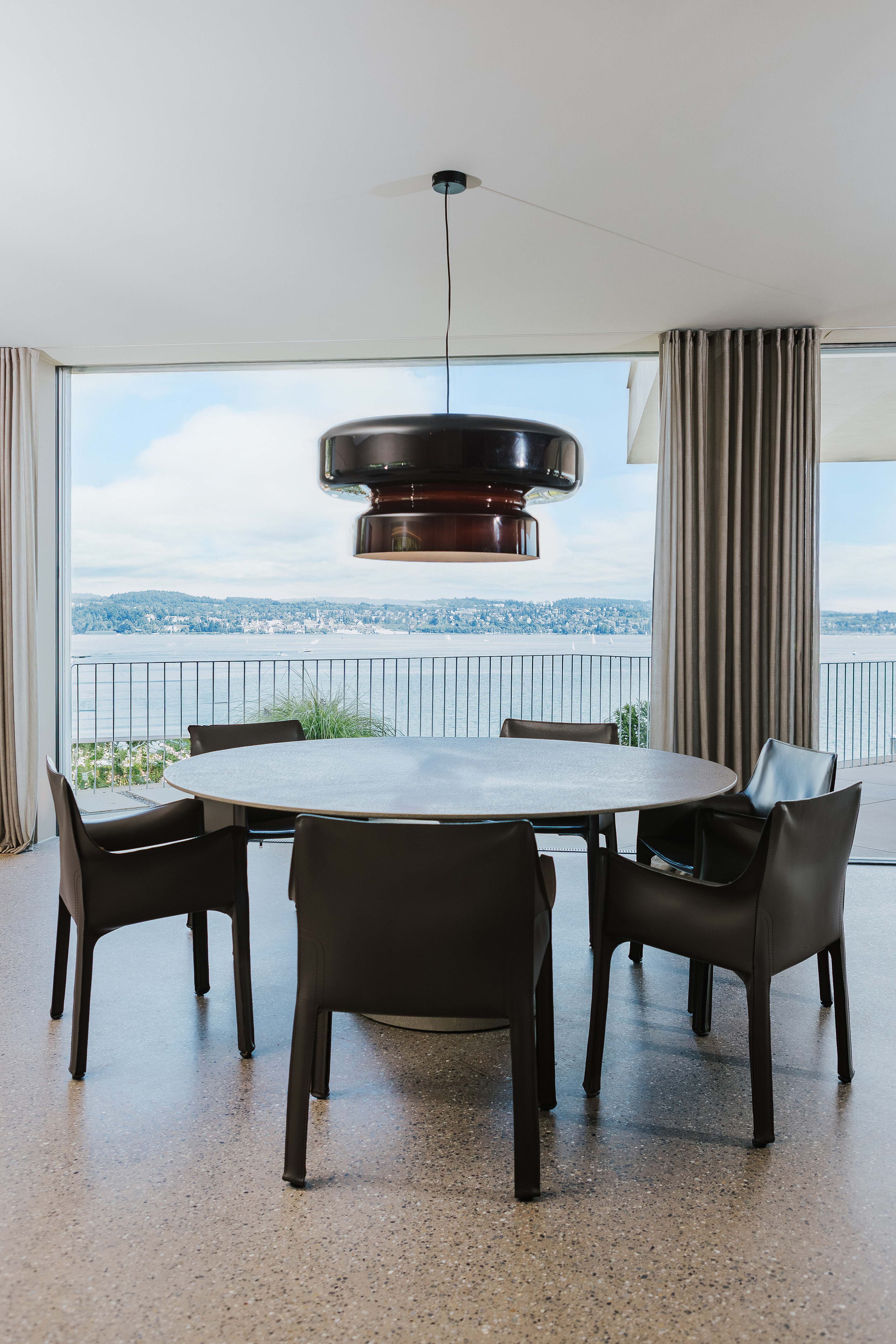 Der zentrale Essbereich fügt sich als vermittelndes Element zwischen Küche und Wohnzone ein. Offen, klar und ohne Trennwände angelegt, wird der Raum durch eine weitläufige Fensterfront zum Außenbereich hin erweitert. Die Möblierung wirkt bewusst zurückhaltend und souverän: Der runde Tisch Clay von Desalto ruht auf einem skulpturalen Fuß und nutzt die Fläche perfekt – als formaler Mittelpunkt in einem luftigen Raumgefüge. Die Lederstühle Cab von Cassina verleihen dem Setting eine archaische, fast skulpturale Note und setzen ein subtiles Zeichen für handwerkliche Qualität. Eine markante Hängeleuchte schafft atmosphärisches Licht und verstärkt die Wirkung der Komposition.