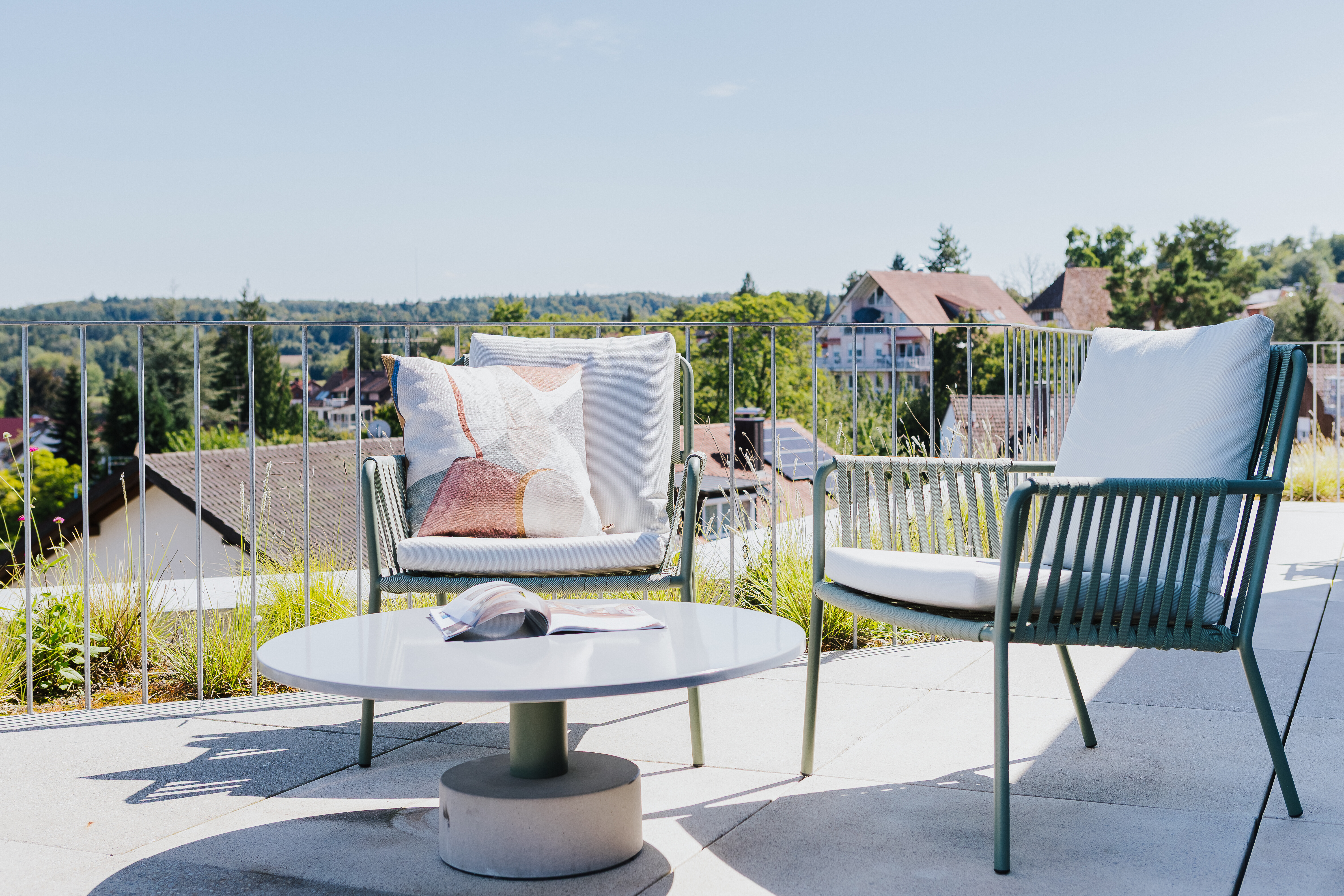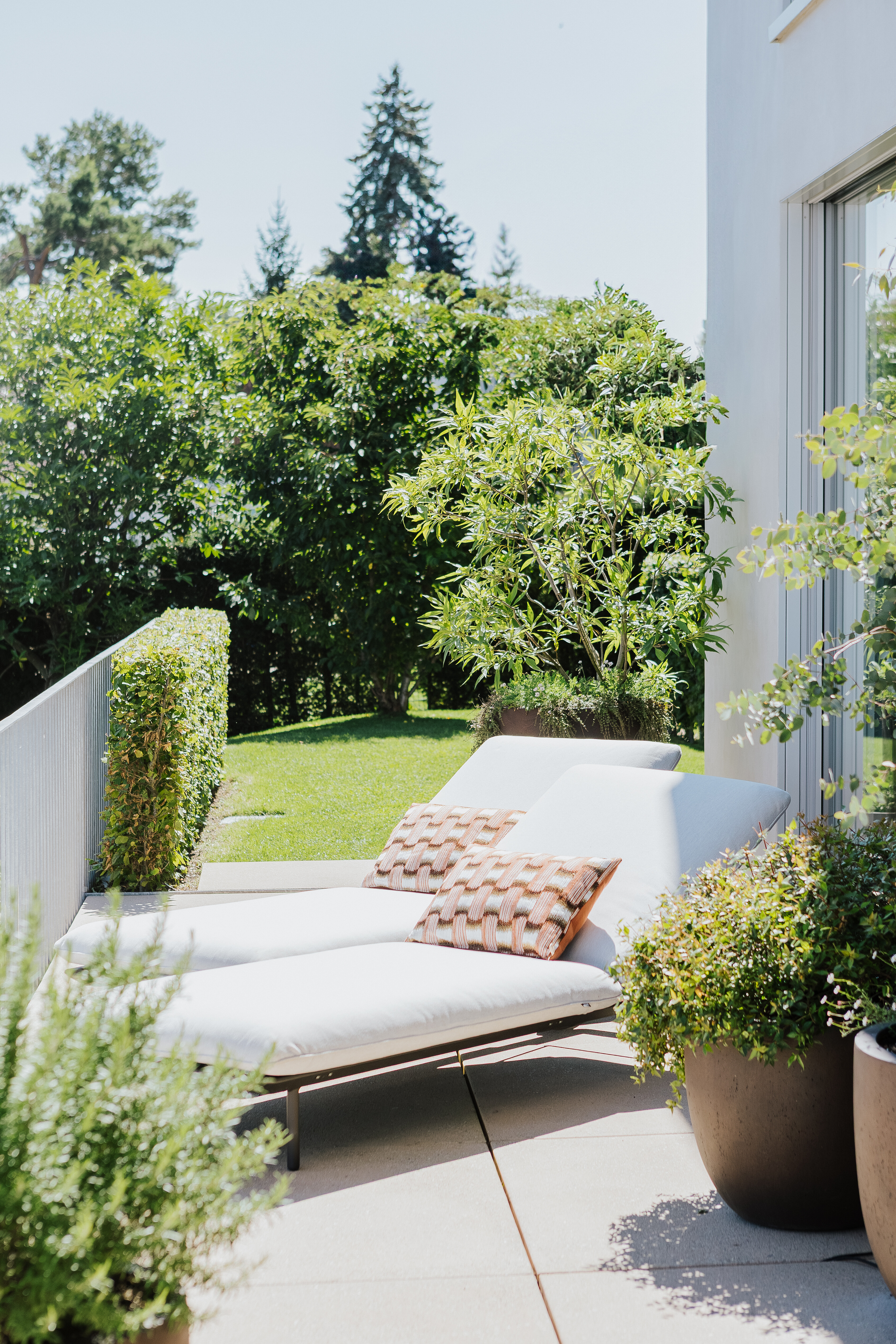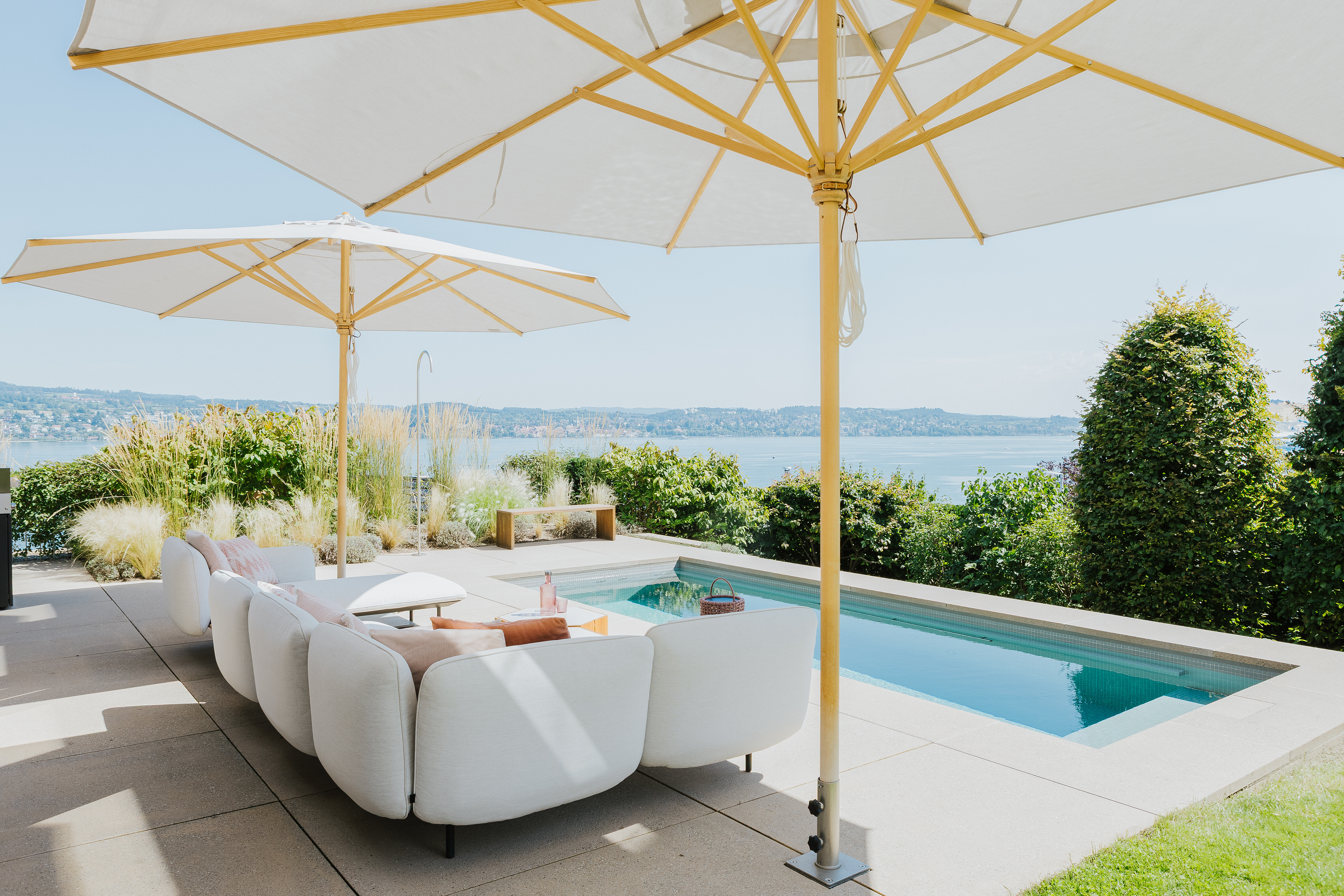 Für angenehmen Schatten sorgen zwei Schirme Klassiker von Weishäupl, deren textile Bespannung durch ihre zurückhaltende Farbgebung dezent in die Landschaft übergeht. Die Kombination aus Blick, Funktionalität und Komfort bringt echtes Urlaubsgefühl ins eigene Zuhause.