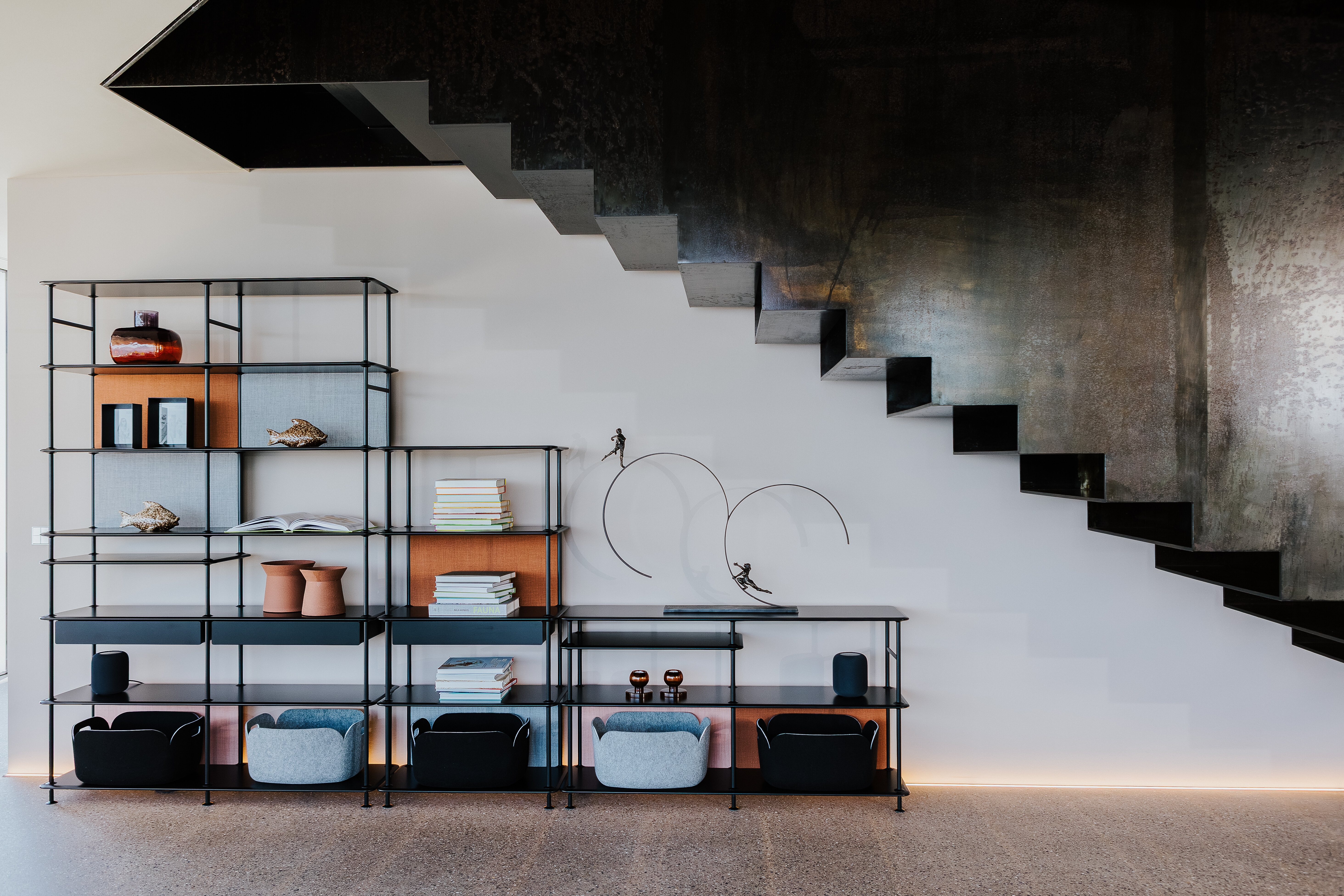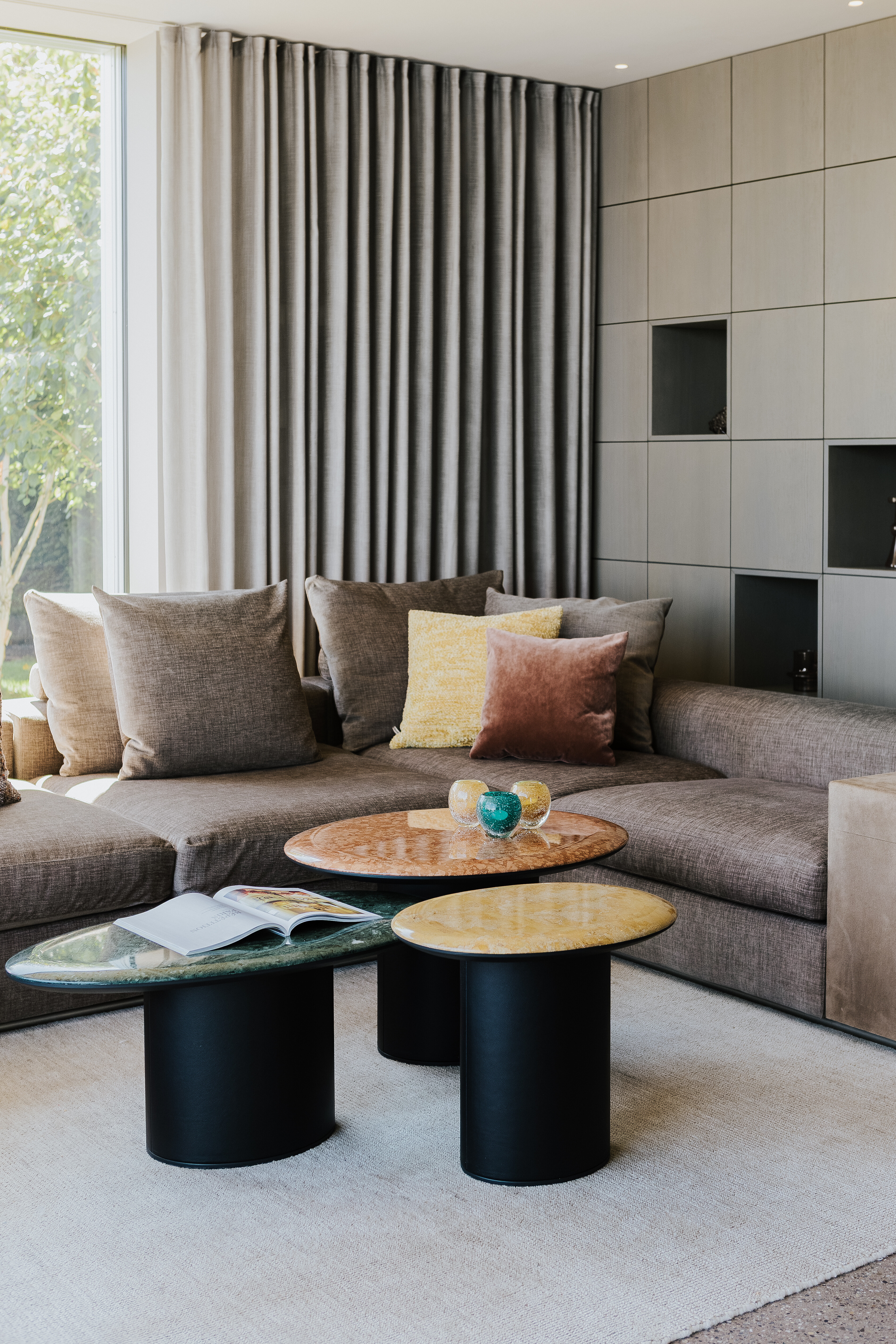 Im weitläufigen unteren Wohnbereich dominiert das großzügige Sofa Groundpiece von Flexform, das mit seiner tiefen Sitzfläche und den klaren Proportionen einen ruhigen Mittelpunkt bildet. Die gedeckten Brauntöne des Sofas unterstreichen die entspannte Atmosphäre und greifen die naturnahen Farbstimmungen des Interieurs auf. Ergänzt wird das Ensemble durch die eleganten Beistelltische Antilles von Wittmann, die mit ihrer skulpturalen Formgebung leise, aber wirkungsvoll auftreten.