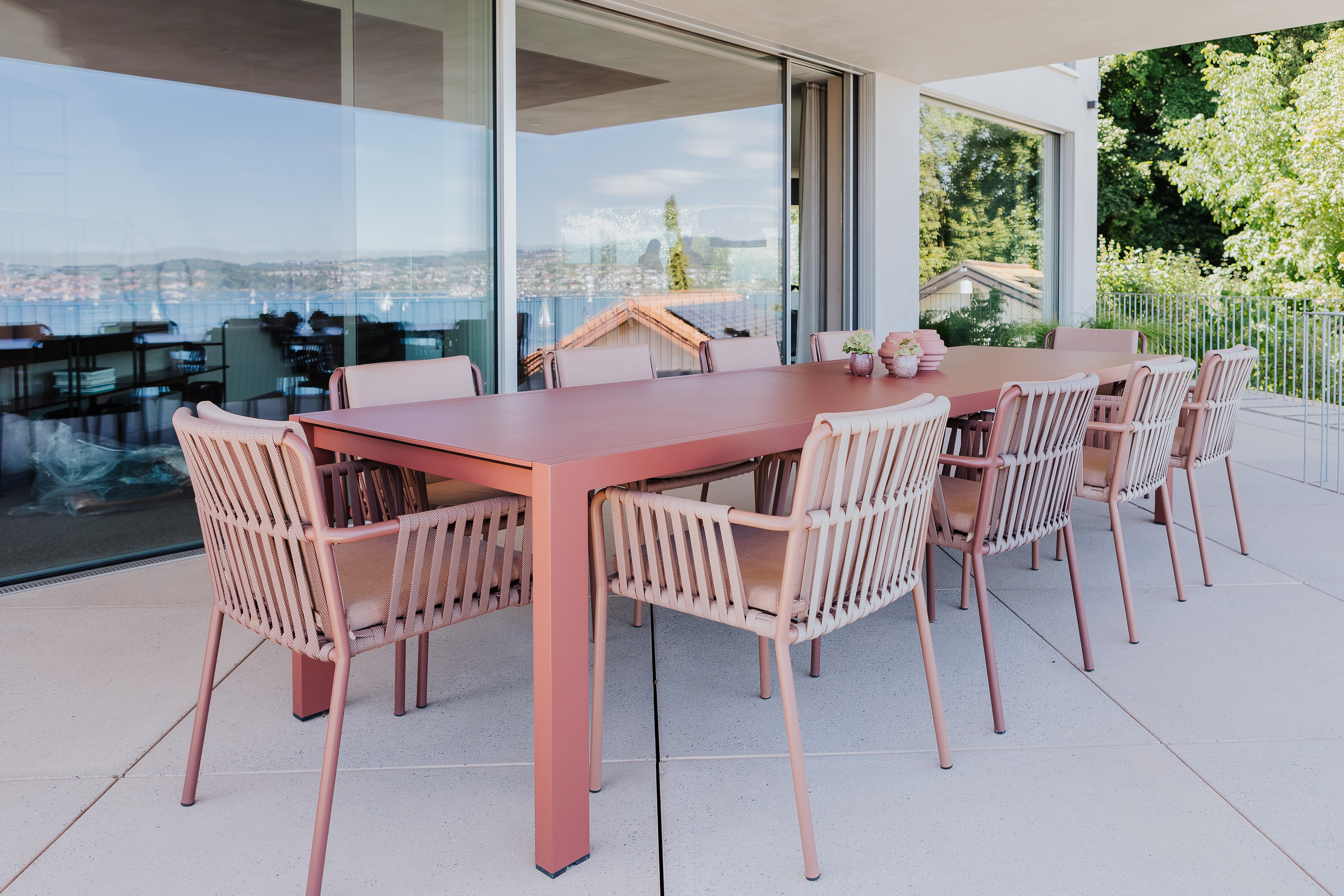 Direkt angrenzend an den Innenbereich öffnet sich die weitläufige Terrasse – fließend in das Gesamtbild eingebunden. Hier erweitert ein langer Esstisch Landscape von Kettal den Essplatz unter freiem Himmel. Die Tischplatte überzeugt durch ihre ruhige, großzügige Linienführung und bietet Raum für gesellige Momente im Freien. Ergänzt wird das Ensemble durch komfortable Net-Armlehnstühle, ebenfalls von Kettal, in einem lebendigen Roséton, der farblich einen Kontrapunkt zur klaren Architektur setzt. Die Materialität der Outdoor-Möbel harmoniert mit dem naturnahen Gartenbild – robust, elegant und langlebig zugleich.