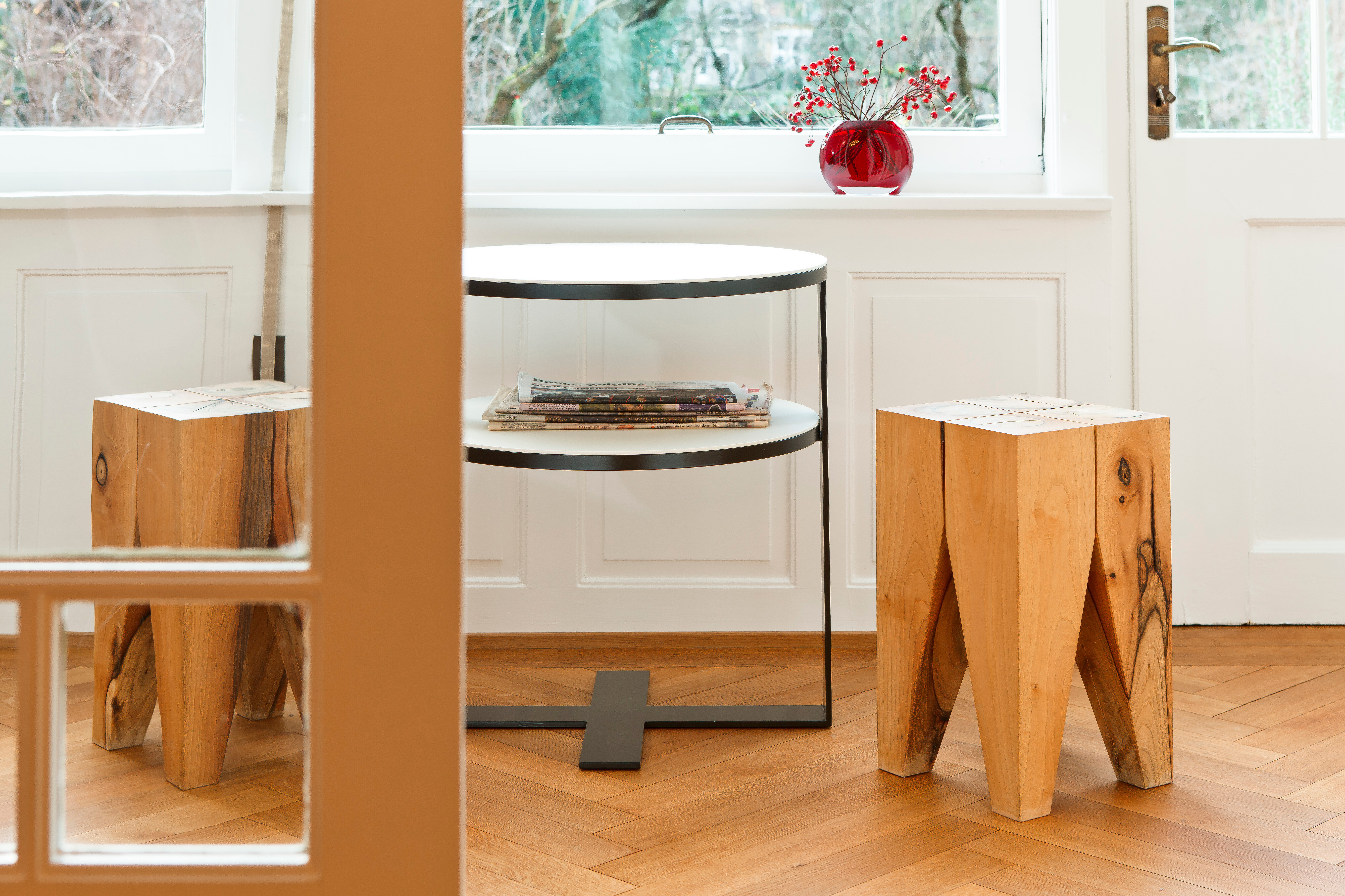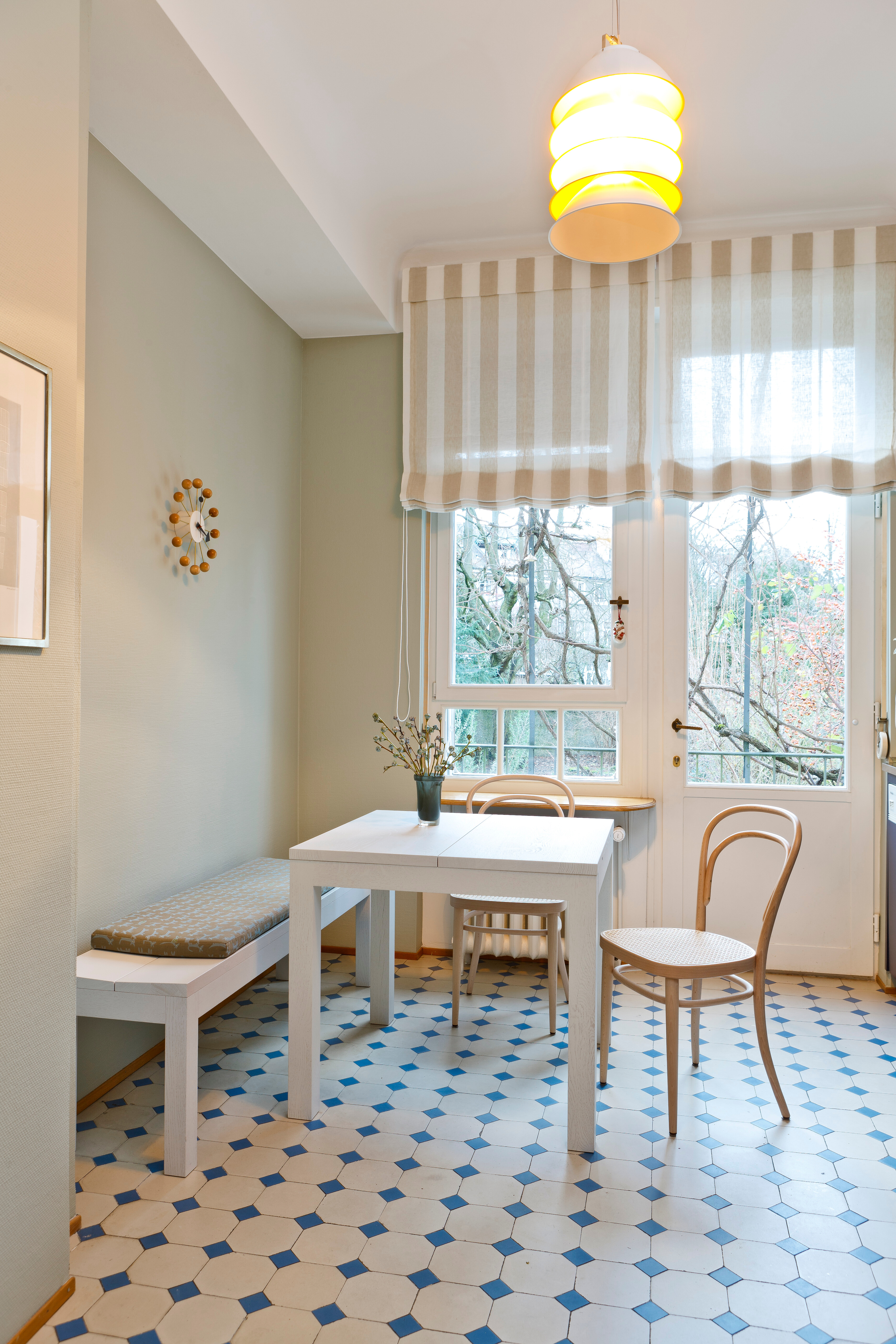 In der Küche setzen zwei klassische Bugholzstühle von Thonet in warmem Holzton einen bewussten Kontrast zum weißen Tisch – einer weiteren Ausführung von Marlene – und verankern das Raumkonzept fest im Handwerk. Auch hier sorgt das ausgewogene Spiel von Farbe, Form und Materialität für eine ruhige, durchdachte Atmosphäre.