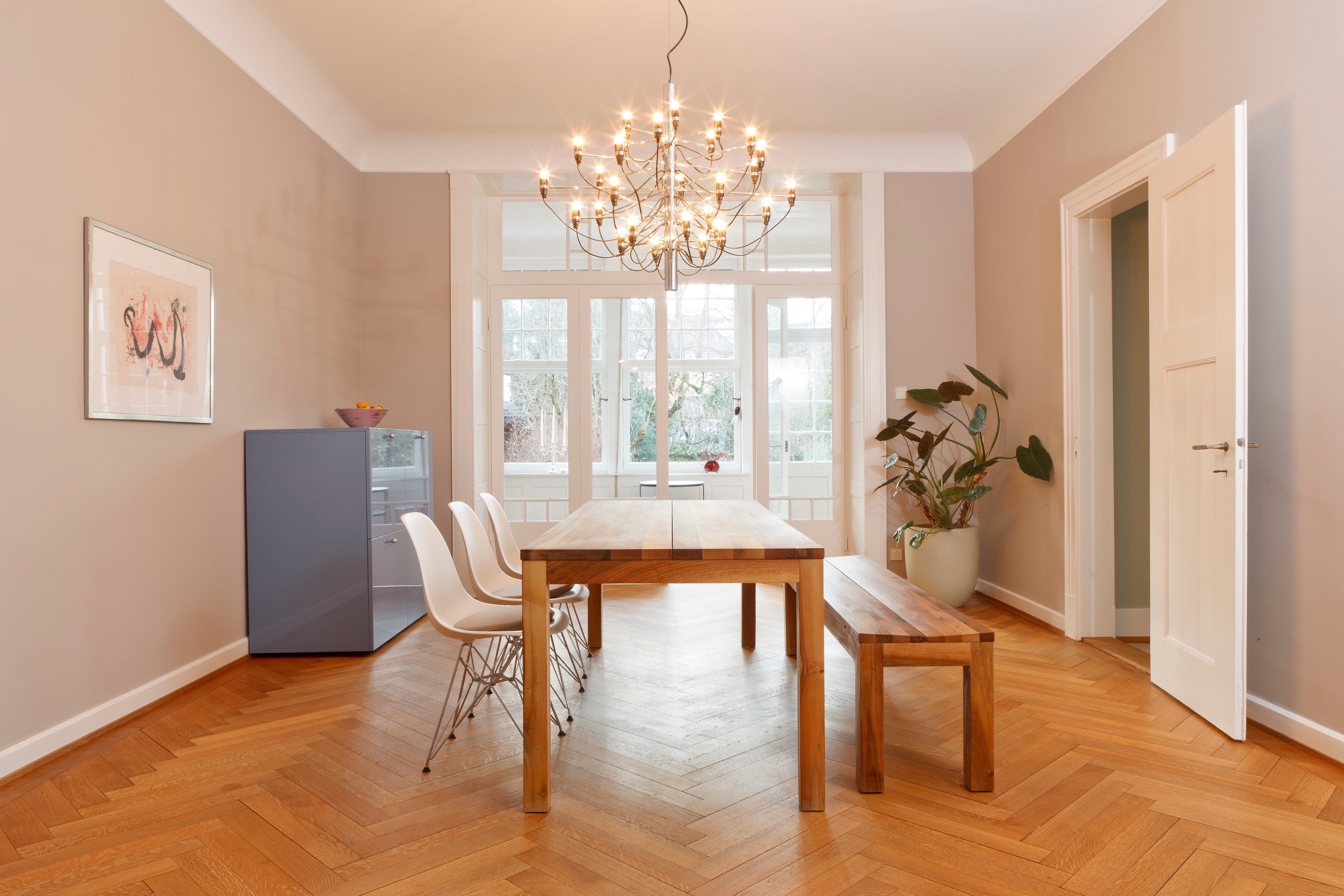 Im Essbereich entfaltet sich das Zusammenspiel aus historischen Elementen und zeitgemäßer Gestaltung besonders stimmig: Der Tisch Marlene von e15 in hellem Holz wird von passenden Bänken Miwa flankiert und durch die weißen Eames Plastic Side Chairs DSR von Vitra ergänzt. Die Kombination aus reduzierter Formensprache und natürlichem Material fügt sich harmonisch in das stilvolle Gesamtbild ein.