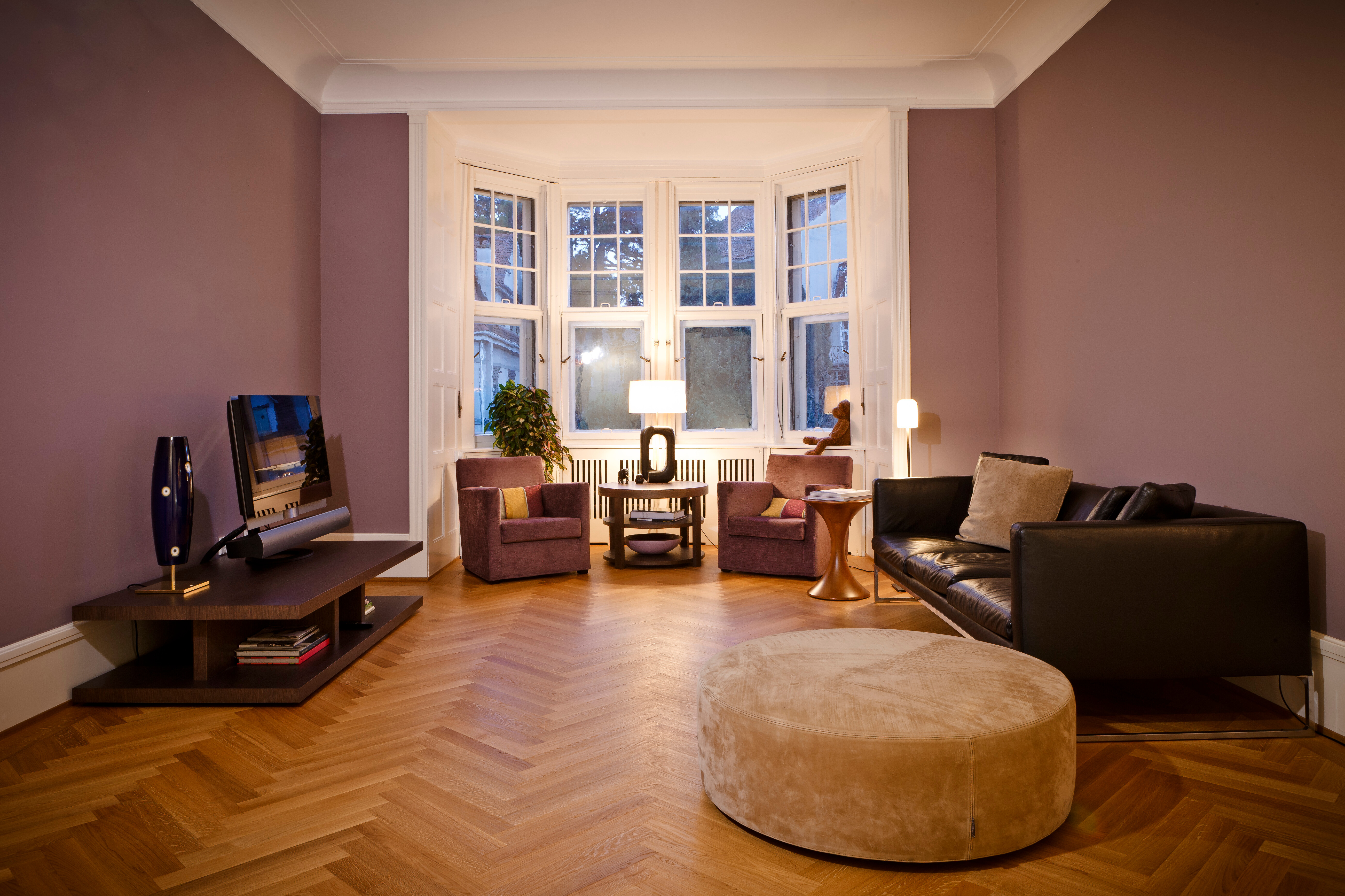 Das Wohnzimmer überrascht mit einer violett gestrichenen Wand, die dem Raum eine kraftvolle Tiefe verleiht. Davor positioniert: das dunkle Ledersofa Tight von B&B Italia, dessen klare Linien dem Raum Struktur geben. Ergänzt wird die Sitzgruppe durch den Beistelltisch Kitay von Minotti – ein feines Detail, das das Spannungsverhältnis zwischen Altbaucharakter und zeitgenössischem Design stimmig abrundet.