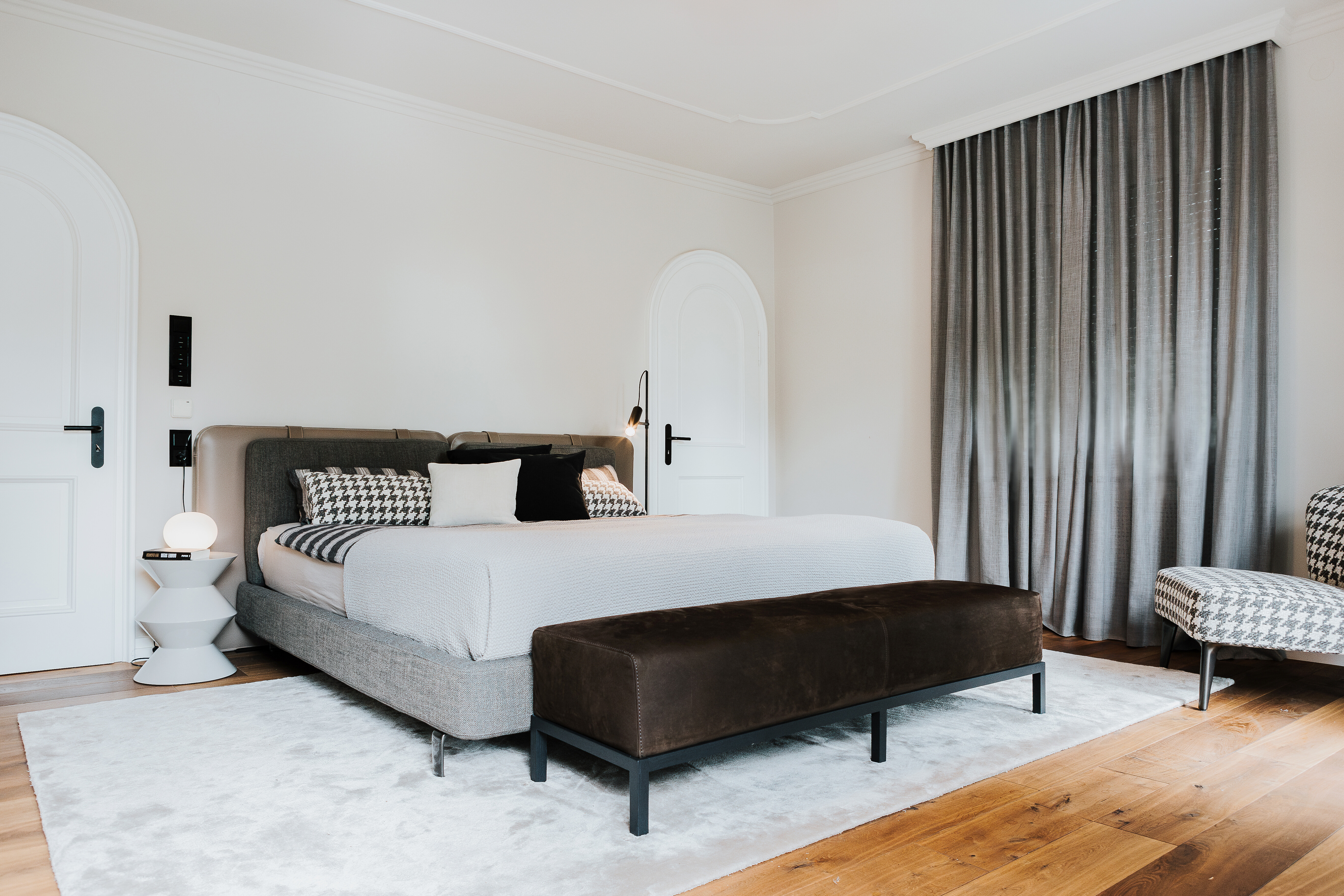 Das gestalterische Konzept setzt sich im Schlafzimmer mit klarer Linie und spürbarer Ruhe fort. Das Bett Tatlin Soft von Minotti sorgt für entspannte Zurückhaltung und eine ruhige Ausstrahlung. Ergänzt wird es durch die Bettbank Berry von Meridiani und den skulpturalen Beistelltisch Cesar von Minotti – ein stimmiges Ensemble aus Komfort, Funktion und gestalterischer Klarheit.