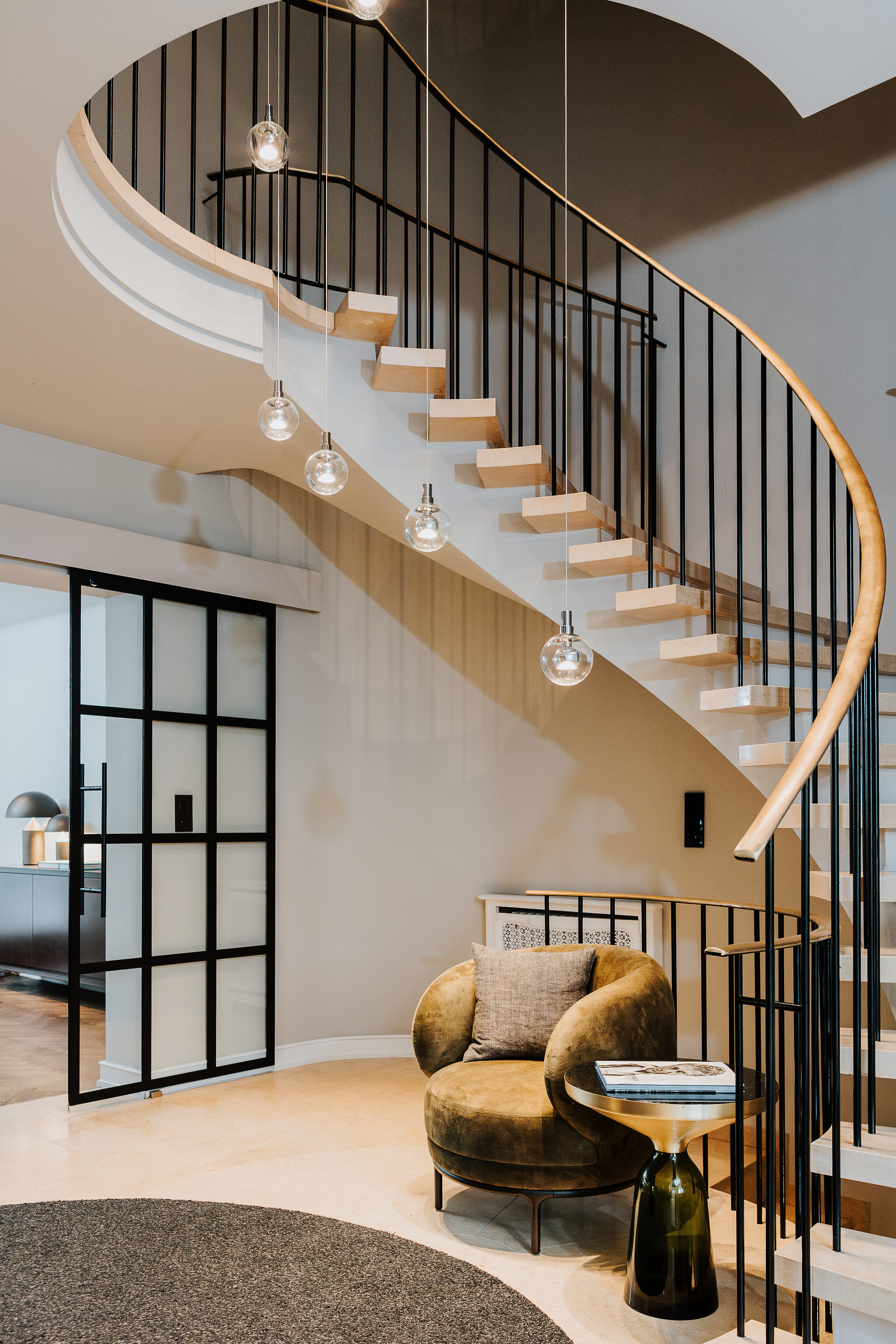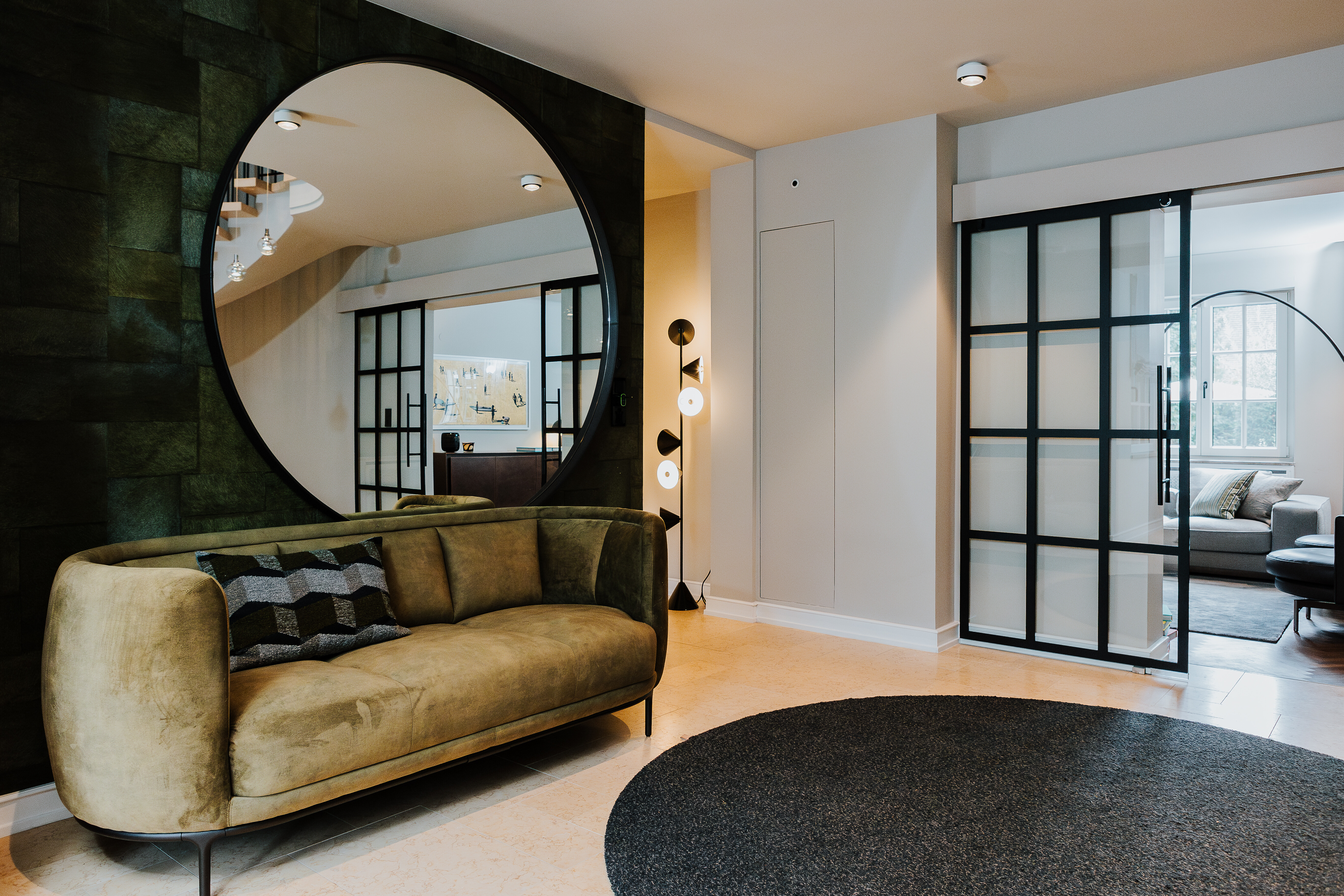 Auch der Eingangsbereich ist mehr als ein funktionaler Übergang: Ein samtgrünes Sofa und der passende Sessel Vuelta von Wittmann greifen das Farbkonzept des Hauses auf und integrieren sich mit selbstverständlicher Eleganz. Die einladenden Sitzmöbel setzen wohnliche Akzente, noch bevor man den eigentlichen Wohnbereich betritt – und geben bereits beim Ankommen einen ersten Eindruck der gestalterischen Haltung des Hauses.
