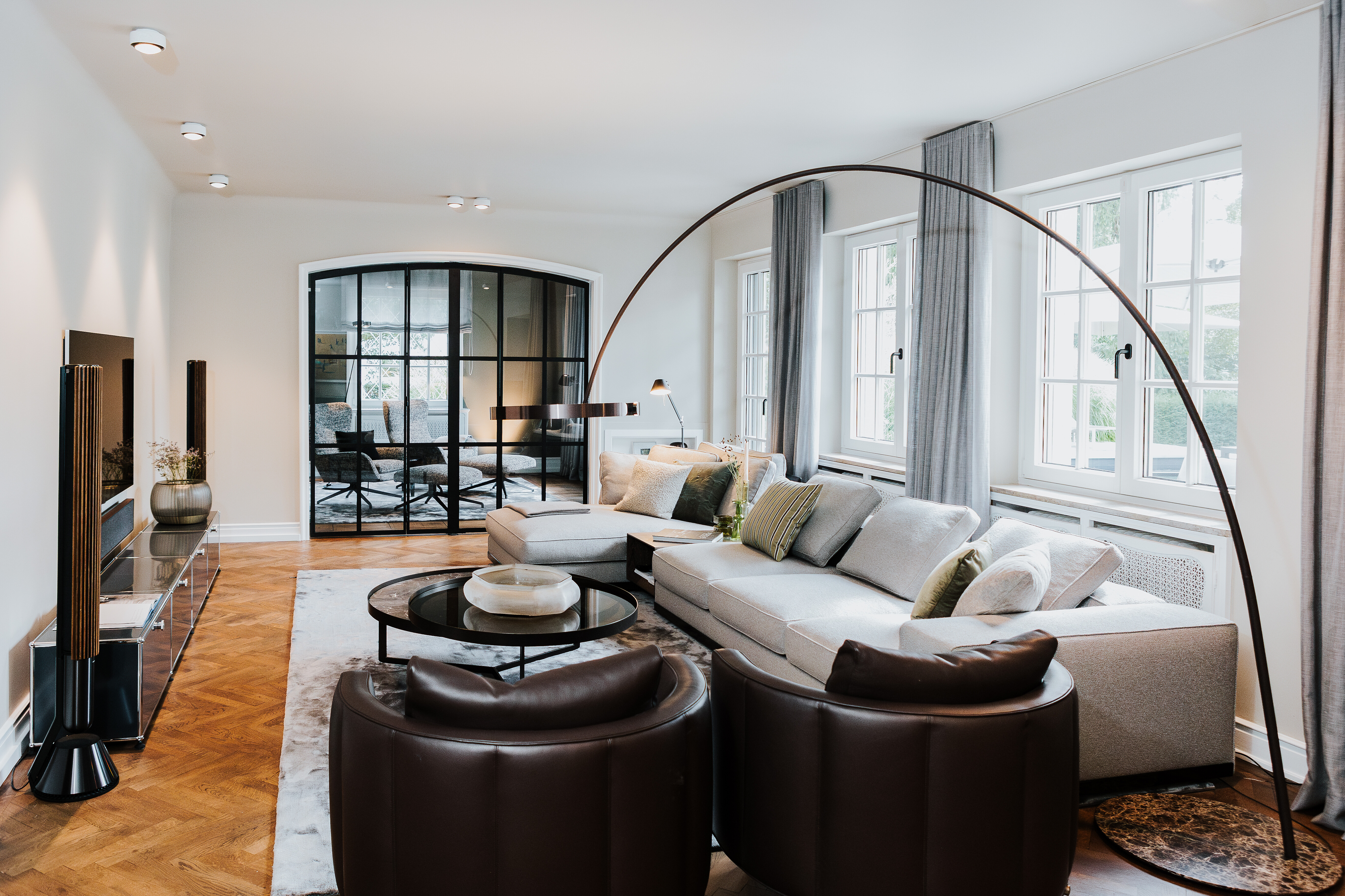 Ein besonderes Lichtobjekt ist die weit ausragende Stehleuchte Mito Largo von Occhio. Mit ihrer skulpturalen Erscheinung überspannt sie die Sitzlandschaft bis in deren Zentrum mühelos, setzt stilvolle Lichtakzente und bringt - subtil, aber wirkungsvoll - einen Hauch moderner Ausstrahlung in das klassisch-elegante Interieur der Villa.