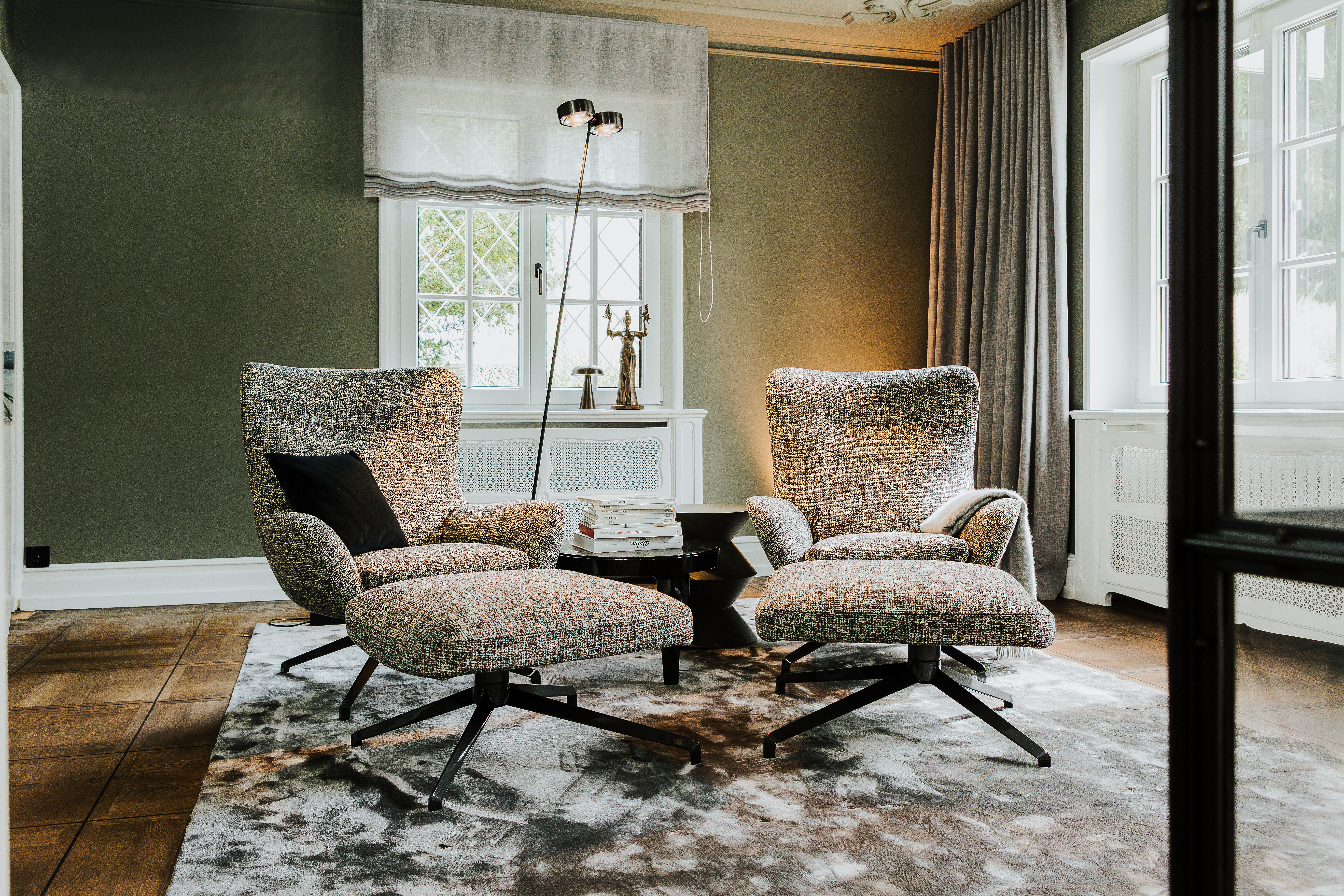 Im Nebenraum des Wohnbereichs laden zwei Sessel Jensen Bergère von Minotti zum Innehalten ein. Mit ihrer weich gepolsterten Sitzschale und einer umschmeichelnden Formensprache schaffen sie ein wohnliches Refugium – reduziert, aber höchst einladend.