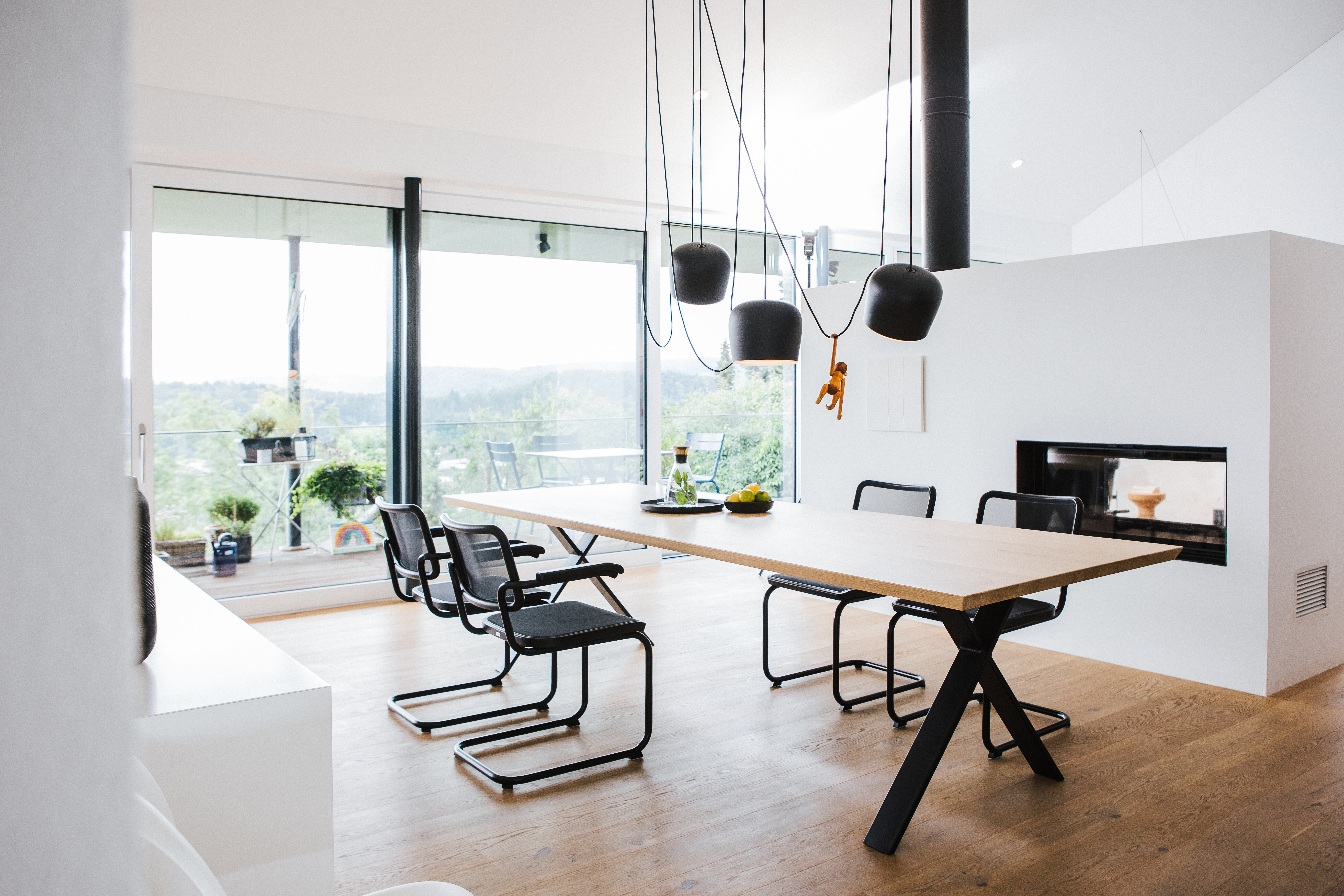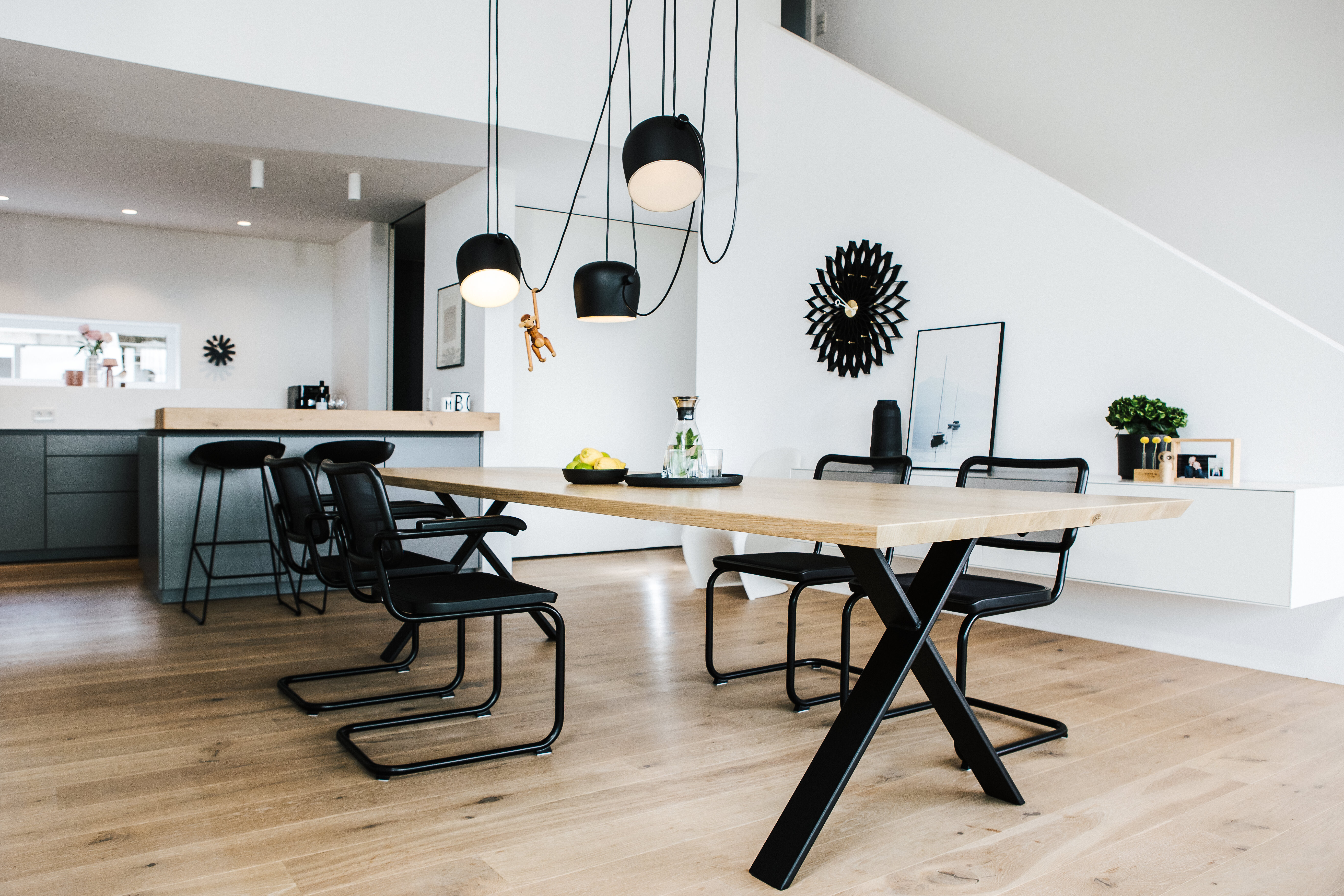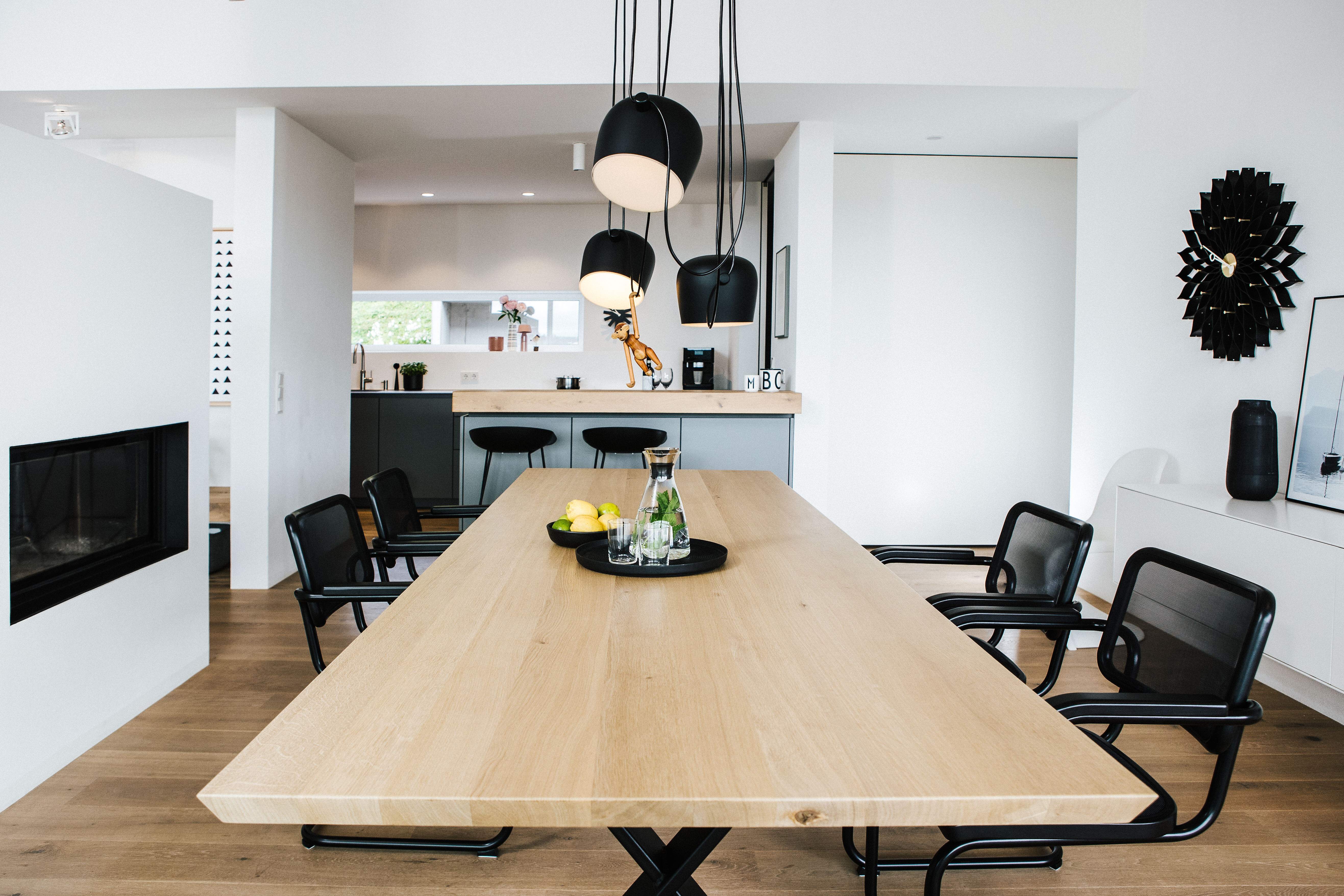 Schwarze Wanduhren – Asterisk und Sunflower von Vitra – fügen sich als feine grafische Elemente unaufdringlich in das Konzept ein und unterstreichen die durchdachte Balance zwischen Funktion und Gestaltung. Der angrenzende Ofen bildet ein verbindendes Element zwischen Ess- und Wohnbereich – er verankert den Raum atmosphärisch und gibt ihm zusätzlich Tiefe und Geborgenheit.