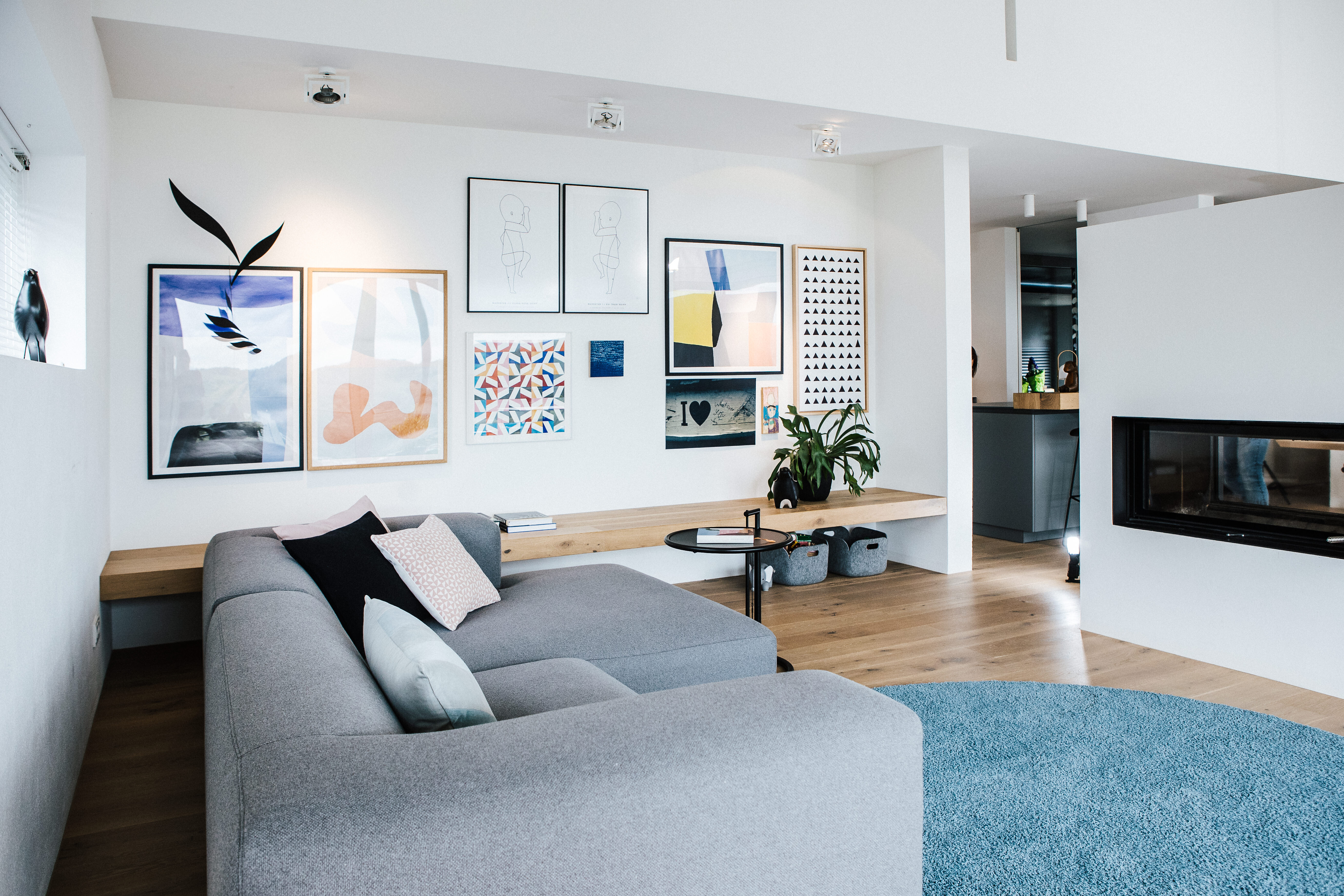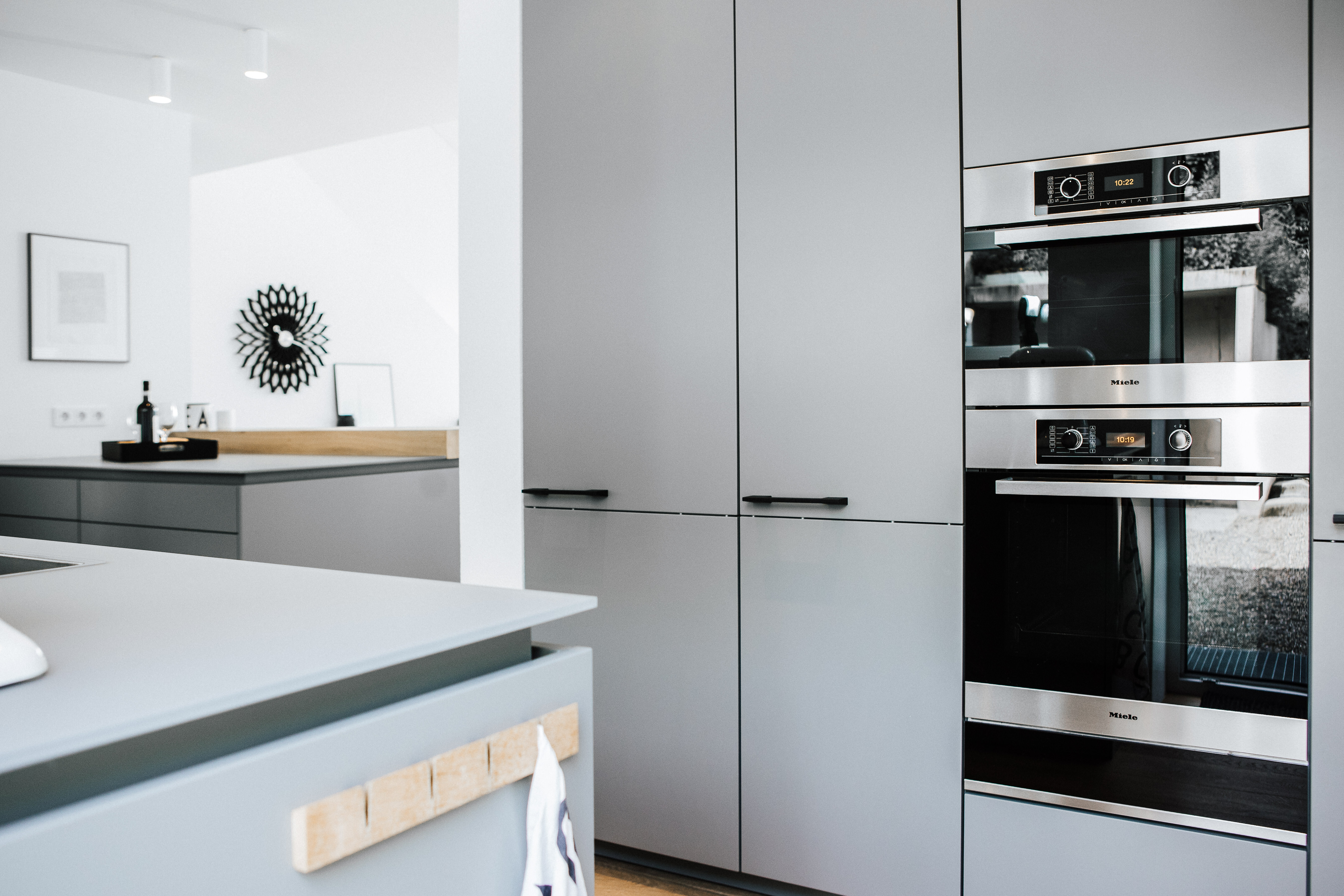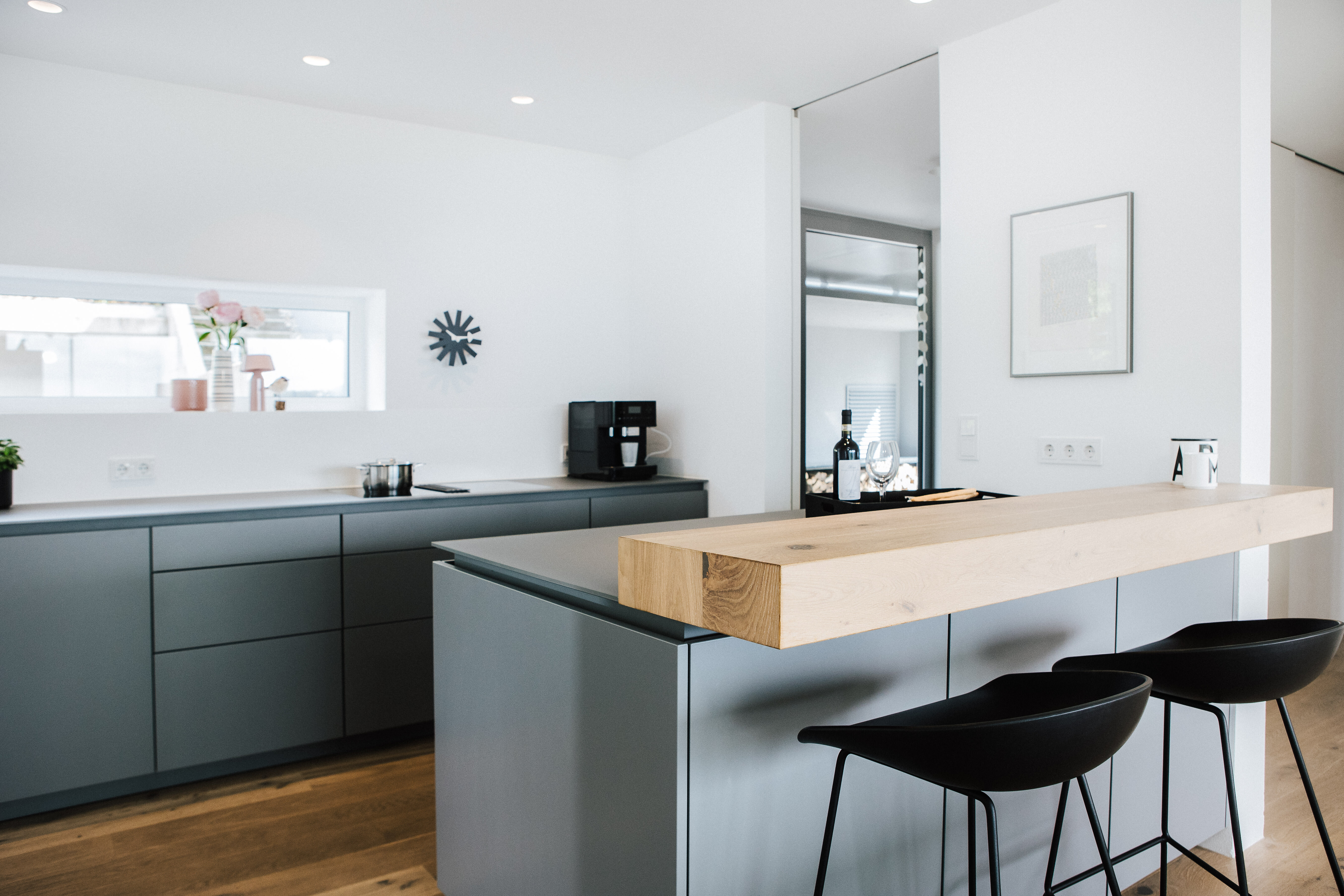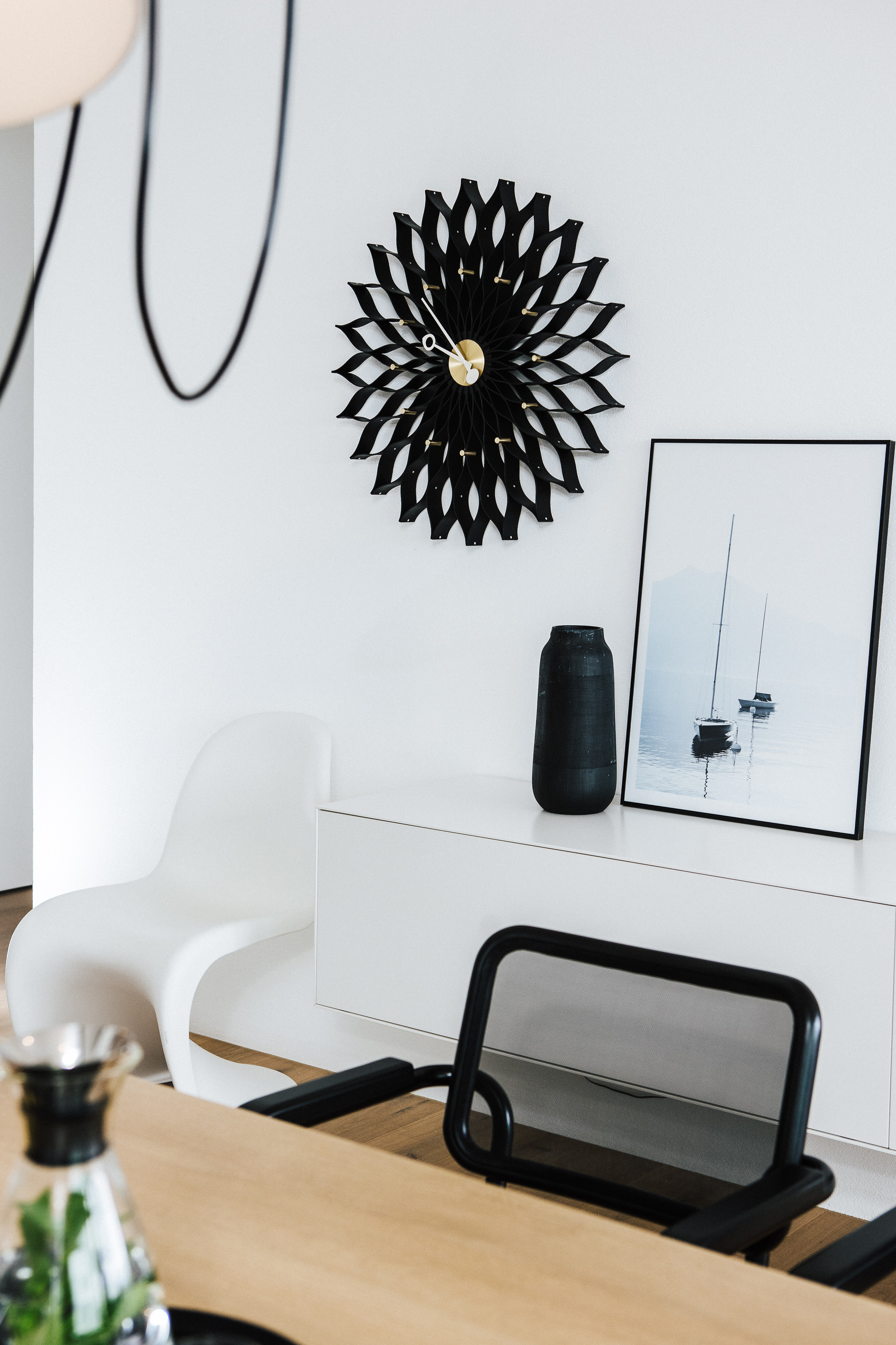 Schwarze Wanduhren – Asterisk und Sunflower von Vitra – fügen sich als feine grafische Elemente unaufdringlich in das Konzept ein und unterstreichen die durchdachte Balance zwischen Funktion und Gestaltung. Der angrenzende Ofen bildet ein verbindendes Element zwischen Ess- und Wohnbereich – er verankert den Raum atmosphärisch und gibt ihm zusätzlich Tiefe und Geborgenheit.