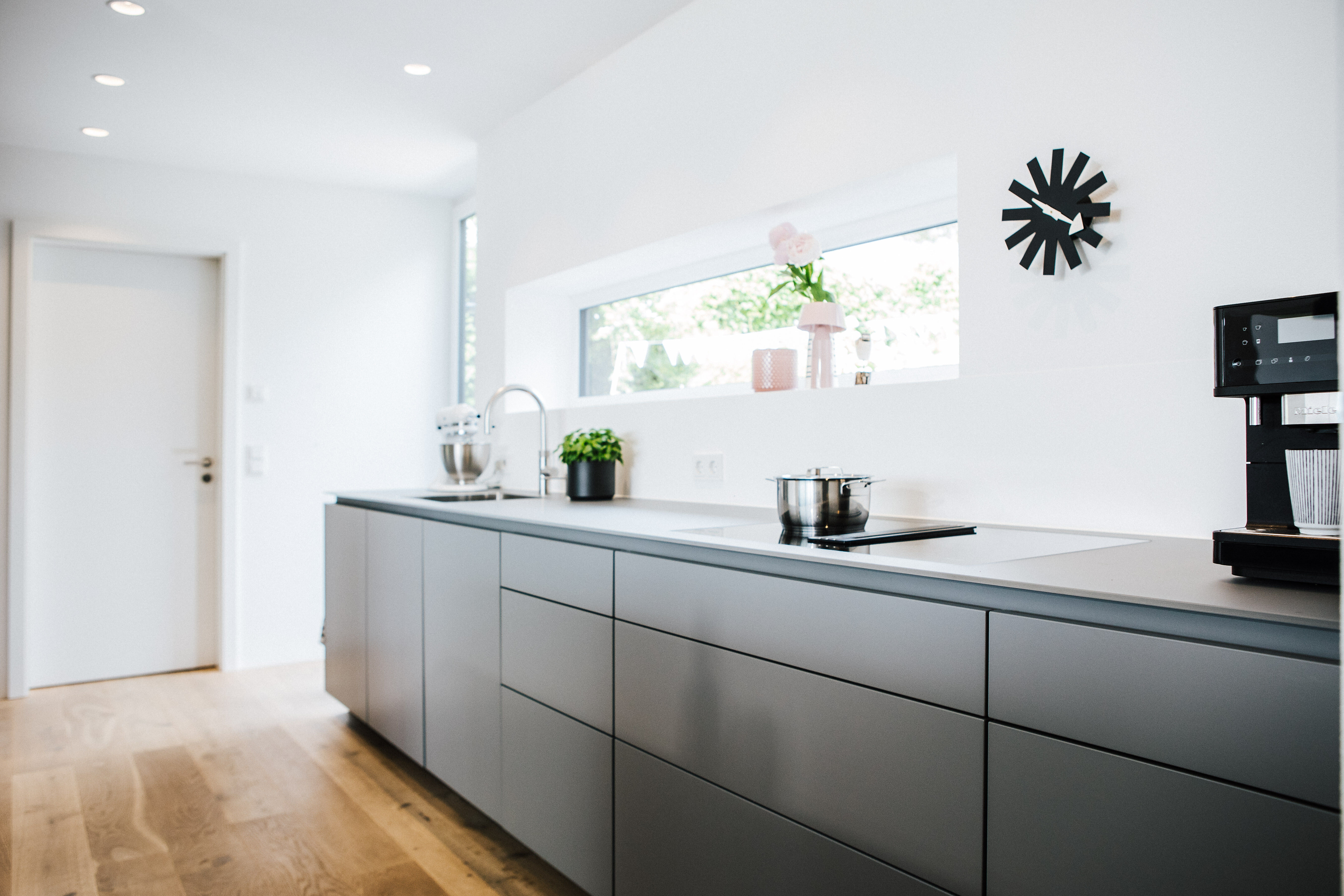 Die offen gestaltete Küche schließt direkt an den Essbereich an und fügt sich mit ihrer matten Oberfläche in Steingrau nahtlos in das zurückhaltende Farbkonzept ein. Als zentrales Element überzeugt die Einbauküche VH von Poggenpohl nicht nur durch ihre reduzierte Gestaltung, sondern auch durch eine klare Funktionalität, die den Alltag elegant begleitet.