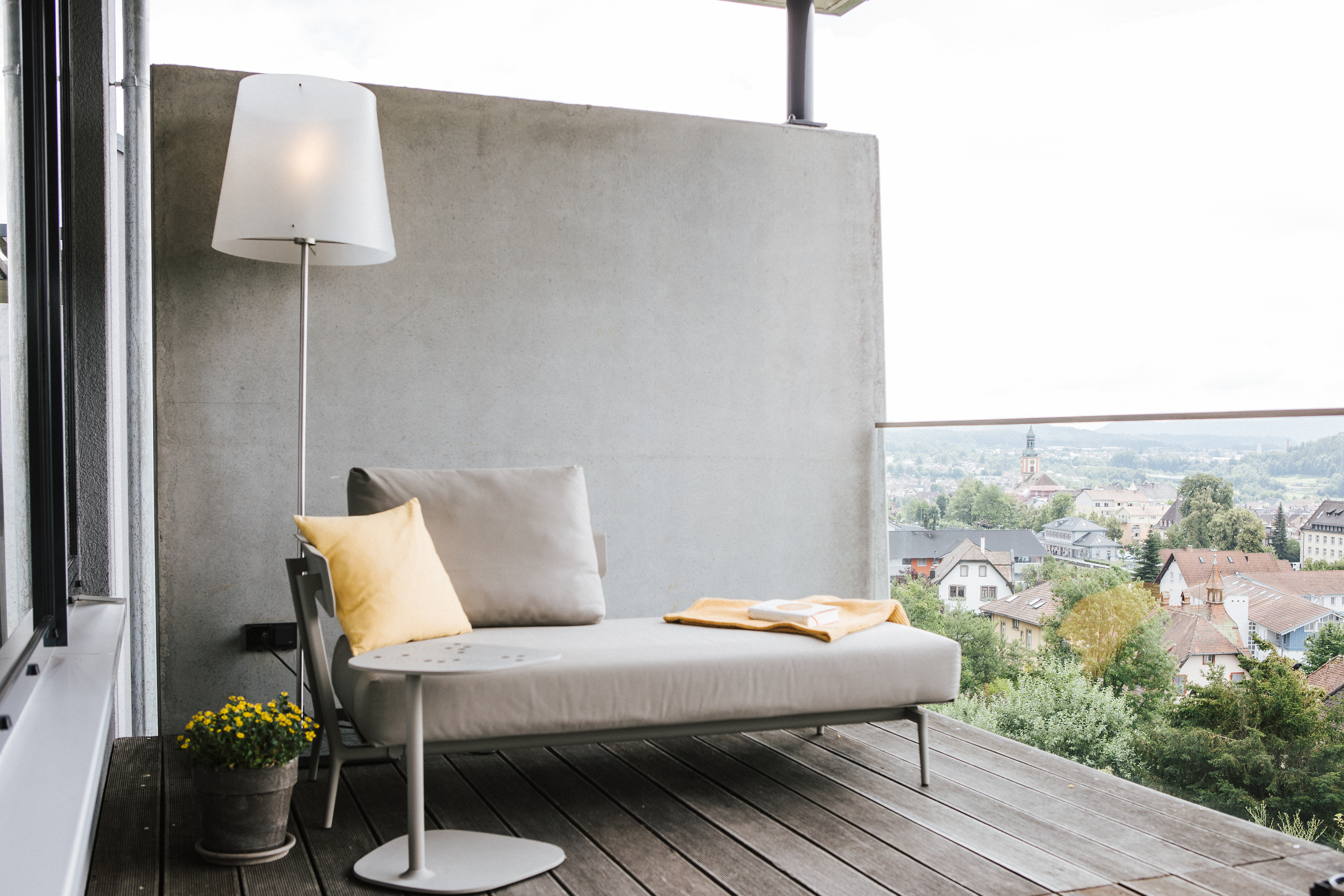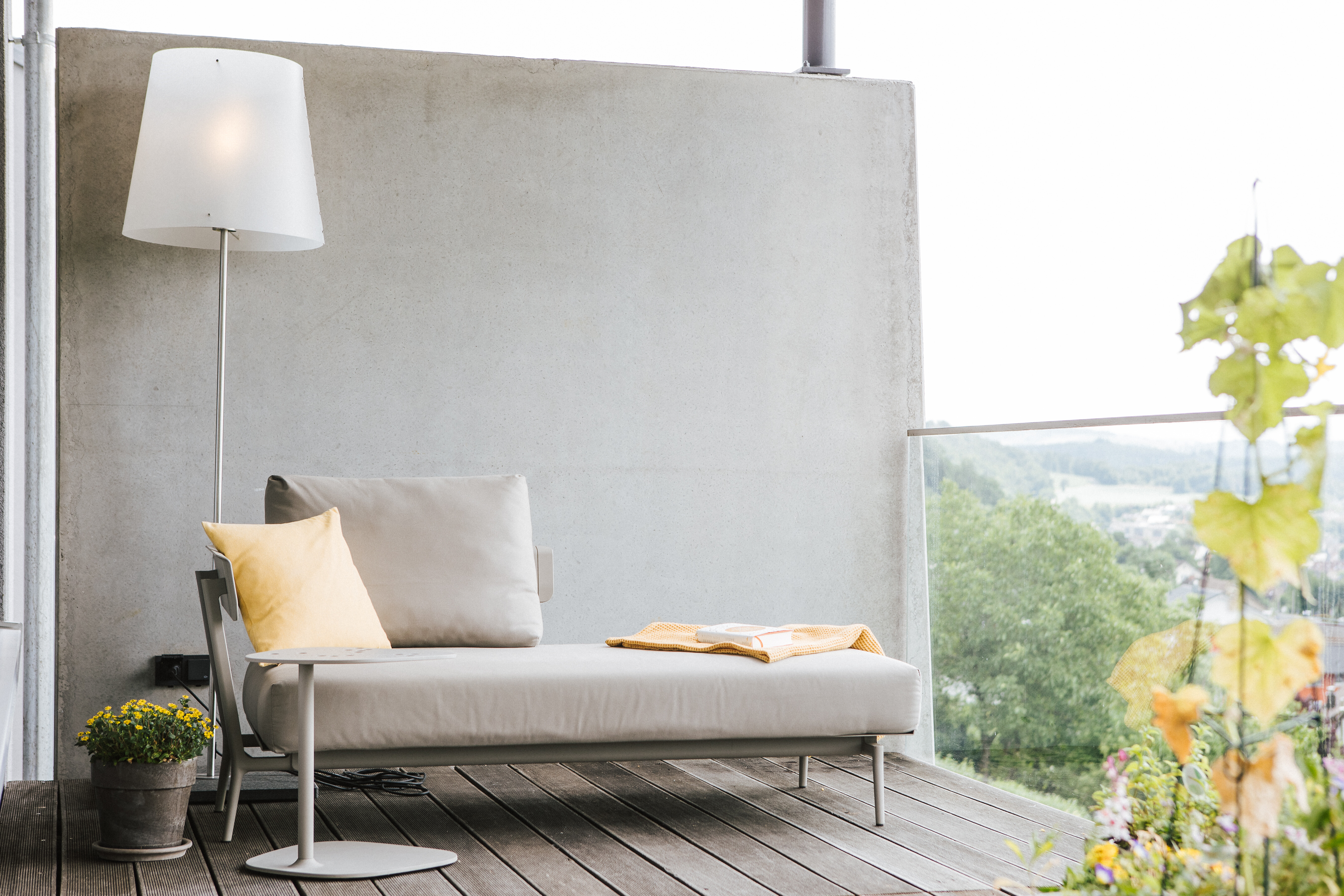 Das kompakte Sofa Aikana von Weishäupl in einem sandigen Ton fügt sich harmonisch in die Umgebung ein – kombiniert mit dem passenden Beistelltisch entsteht eine kleine Ruheoase mit großer Wirkung. Die Costanza Stehleuchte von Luceplan sorgt auch in den Abendstunden für stimmungsvolles Licht. Hier verbinden sich Entspannung und Aussicht – für Momente, die bleiben.