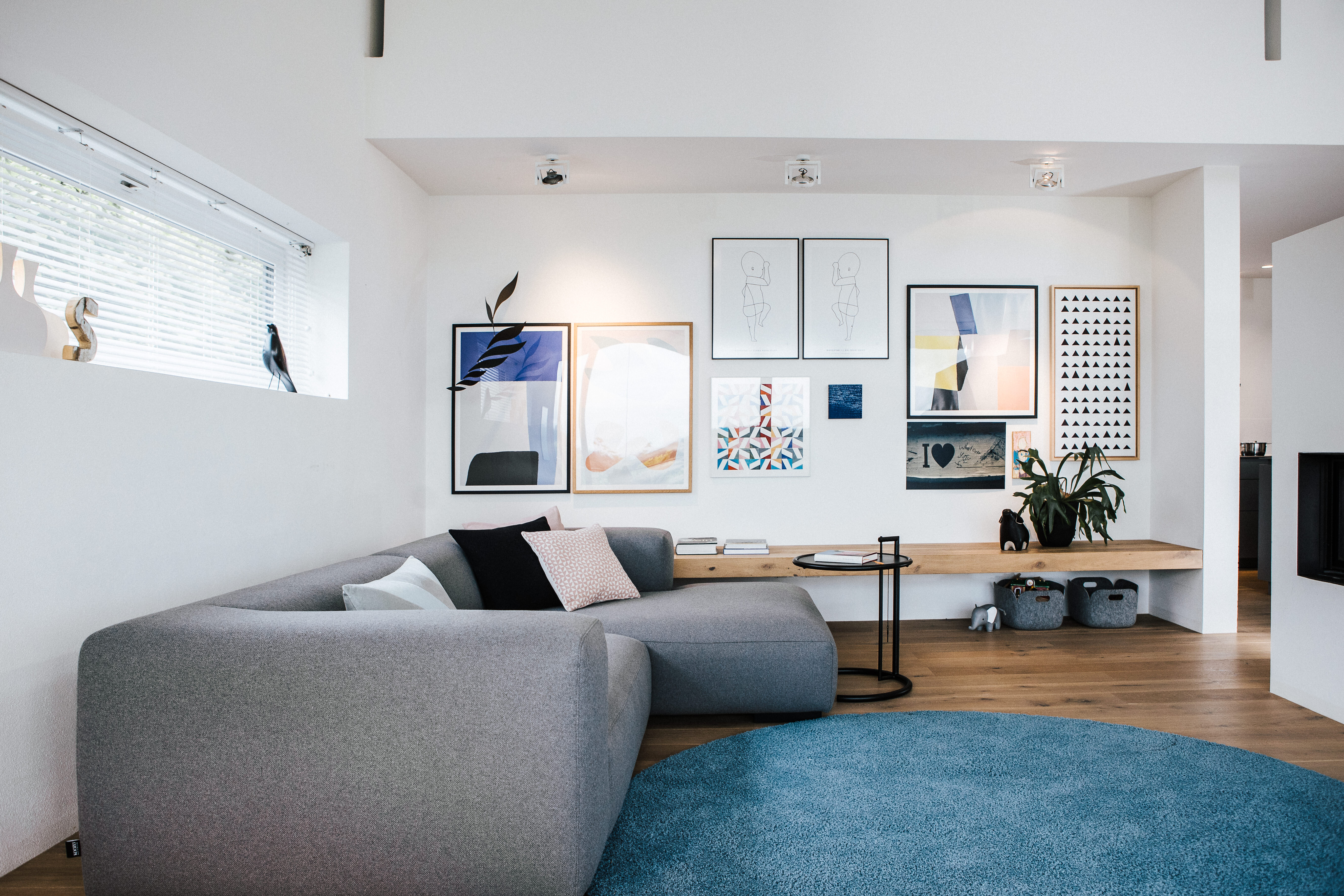 Der Wohnbereich dieses Einrichtungskonzepts überzeugt durch sein fein abgestimmtes Zusammenspiel aus ruhiger Zurückhaltung und gezielten Farbakzenten. Das graue Ecksofa Robin von Koozo bietet großzügige Liegeflächen und lädt zu entspannten Stunden ein – perfekt ergänzt durch den sanft blauen Teppich Ghia von Fulton, der dem Raum visuelle Tiefe und Leichtigkeit verleiht.