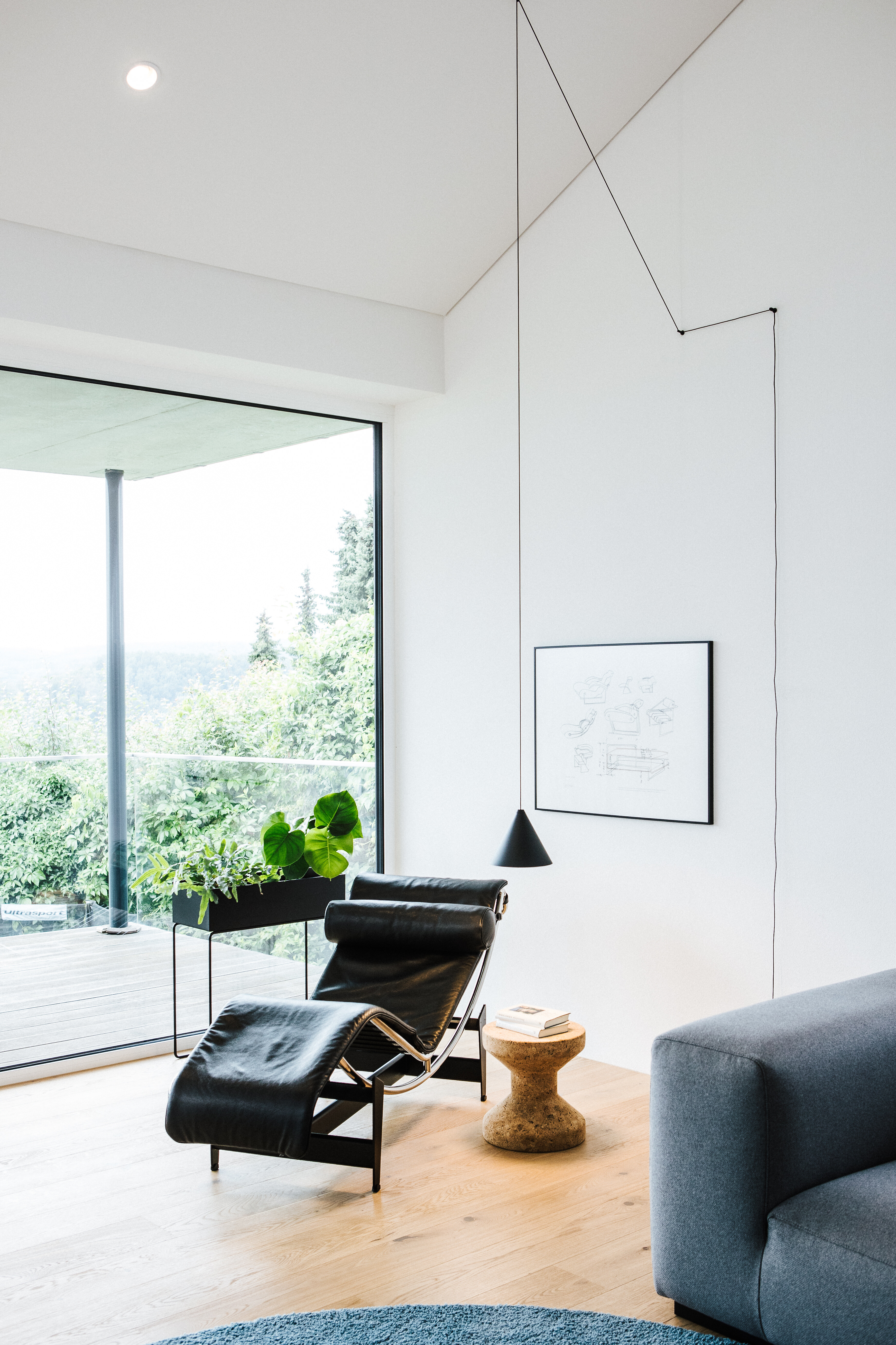 Die filigrane Hängeleuchte String Light von Flos verleiht dem Raum zusätzlich eine grafische Note und strukturiert ihn mit Leichtigkeit. Durch die große Fensterfront bleibt der Wohnbereich lichtdurchflutet und offen – ein Ort, an dem Gestaltung, Komfort und Atmosphäre in ausgewogener Balance zusammenkommen.