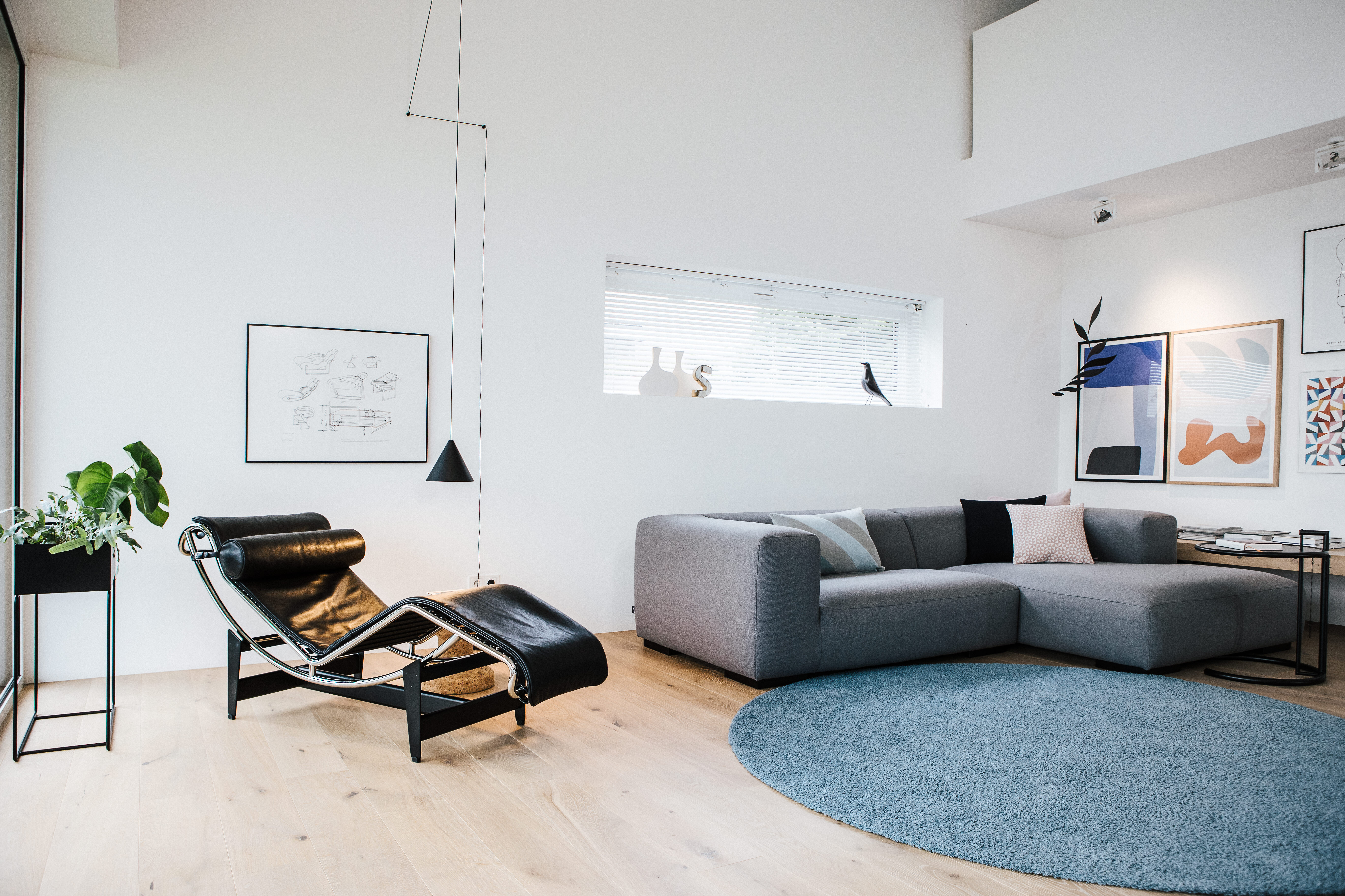 Direkt neben dem Sofa sorgt der ikonische Adjustable Table von ClassiCon – entworfen von Eileen Gray – mit seiner markanten Silhouette für stilvolle Funktionalität. Eine farblich kuratierte Bilderwand mit Nuancen in Blau, Gelb und Orange setzt einen lebendigen Akzent und gibt dem Raum eine persönliche Note. Auch die berühmte LC4 Liege von Cassina, entworfen von Le Corbusier, bringt als ikonisches Designobjekt Ausdrucksstärke ins Spiel.