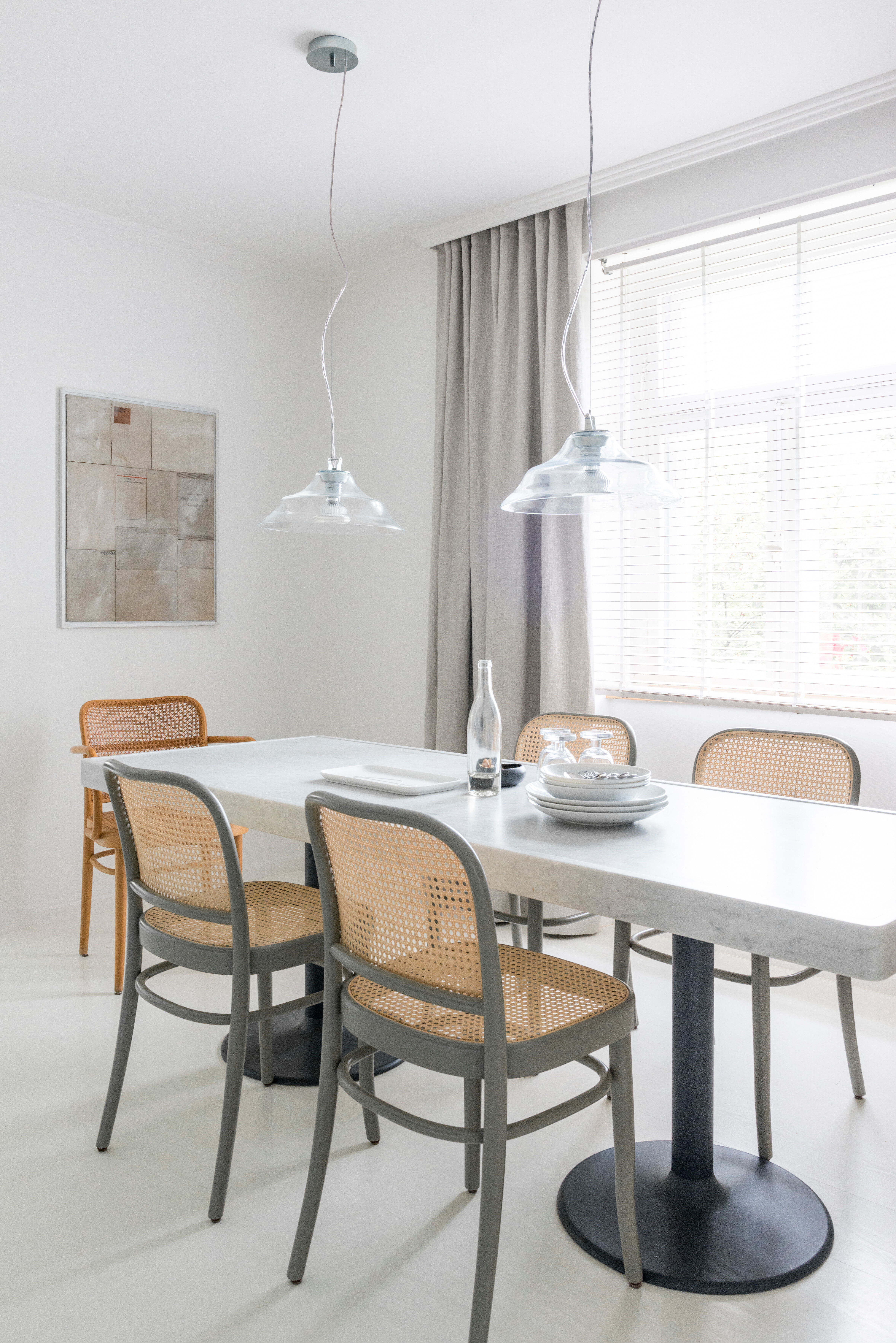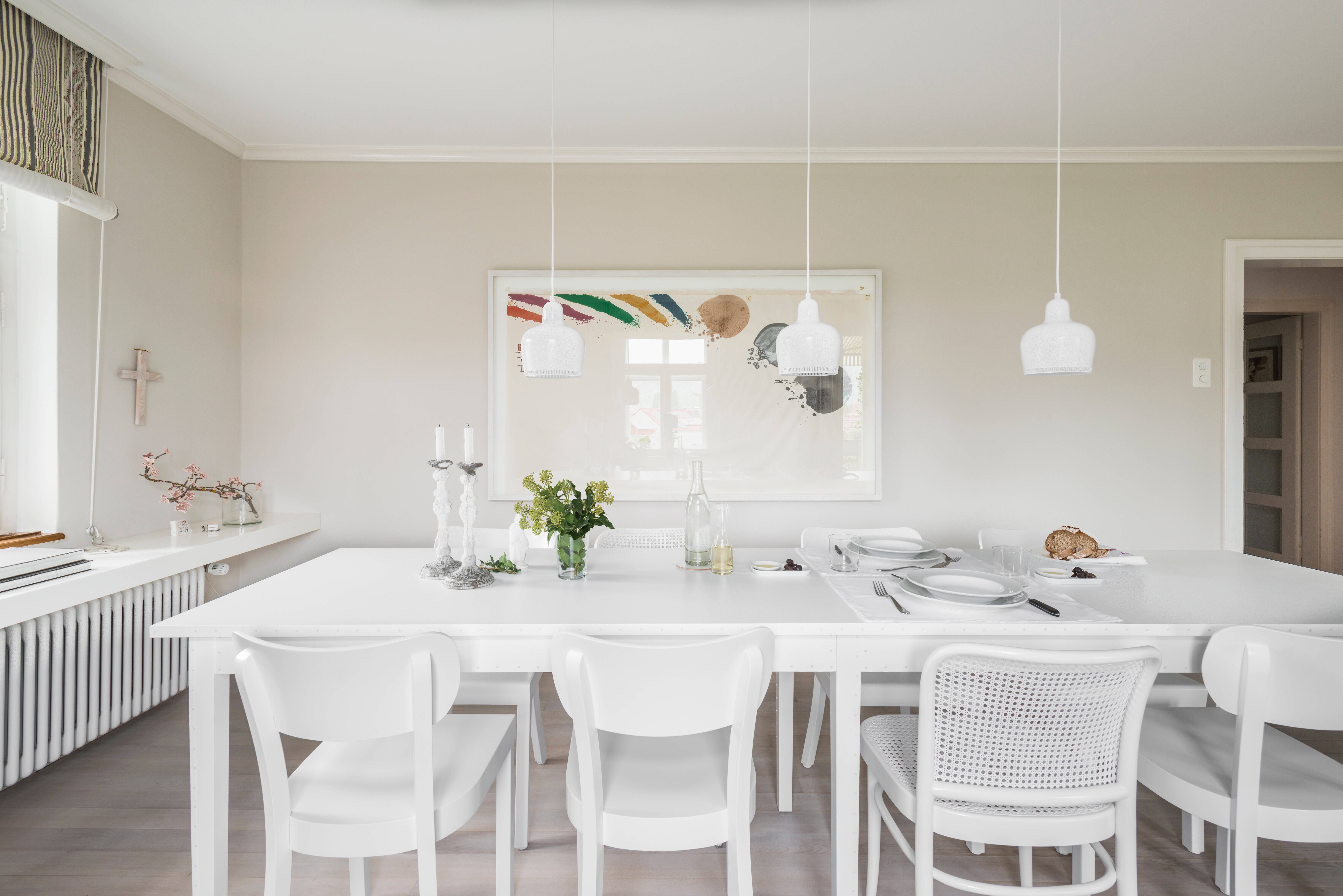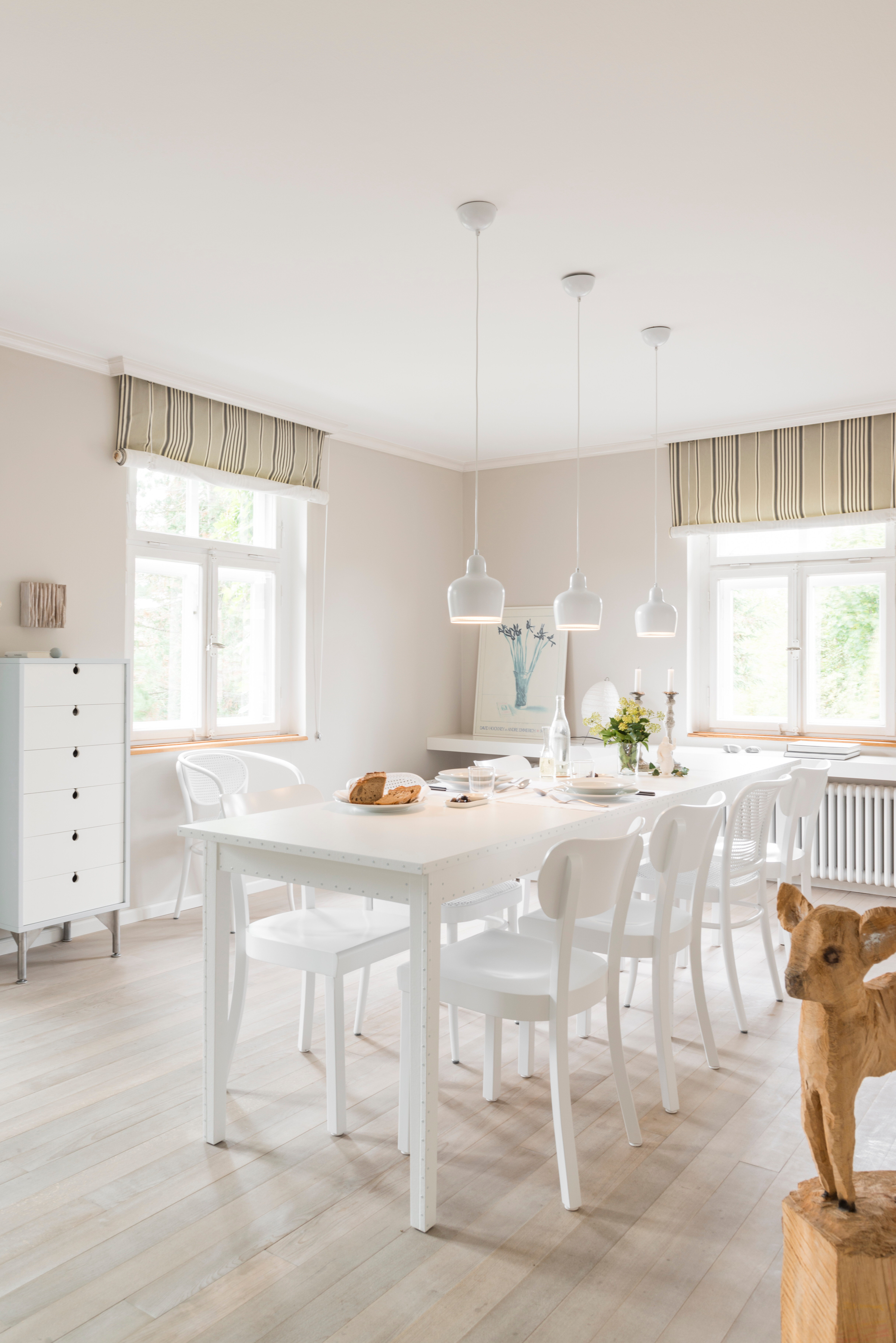 Der große Essbereich bildet mit seiner in Weiß gehaltenen Gestaltung das lichtdurchflutete Zentrum des Hauses. Ein langer weißer Esstisch wird von einer fein abgestimmten Kombination aus Frankfurter Küchenstühlen von Magazin und N.811 Stühlen von Thonet begleitet – beide in reinem Weiß gehalten. Drei Hängeleuchten Golden Bell von Vitra runden das Ensemble ab und setzen mit ihrem skandinavisch inspirierten Design elegante Akzente. Die klare Linienführung und das durchgängige Farbkonzept schaffen eine Atmosphäre von Leichtigkeit und Ruhe – ideal für gesellige Runden in stilvollem Ambiente.