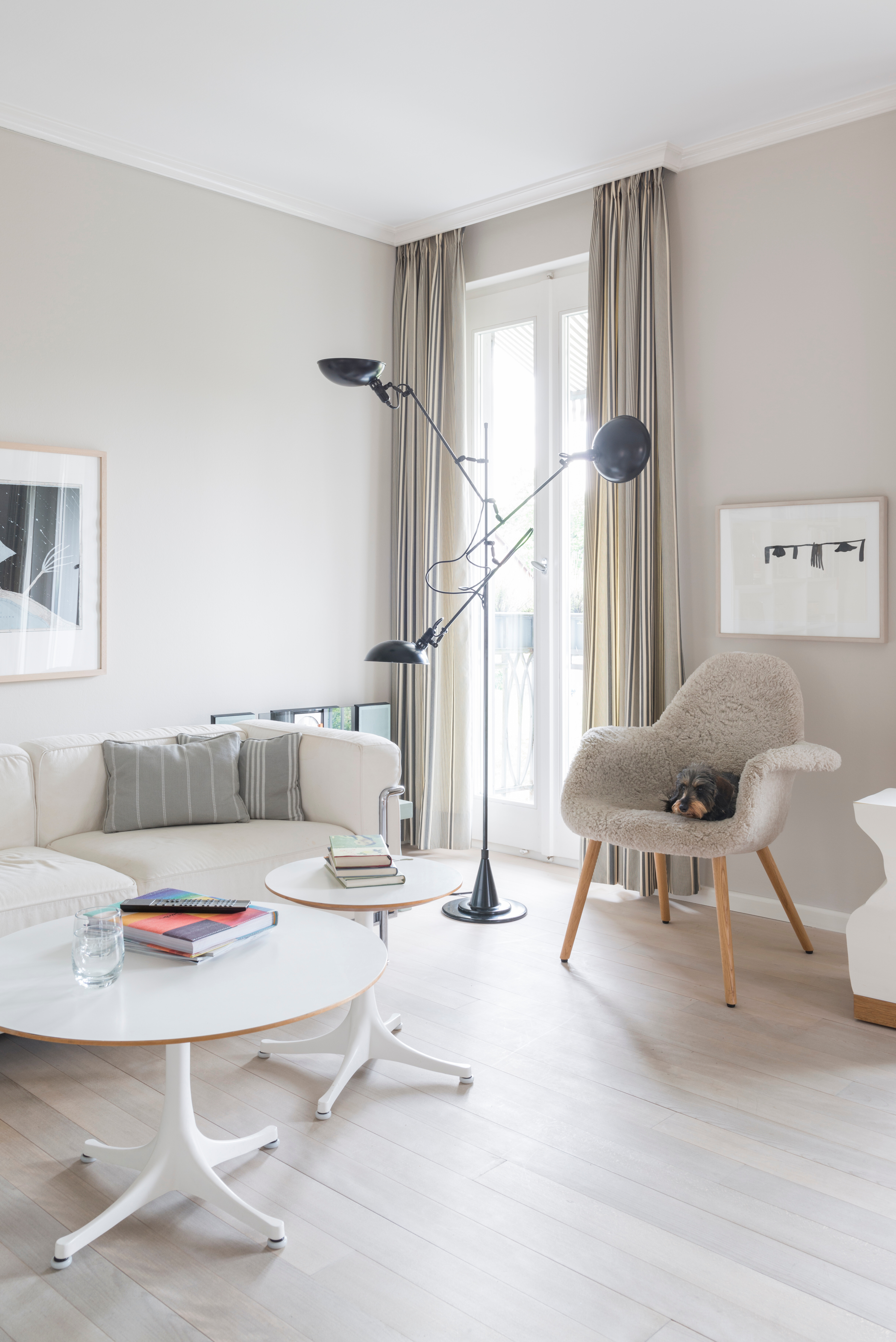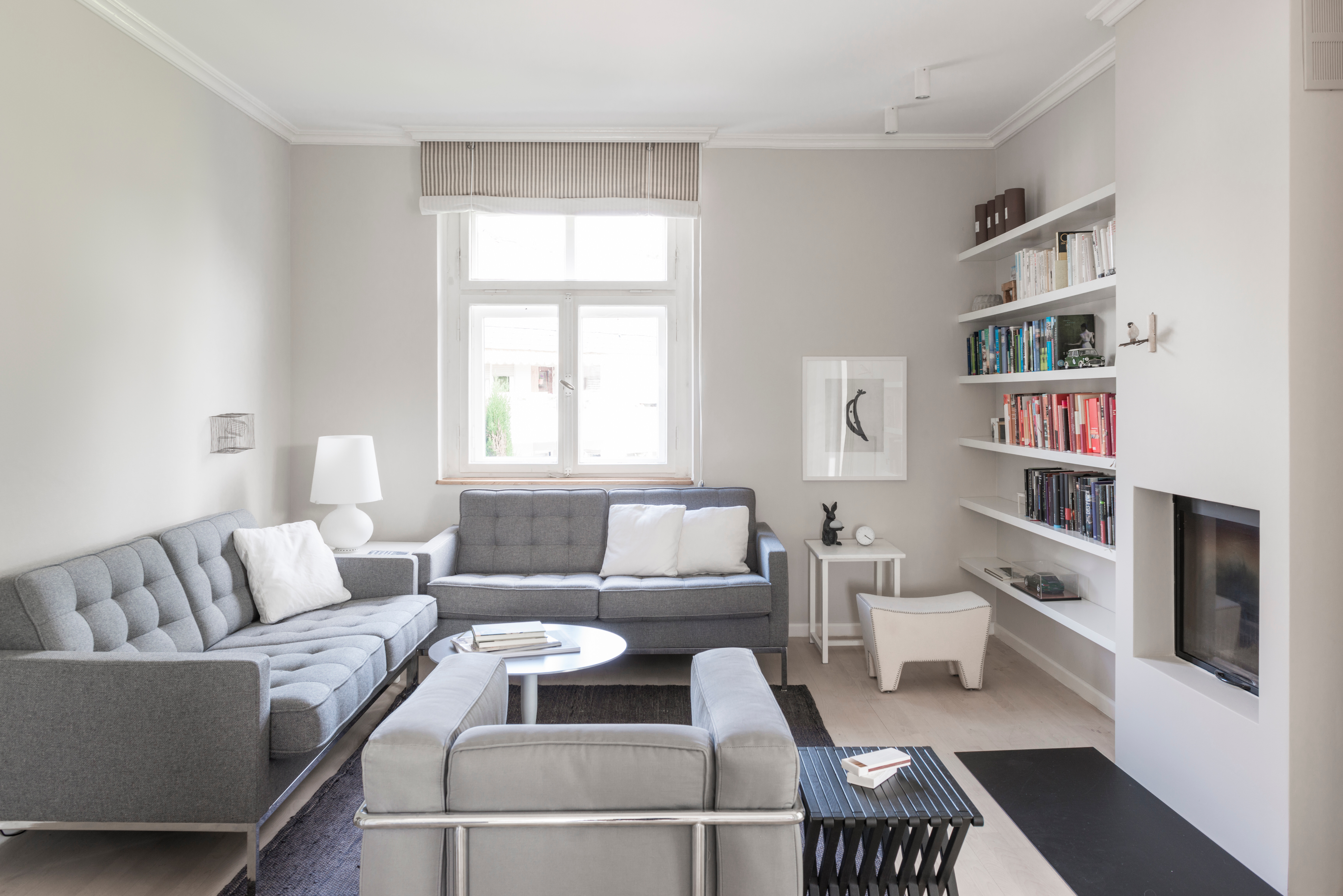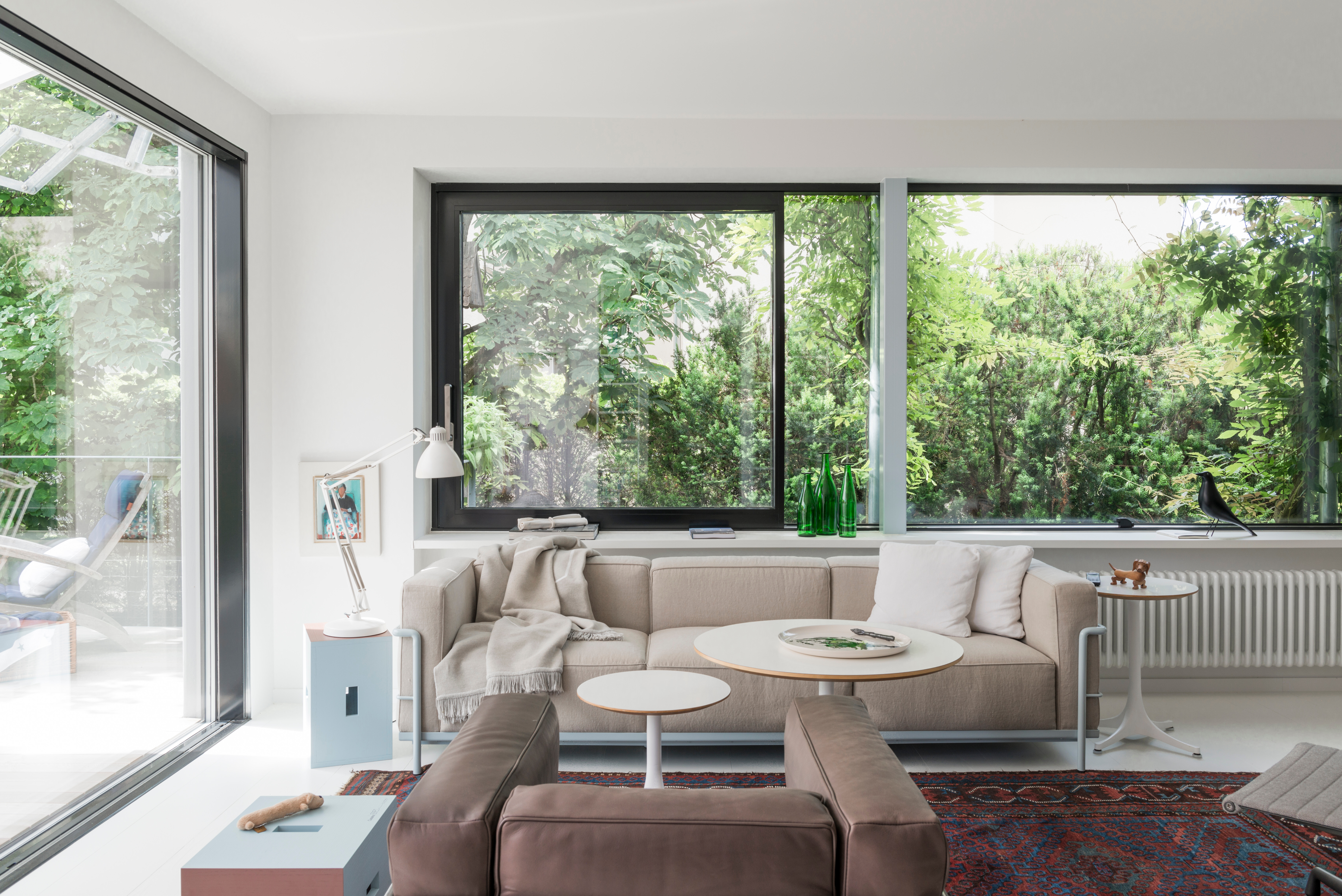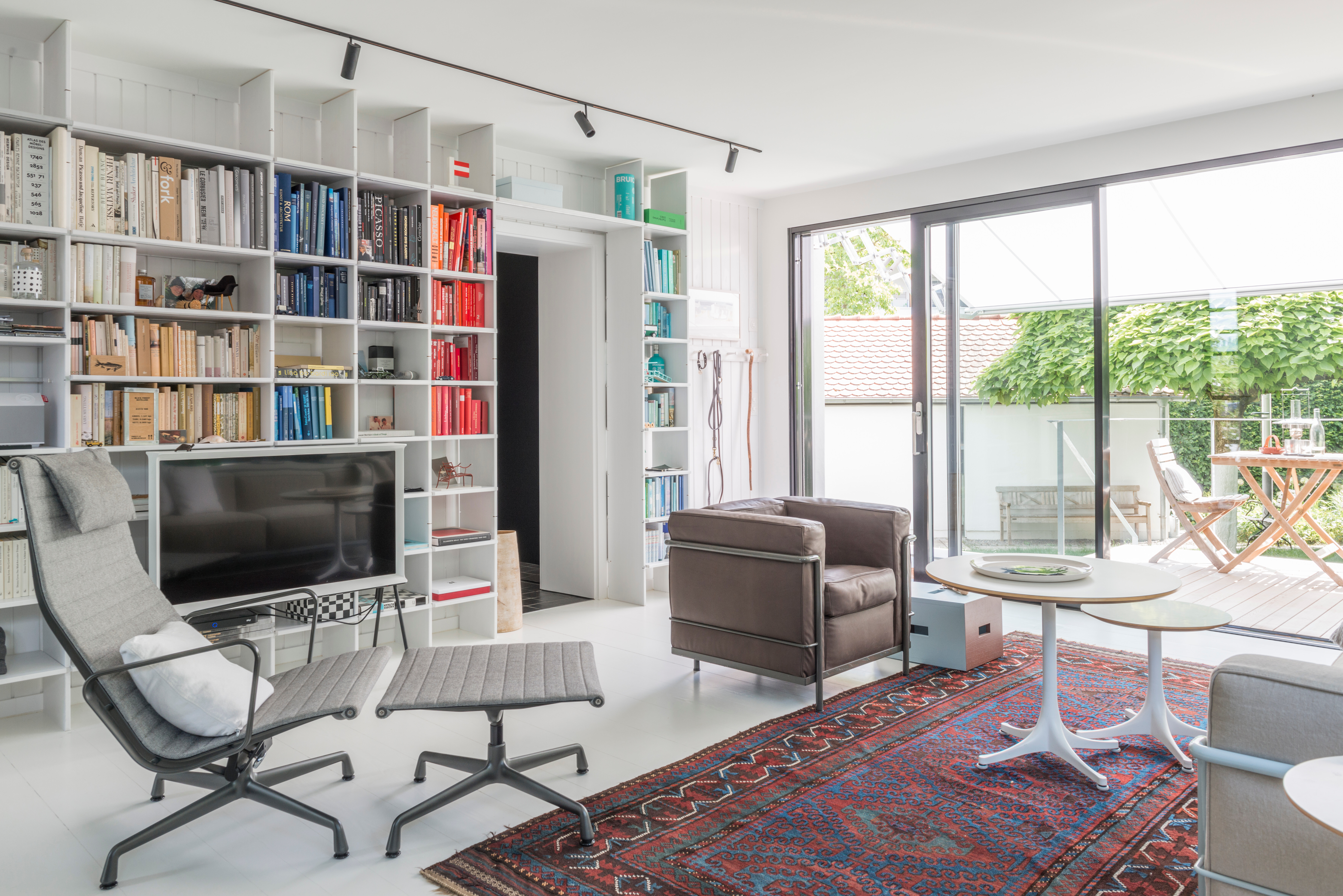 Im Zentrum des lichtdurchfluteten Wohnbereichs stehen das Sofa LC3 und der passende LC2-Sessel von Cassina, entworfen von Le Corbusier – beide in sanften Erdtönen gehalten. Ihre kubische, zurückhaltende Formensprache wird durch drei Nelson Couchtische von Vitra ergänzt, die sich mit ihren unterschiedlichen Höhen und Größen harmonisch in die Raumsituation einfügen. Eine farblich sortierte Bücherwand sorgt für grafische Struktur und verleiht dem Raum eine persönliche Note. Die großen Fensterfronten und der direkte Zugang zur Terrasse schaffen fließende Übergänge und lassen viel Tageslicht herein – ein Wohnraum, der Ruhe, Offenheit und stilvolle Behaglichkeit vereint.