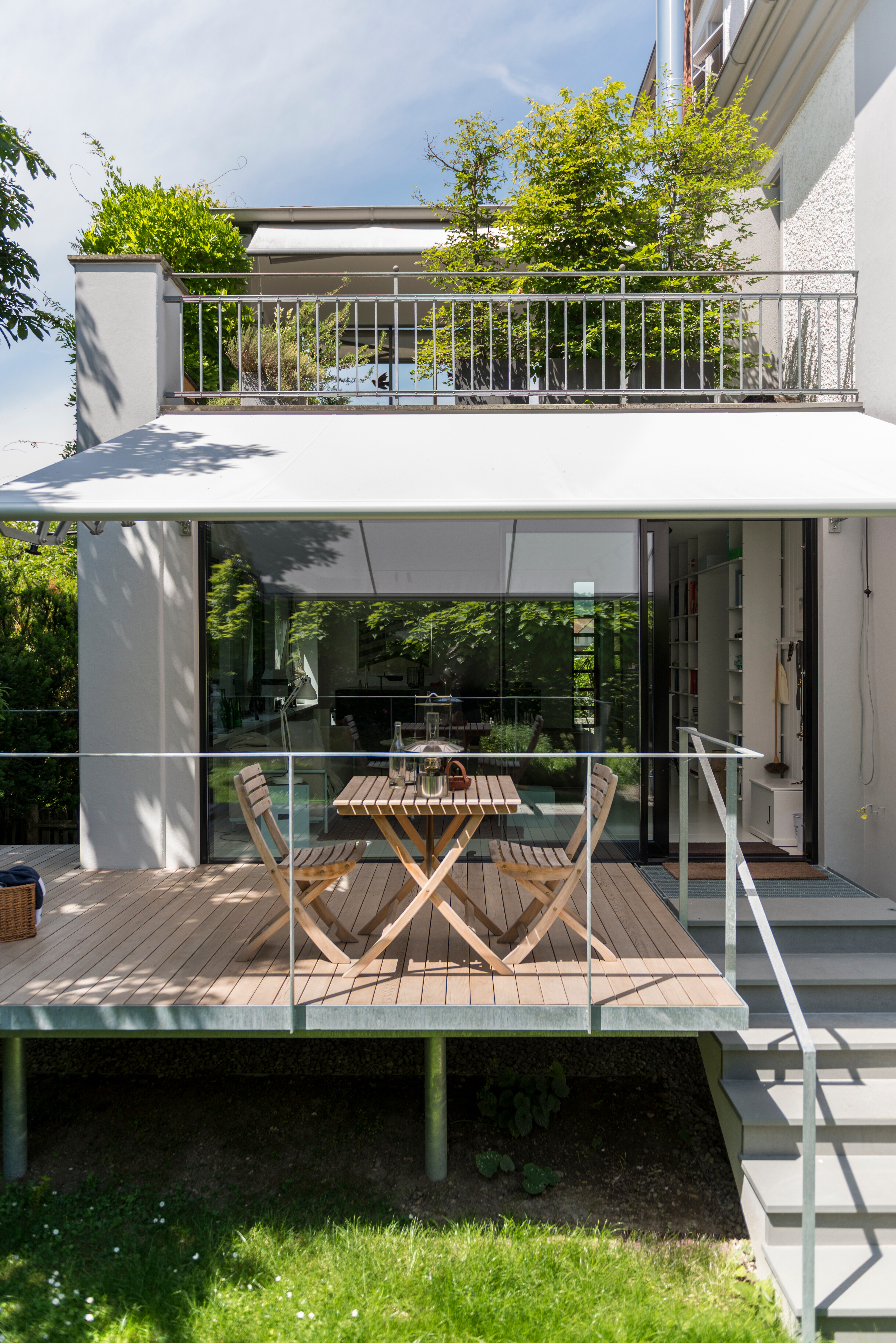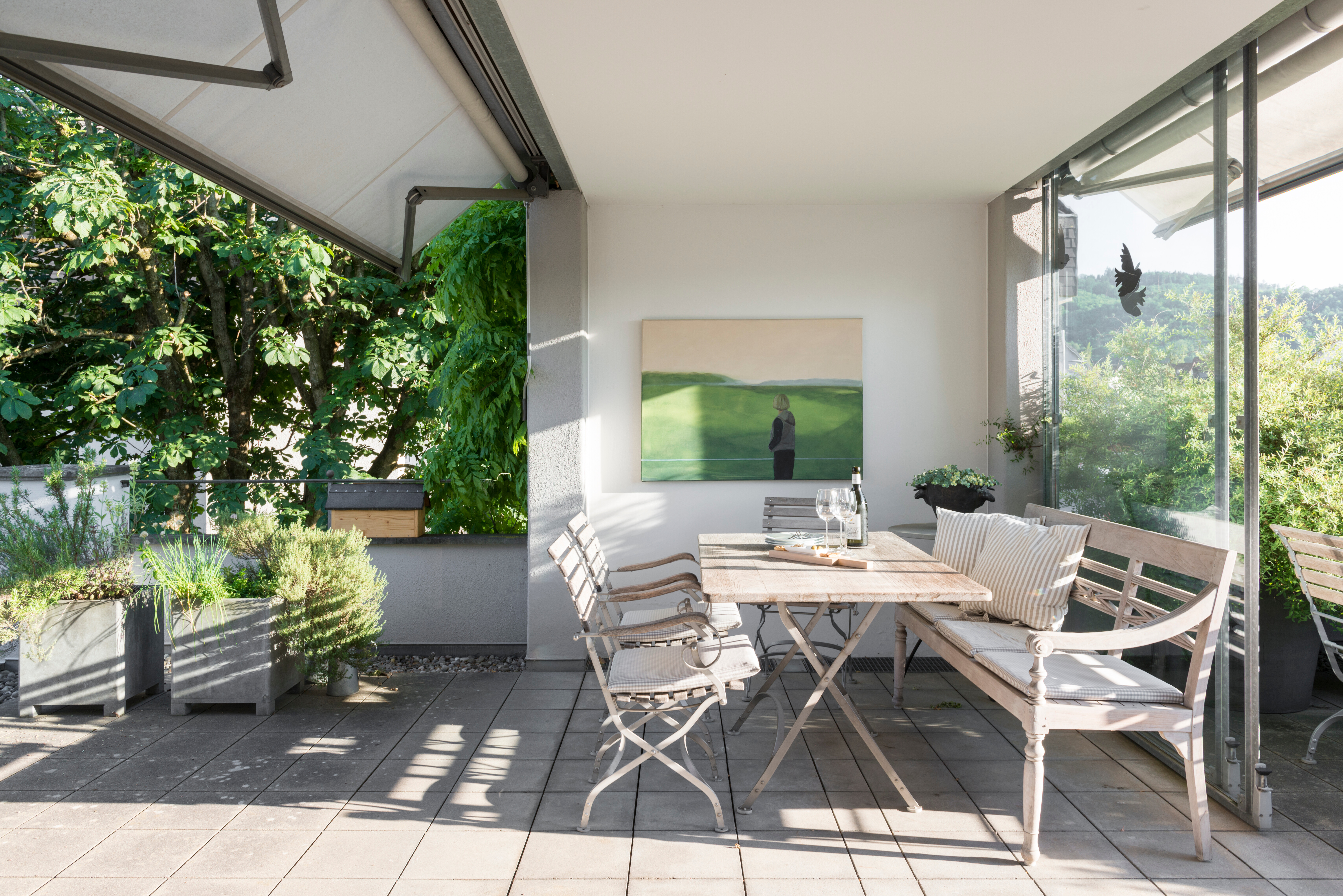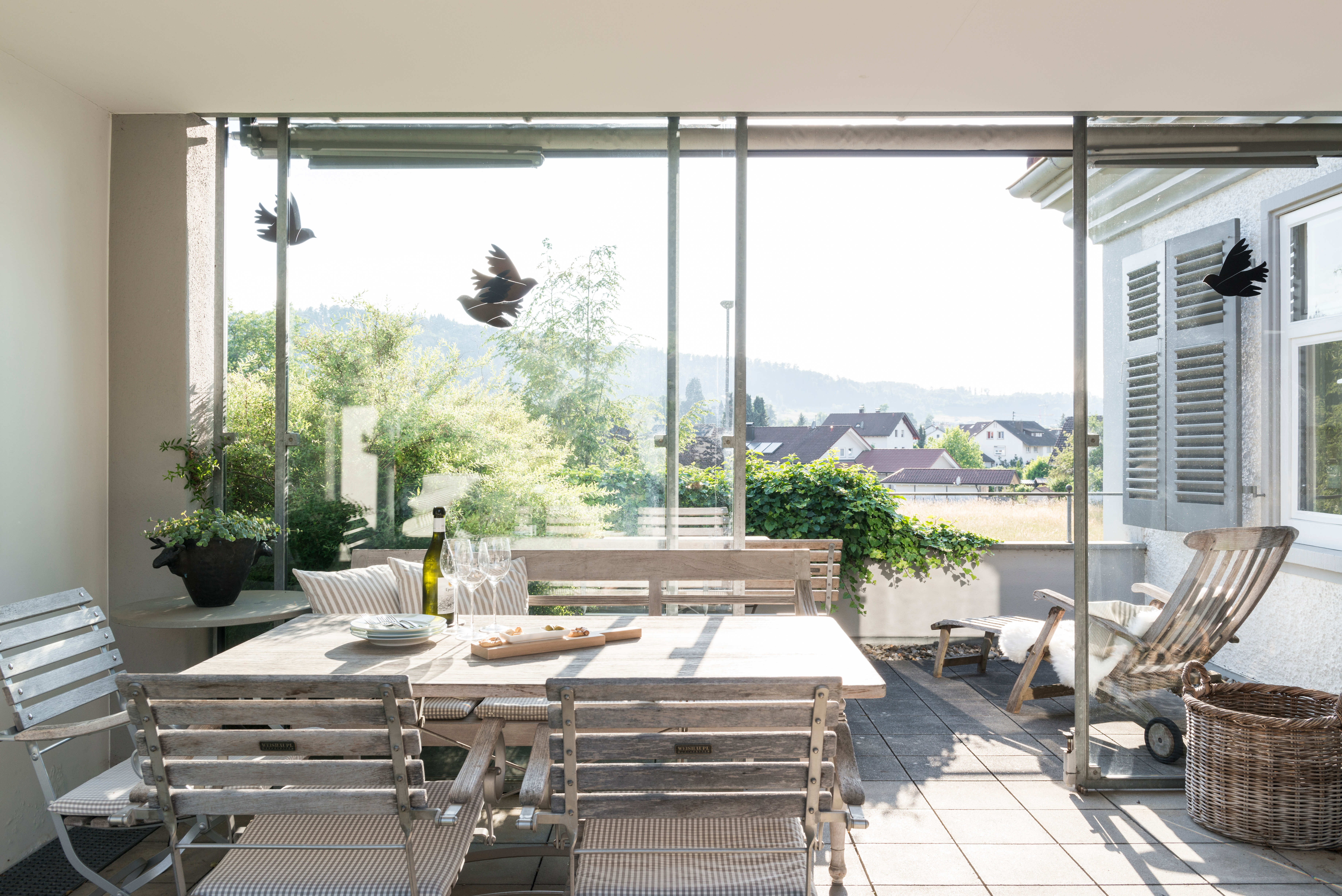 Für entspannte Stunden sorgt der Deckstuhl Steamer von Skagerak, während die Bank Classic von Weishäupl ein weiterer ruhiger Rückzugsort im Grünen ist. Auf der unteren Terrasse setzt sich das Konzept fort: Hier bilden der Tisch Selandia und die dazu passenden Klappstühle Vendia – ebenfalls von Skagerak – einen luftig-leichten Ort für ruhige Momente oder spontane Begegnungen.