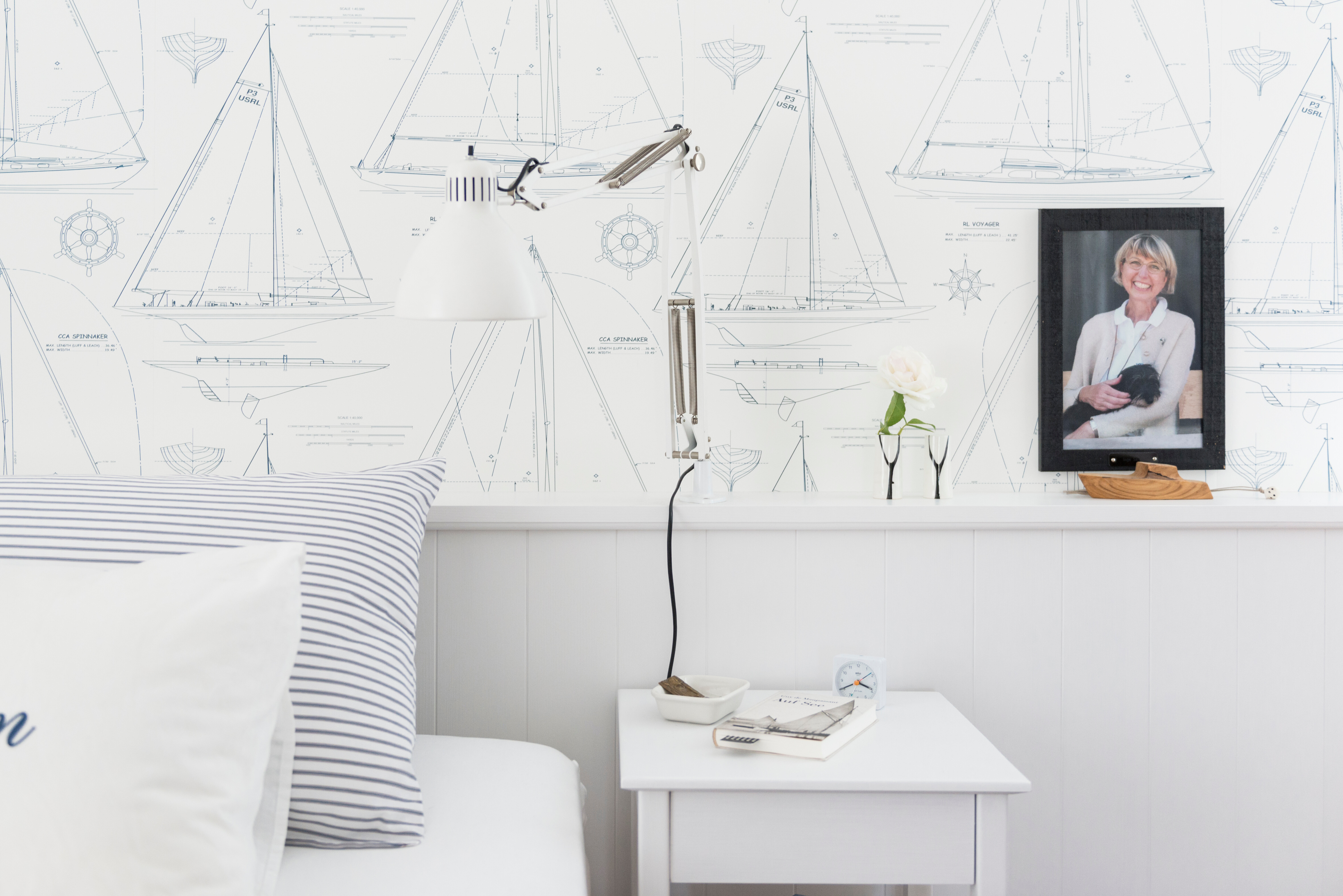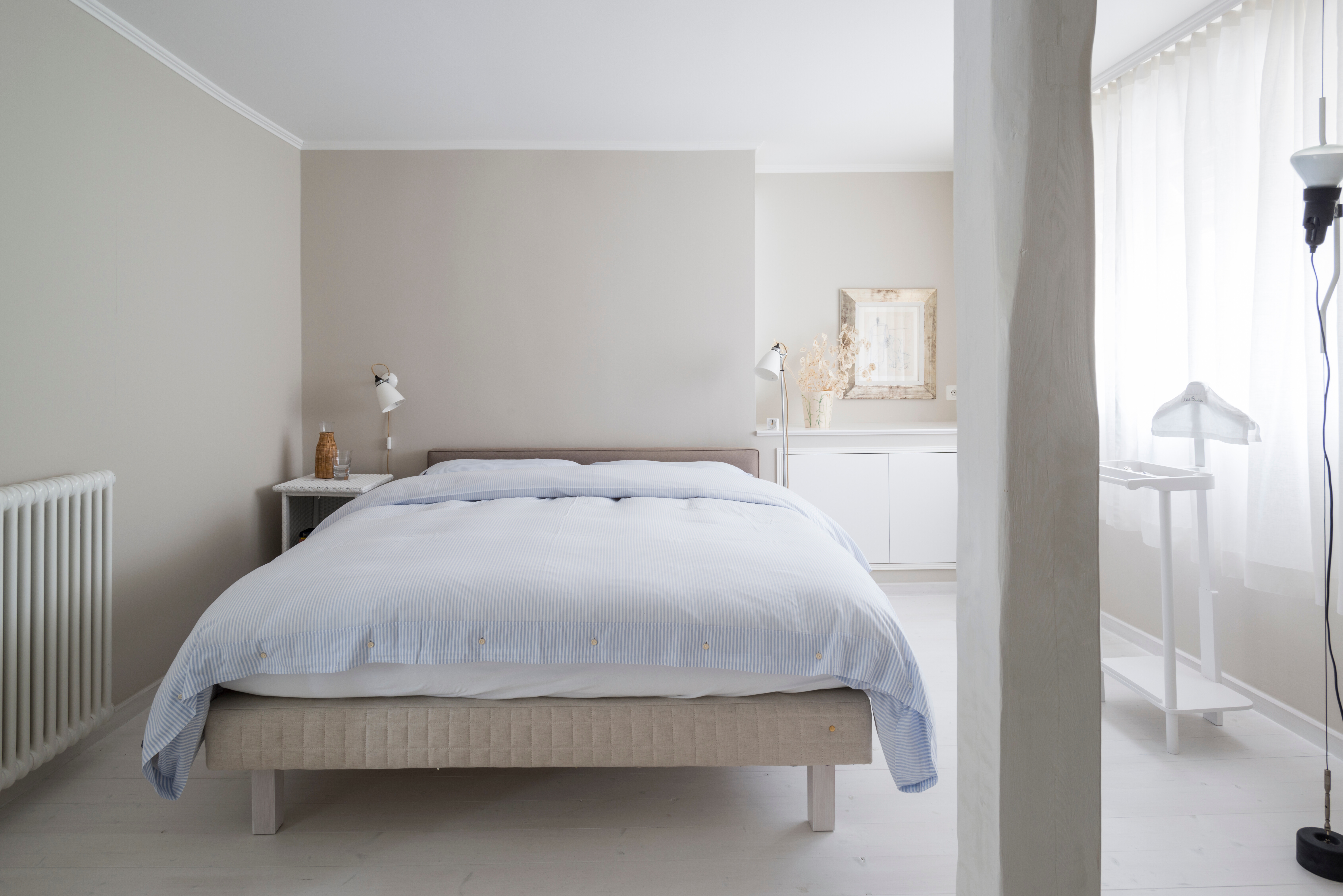 Der Schlafbereich dieser Altbauvilla überzeugt durch seine sanfte Farbwelt aus Beige- und Hellblautönen, die in Kombination mit weißen Möbeln ein ruhiges, maritim inspiriertes Ambiente schaffen. Textilien, Tapeten und Wandfarben greifen das Farbspiel gekonnt auf und sorgen für eine Atmosphäre von Leichtigkeit und Geborgenheit. Das Zusammenspiel aus Struktur und Zurückhaltung vermittelt das Gefühl von Weite und Gelassenheit – ideal für einen Ort der Ruhe.
