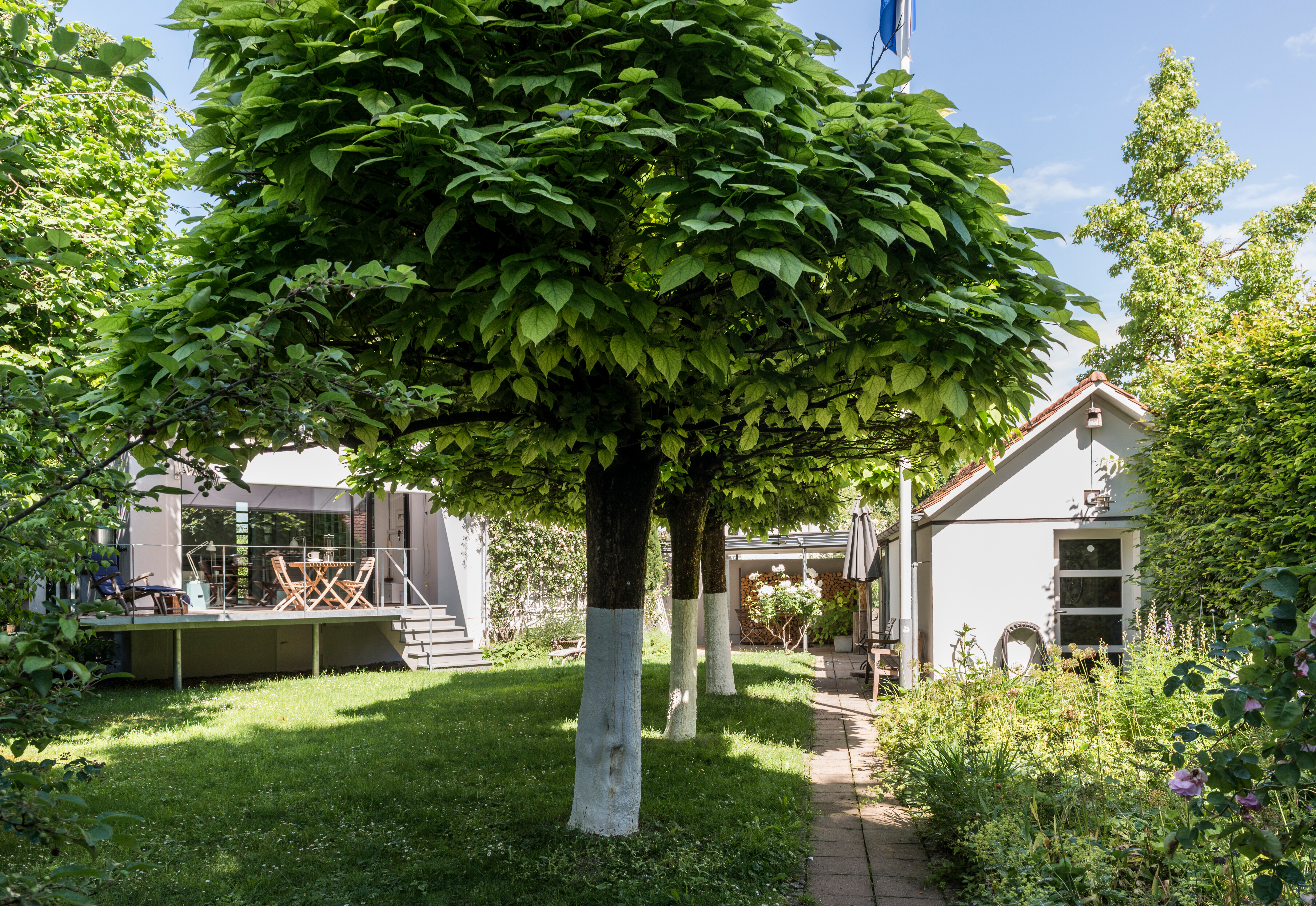 Rund um die Villa entfalten sich mehrere liebevoll gestaltete Terrassenbereiche, die den Außenraum nahtlos in das Wohnkonzept integrieren. Auf der großzügigen Hauptterrasse lädt ein harmonisch arrangierter Essplatz mit Bank und Stühlen zum ausgedehnten Verweilen unter freiem Himmel ein. Die Kombination aus natürlichen Materialien und sanften Farben fügt sich stimmig in das grüne Umfeld ein und schafft ein mediterran anmutendes Ambiente – voller Ruhe und Leichtigkeit.