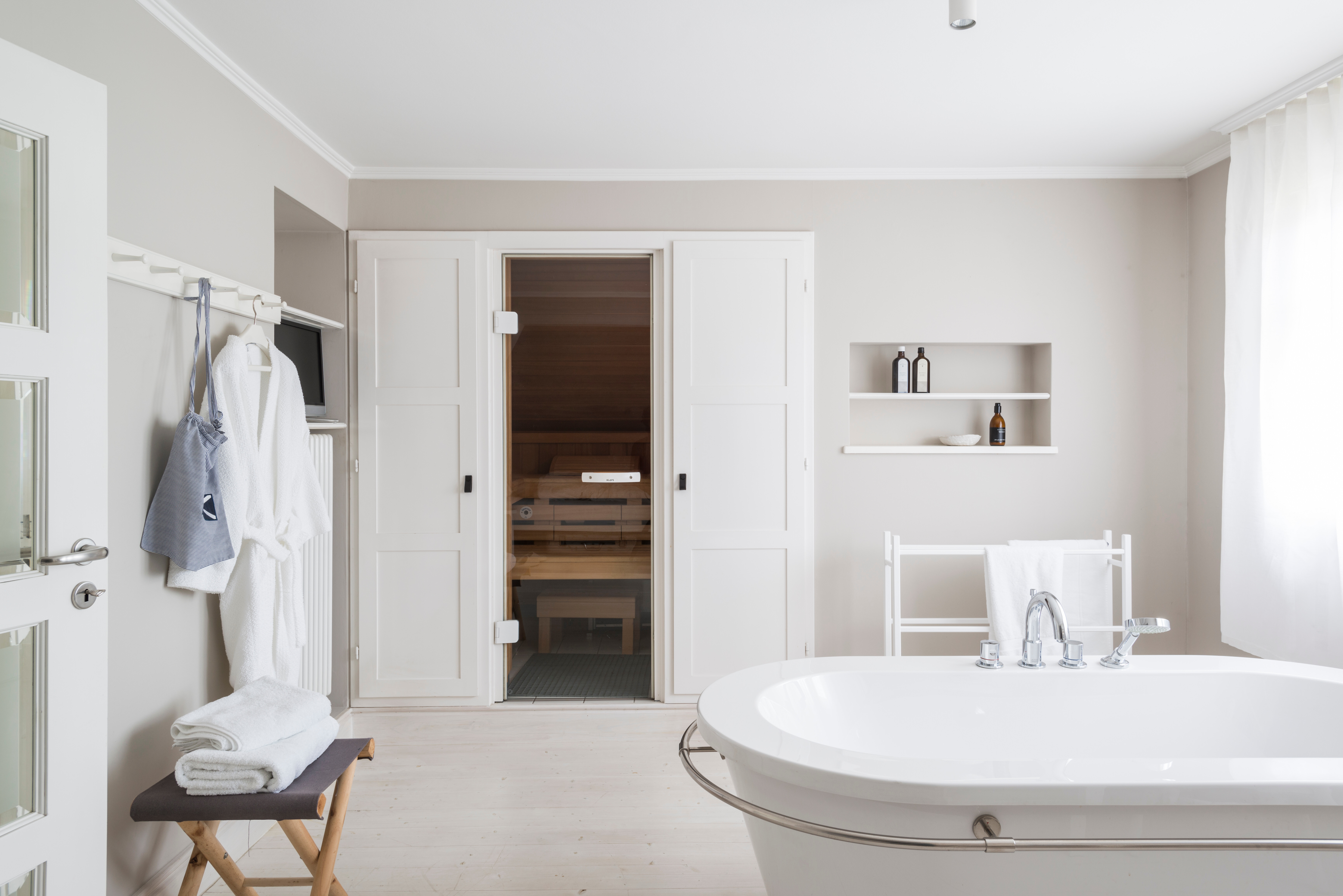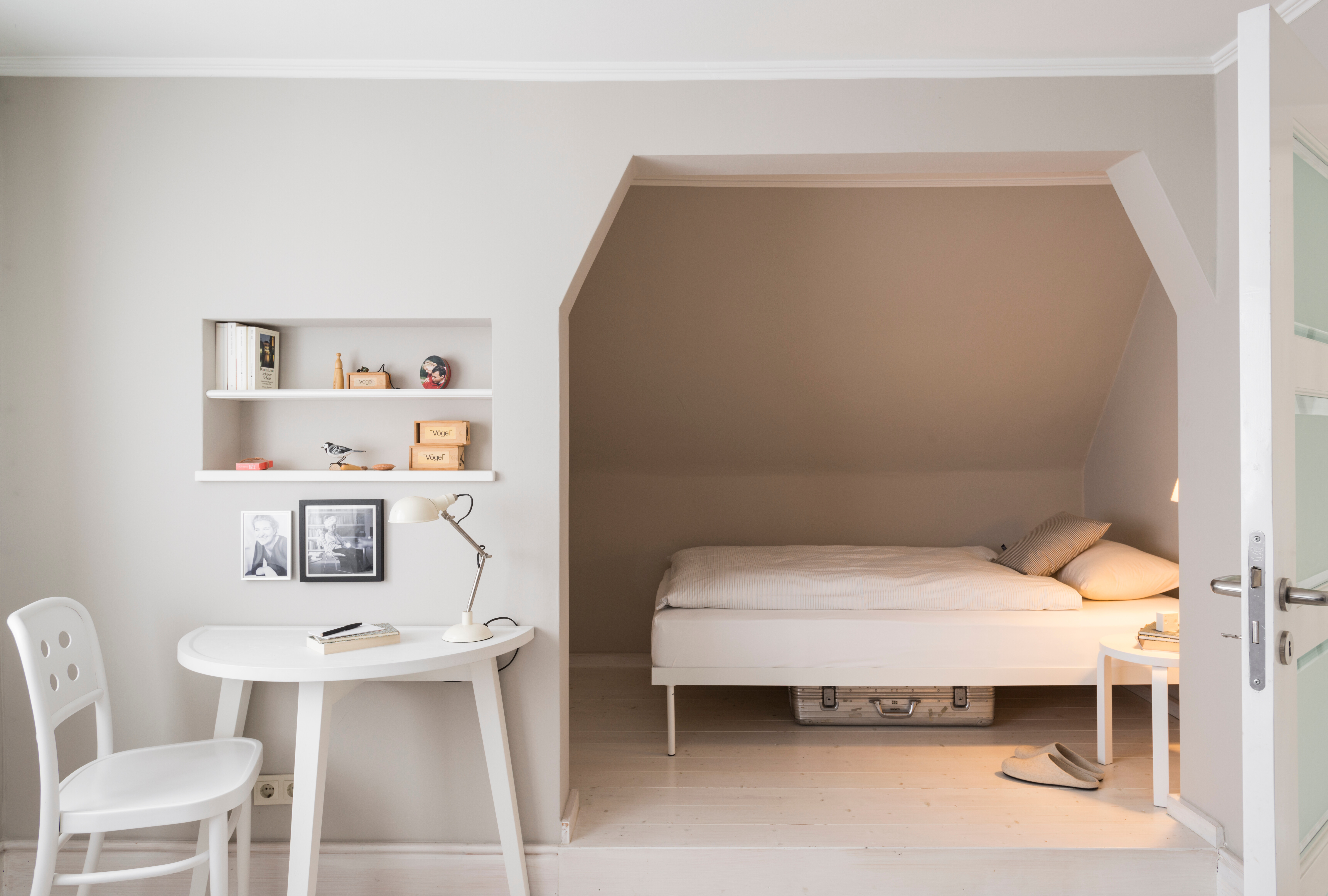 Im angrenzenden Gästezimmer ist das Bett GB1085 von Habit dezent in eine Nische integriert. Diese architektonische Lösung verstärkt die wohnliche Geborgenheit des Raumes und nutzt die Fläche optimal. Leichte Wand- und Tischleuchten in dezenten Weißtönen unterstützen das fein abgestimmte Farbkonzept. Direkt anschließend ergänzt ein stilvoll gestaltetes Badezimmer mit klassischer Badewanne in Weiß das Ensemble – charmant, klar und mit einem Hauch Nostalgie.