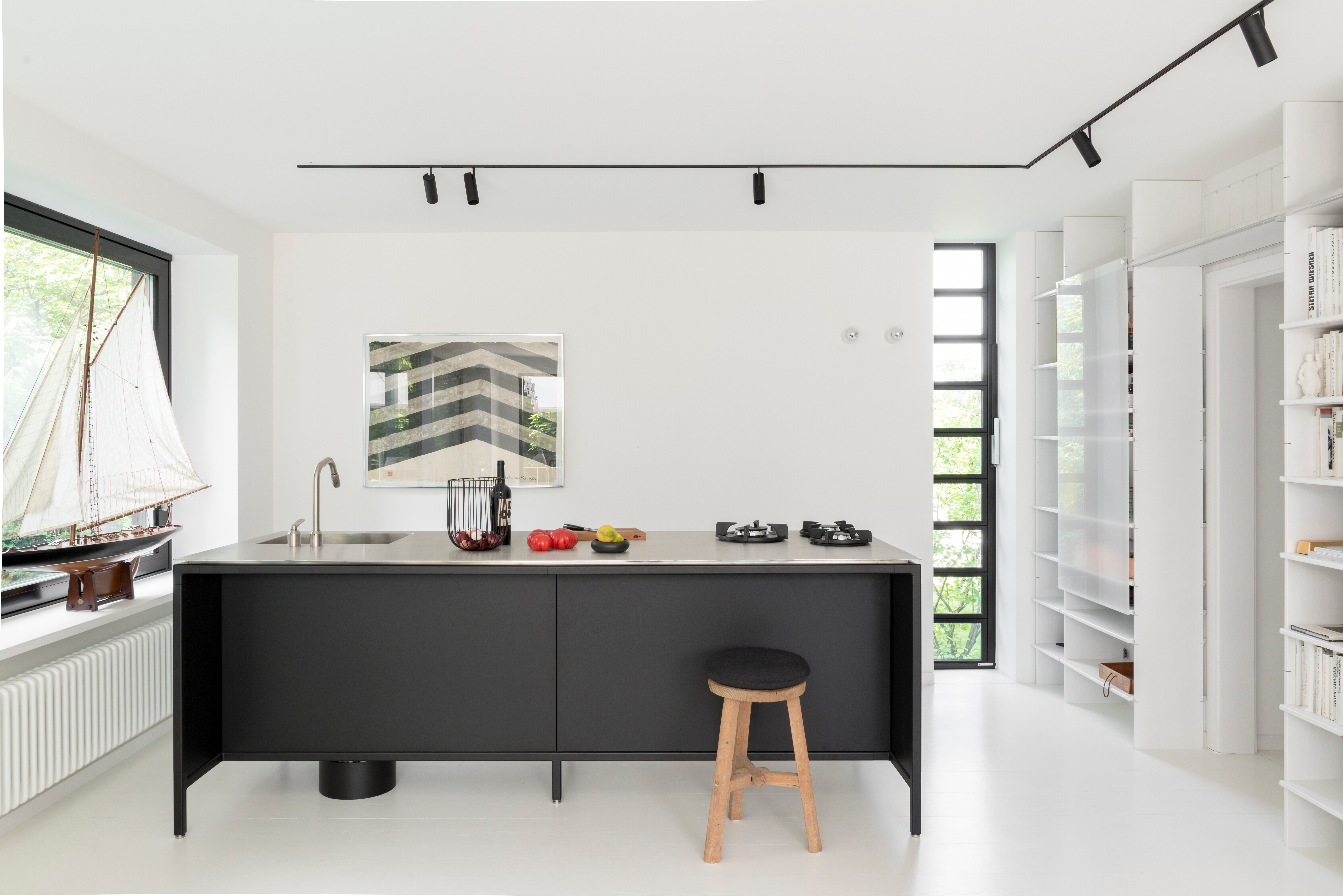 Angrenzend daran öffnet sich ein zweiter, intimerer Essplatz mit direkter Verbindung zur Küche. Hier sorgen sanfte Grau- und Brauntöne für wohnliche Tiefe. Im Zentrum steht der Esstisch LC11 von Cassina mit einem markanten schwarzen Gestell und edler weißer Marmorplatte – ein Statement zwischen Modernität und klassischer Eleganz. Dazu kombiniert: N.811 Stühle von Thonet in abgestuften, zurückhaltenden Farbtönen. Die Küche selbst ist funktional gehalten und fügt sich mit einem schwarzen Inselmodul von Vipp mit heller Steinplatte dezent in das gestalterische Gesamtkonzept ein.