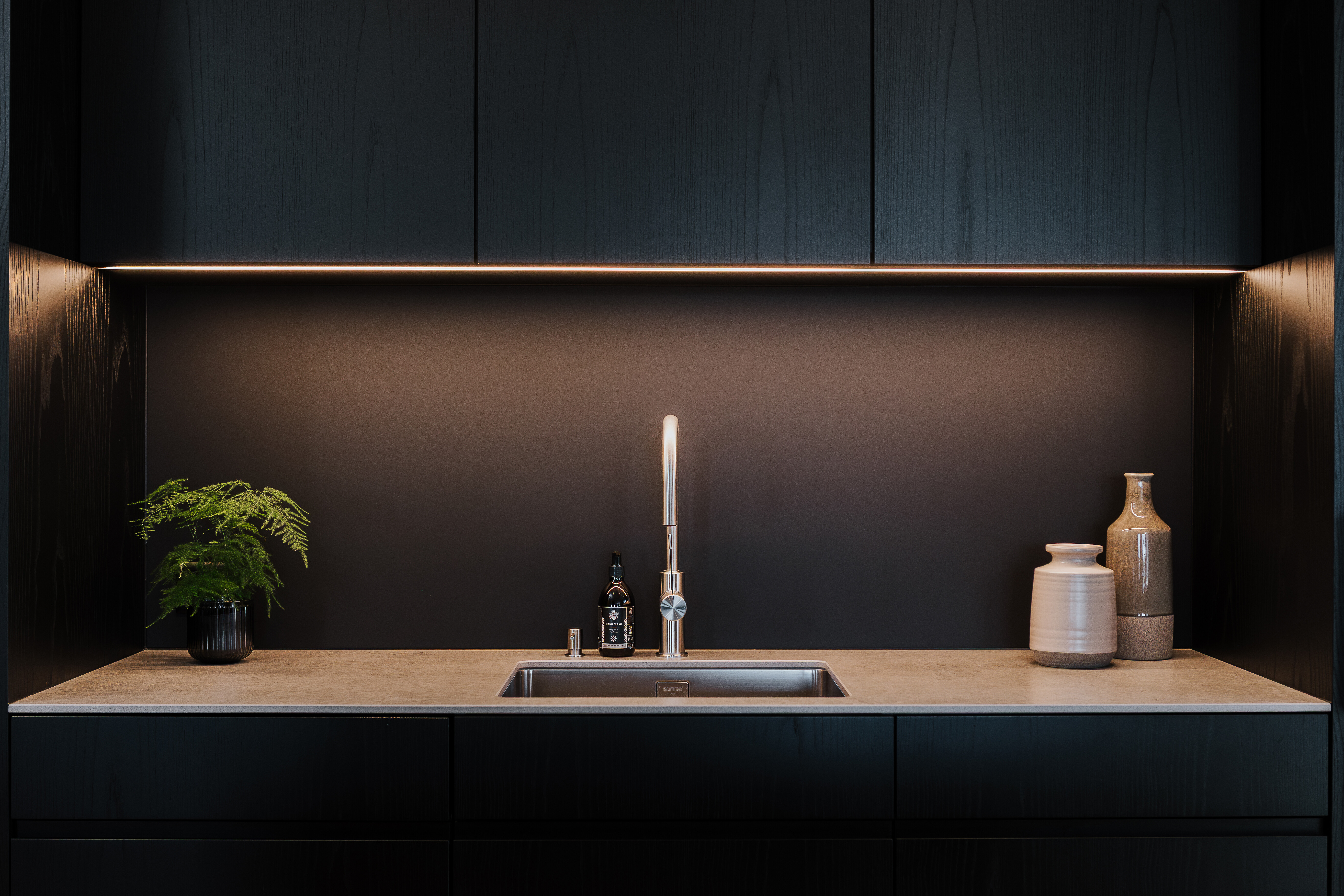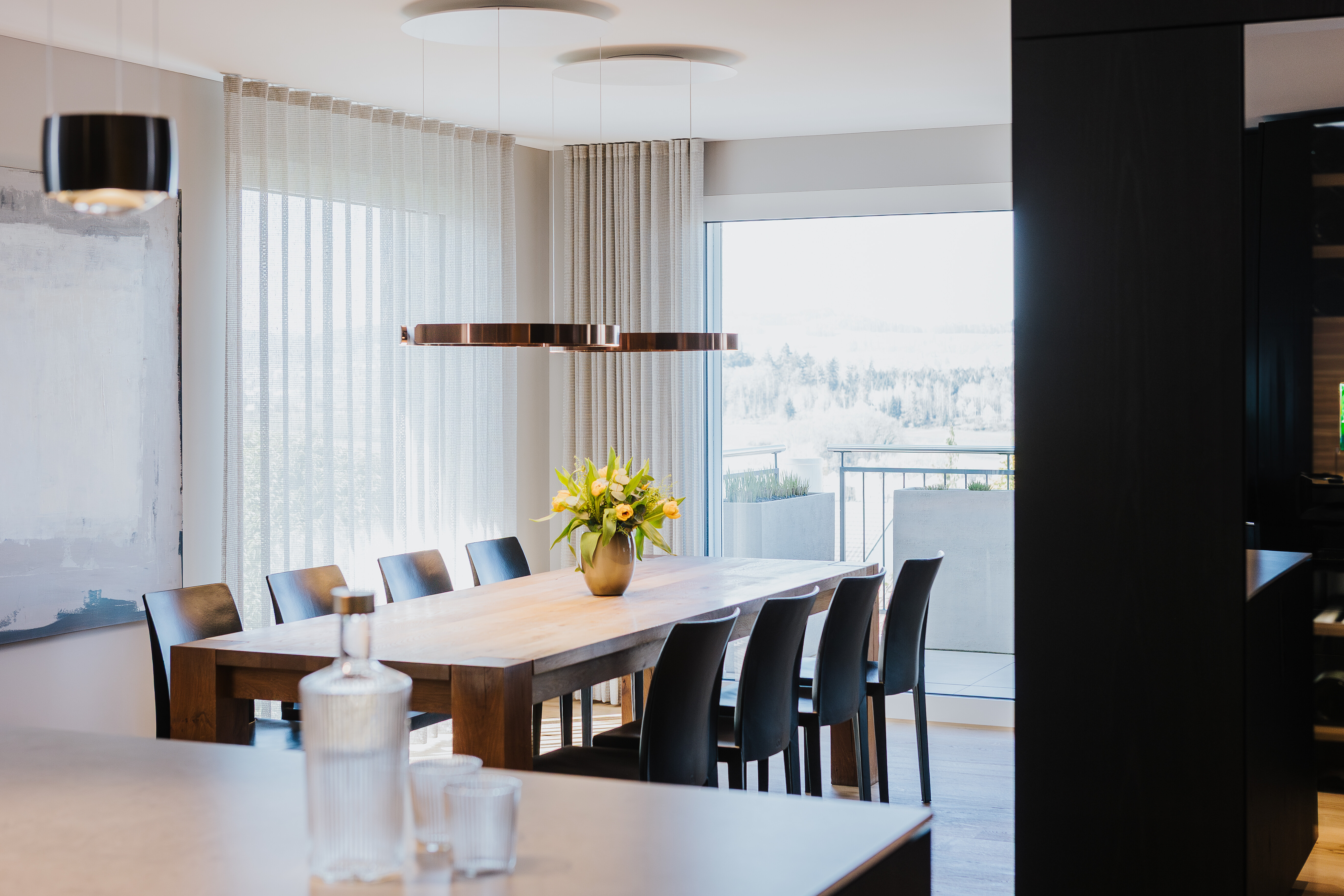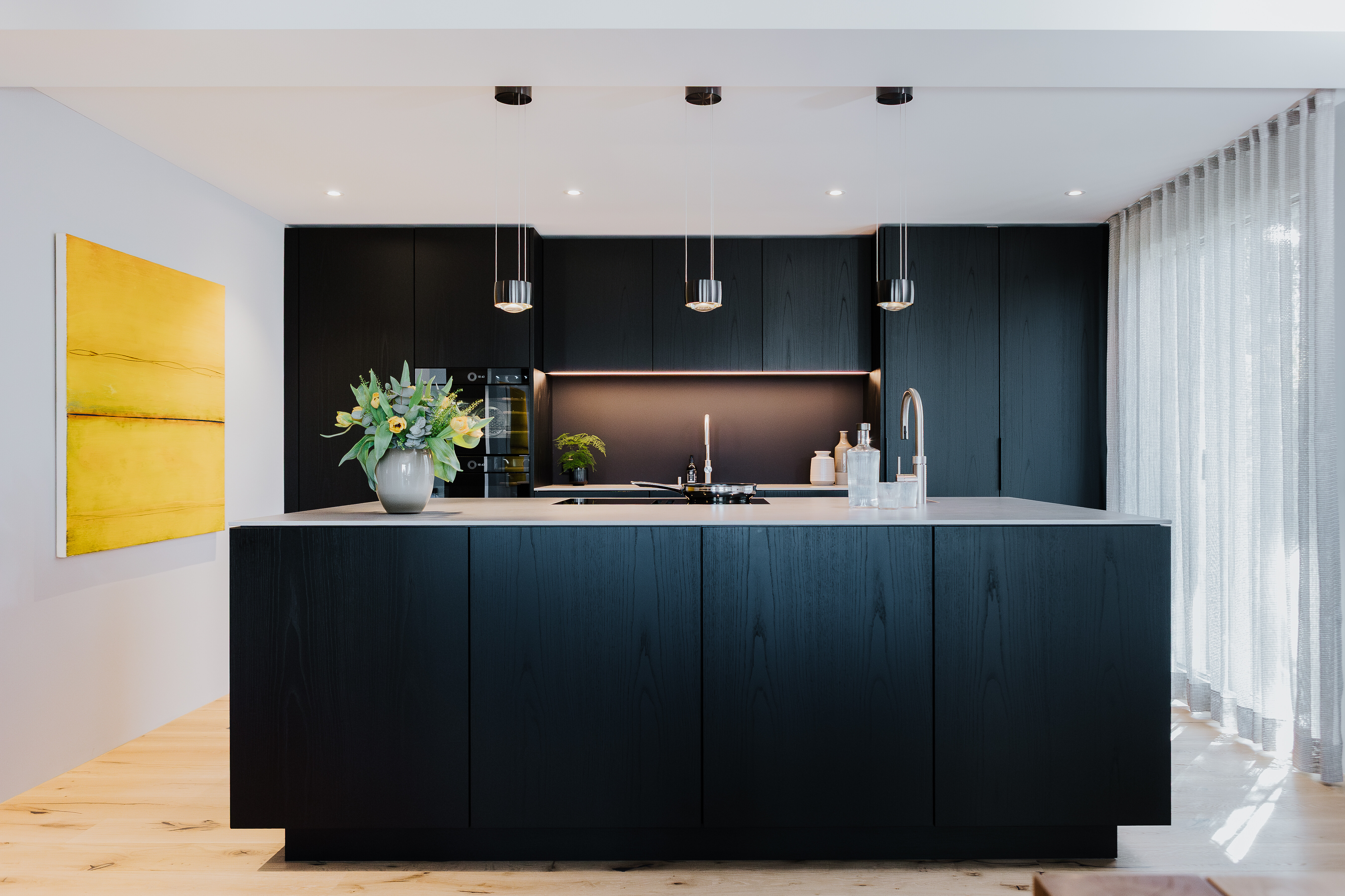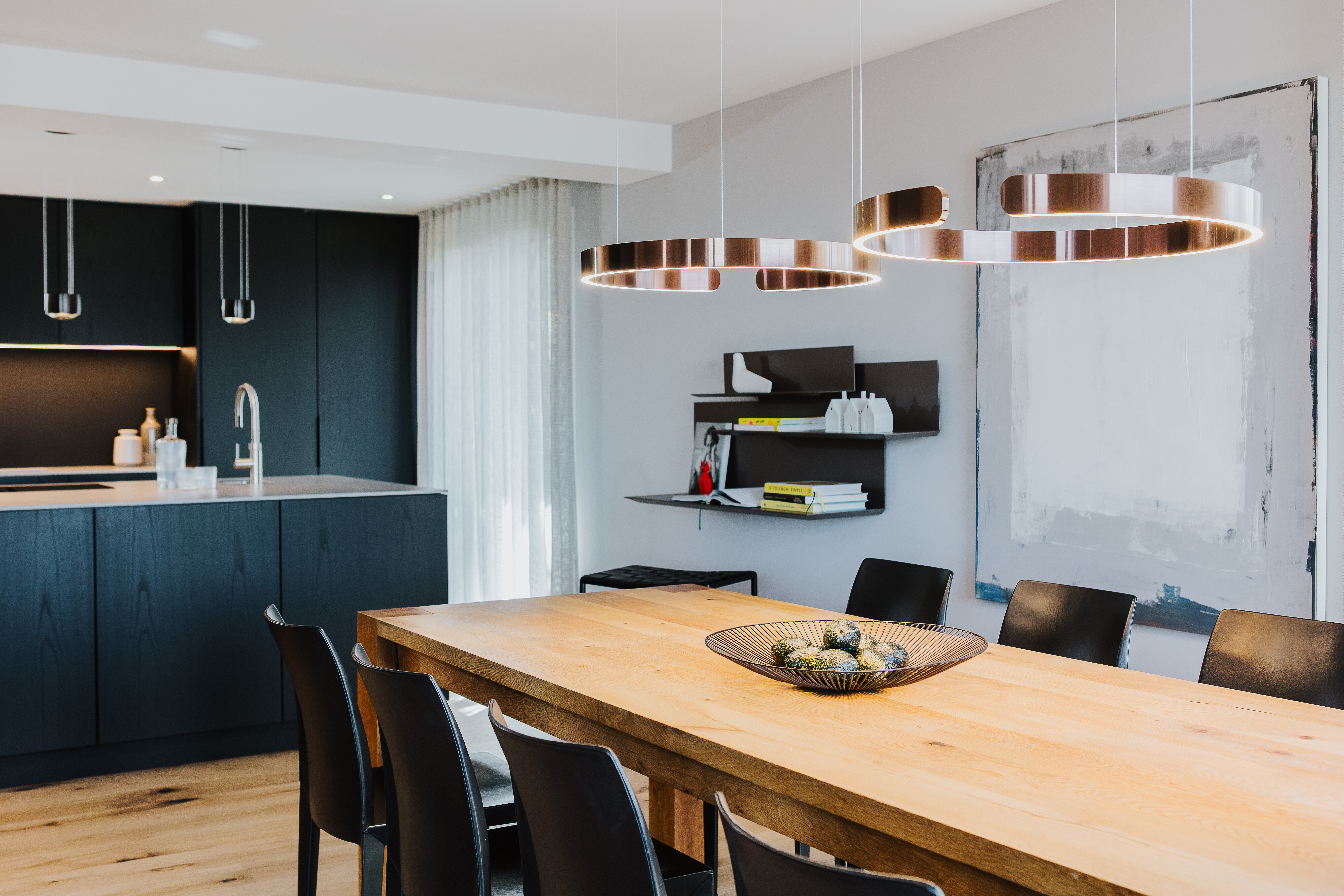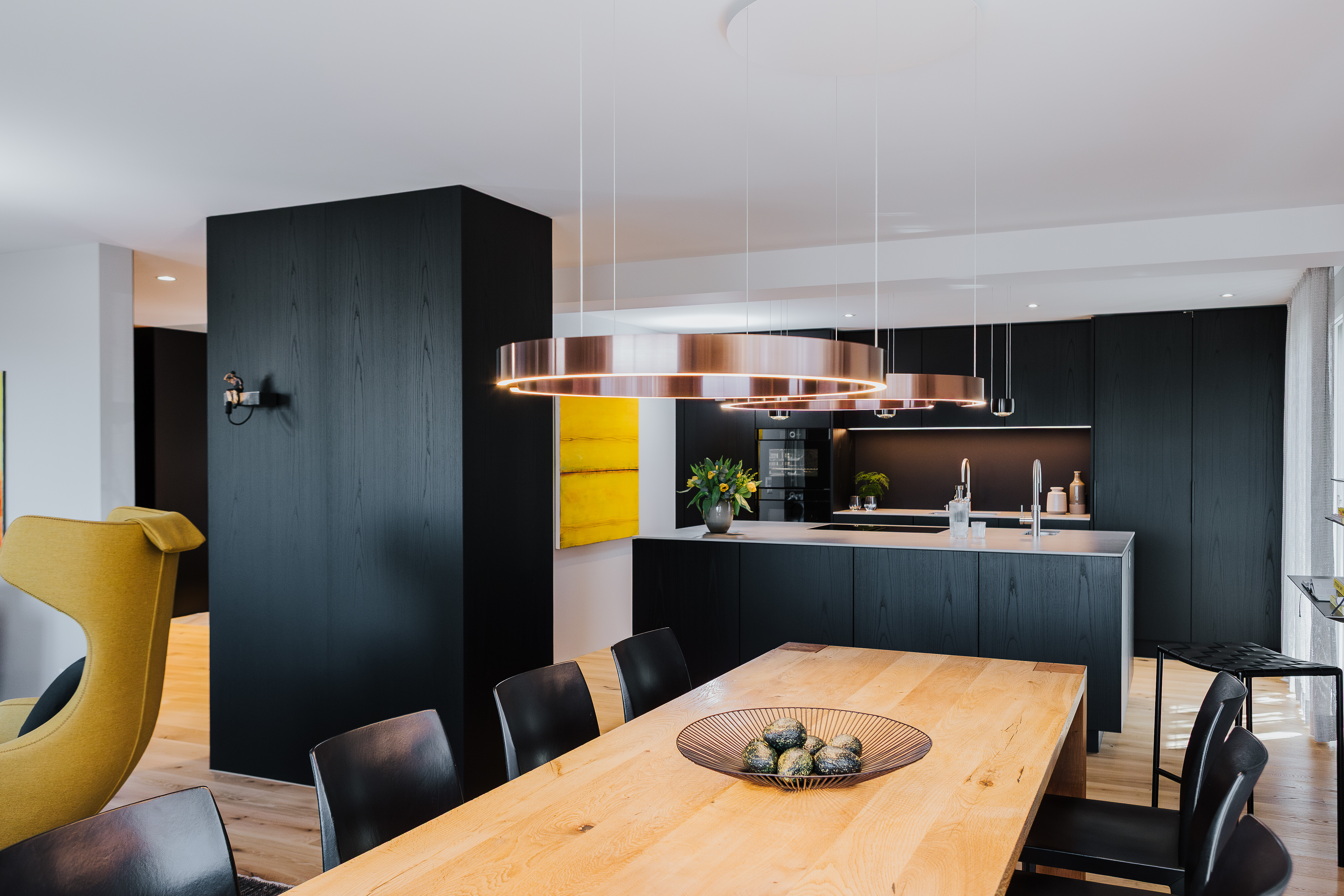 Die offene Küche setzt mit ihrer dunklen Front in Holzoptik und der hellen Arbeitsplatte ein ausdrucksstarkes Zeichen im Raum. Das Zusammenspiel aus Schwarz, Naturtönen und Weiß schafft ein modernes, ausgewogenes Gesamtbild, das zugleich klar und wohnlich wirkt. Drei Hängeleuchten Sento von Occhio betonen gezielt die Kücheninsel und sorgen für eine stimmungsvolle Beleuchtung mit architektonischer Präsenz. Trotz der reduzierten Farbpalette bleibt der Raum einladend – das warme Holz bringt Struktur und Tiefe in die Gestaltung.
