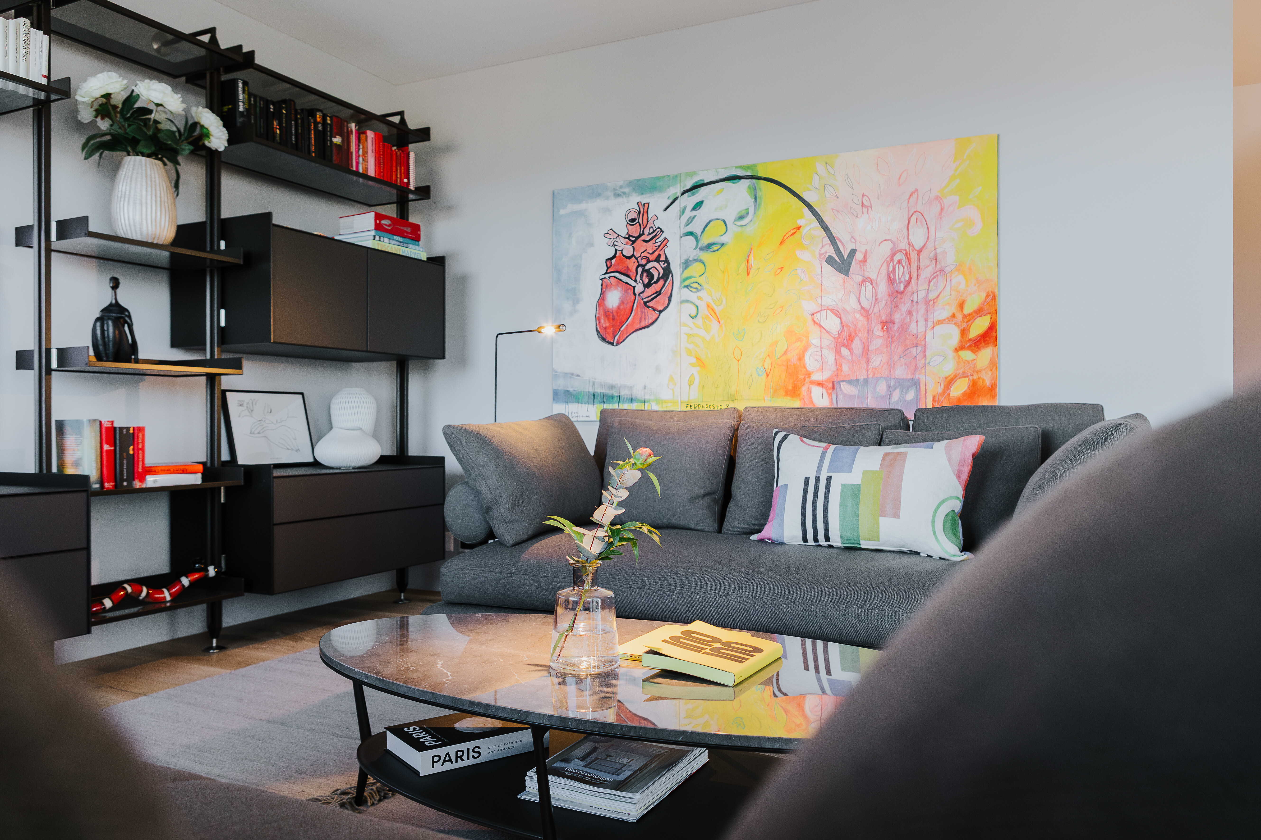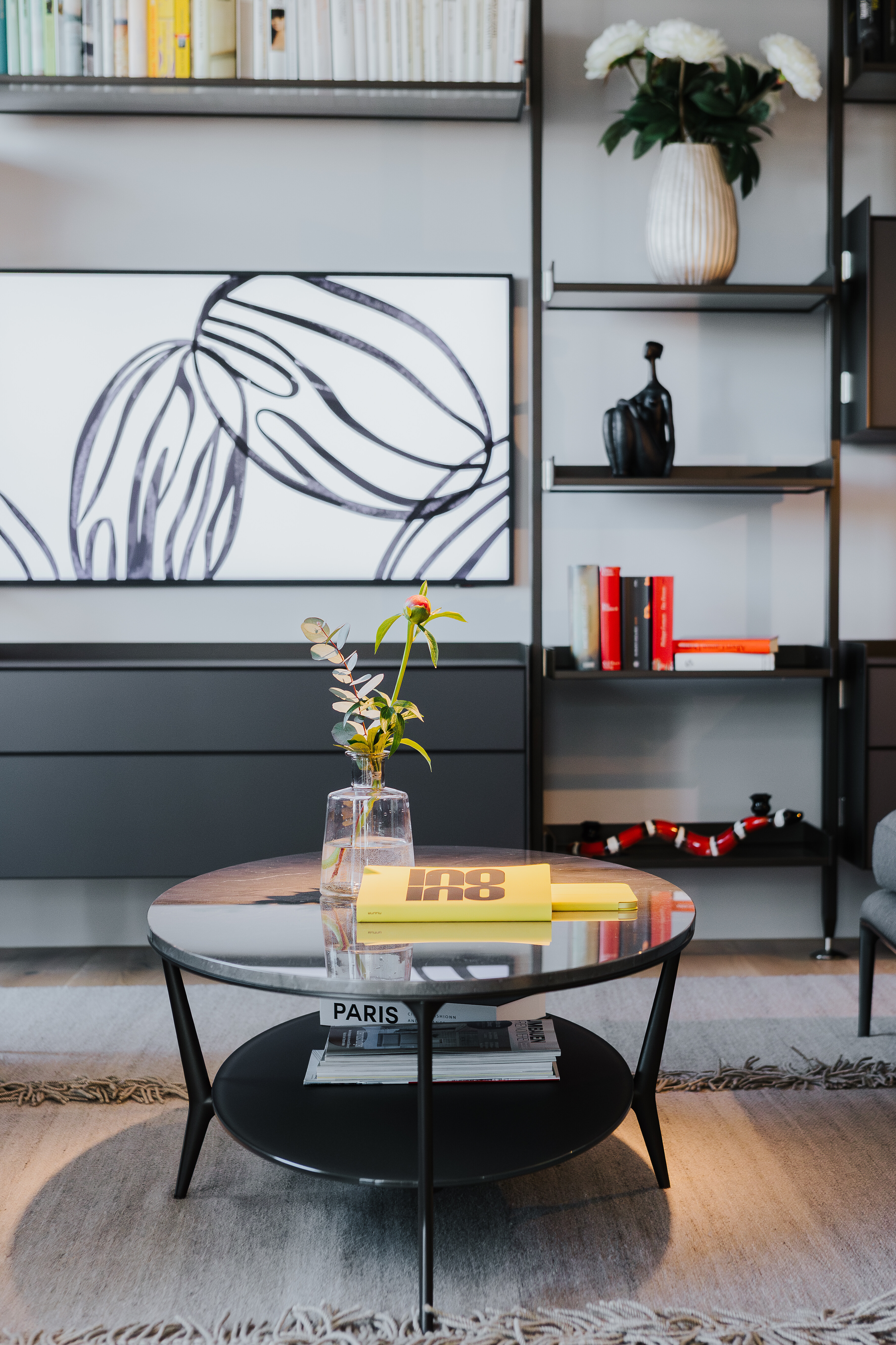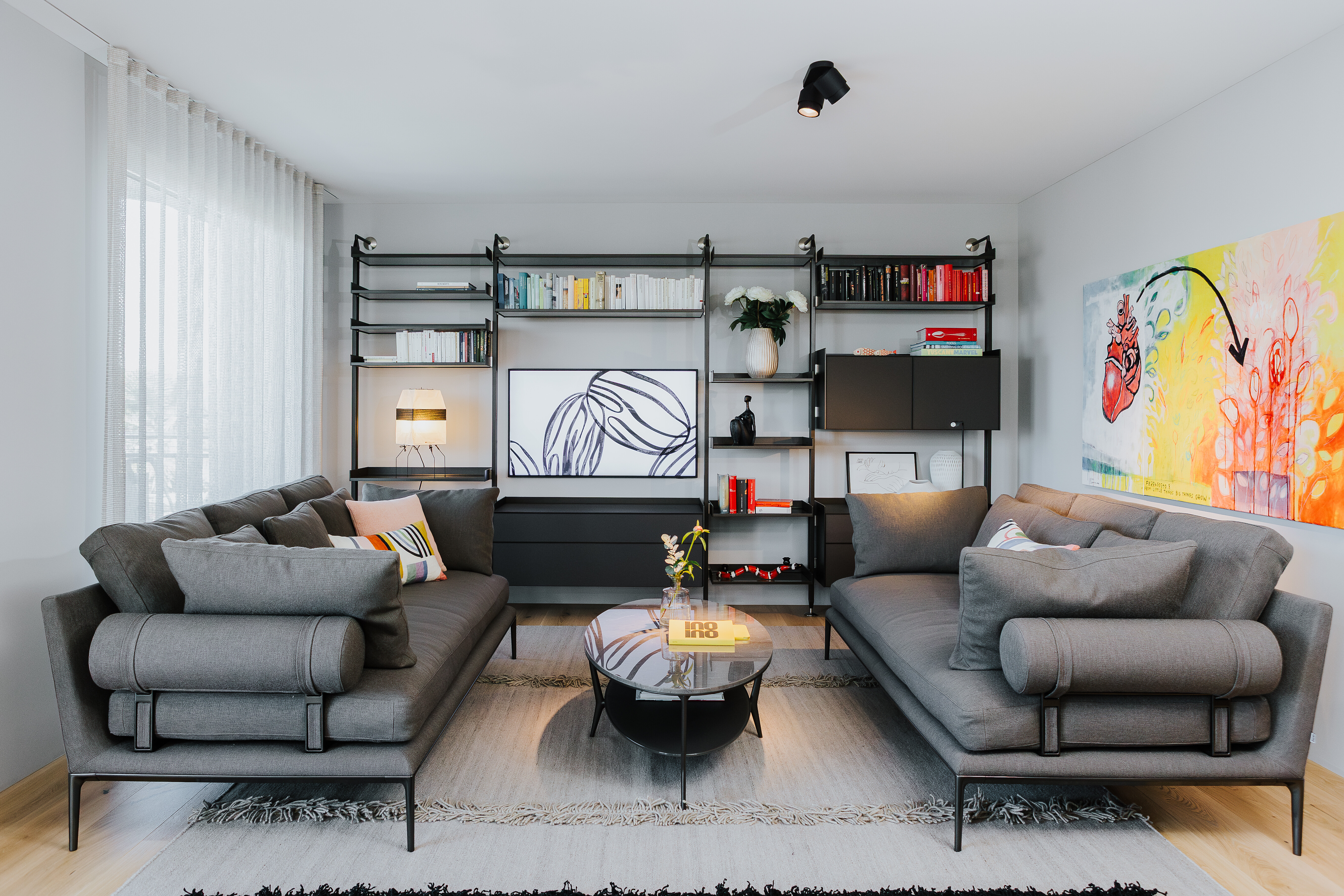 Der Wohnbereich fügt sich harmonisch in die Architektur ein und nutzt die vorhandene Nische gezielt für einen stilvollen Rückzugsort. Zwei Sofas Atoll von B&B Italia bilden das Zentrum des Raumes – ihre klare Formensprache und dunkle Farbgebung schaffen eine ruhige, konzentrierte Atmosphäre. Dazwischen sorgt der Couchtisch Planet von Rimadesio mit seiner filigranen Ausführung für eine dezente Leichtigkeit. Im Hintergrund bringt das offene Regalsystem Zenit von Rimadesio Struktur in den Raum und unterstreicht die offene, durchdachte Gestaltung.
