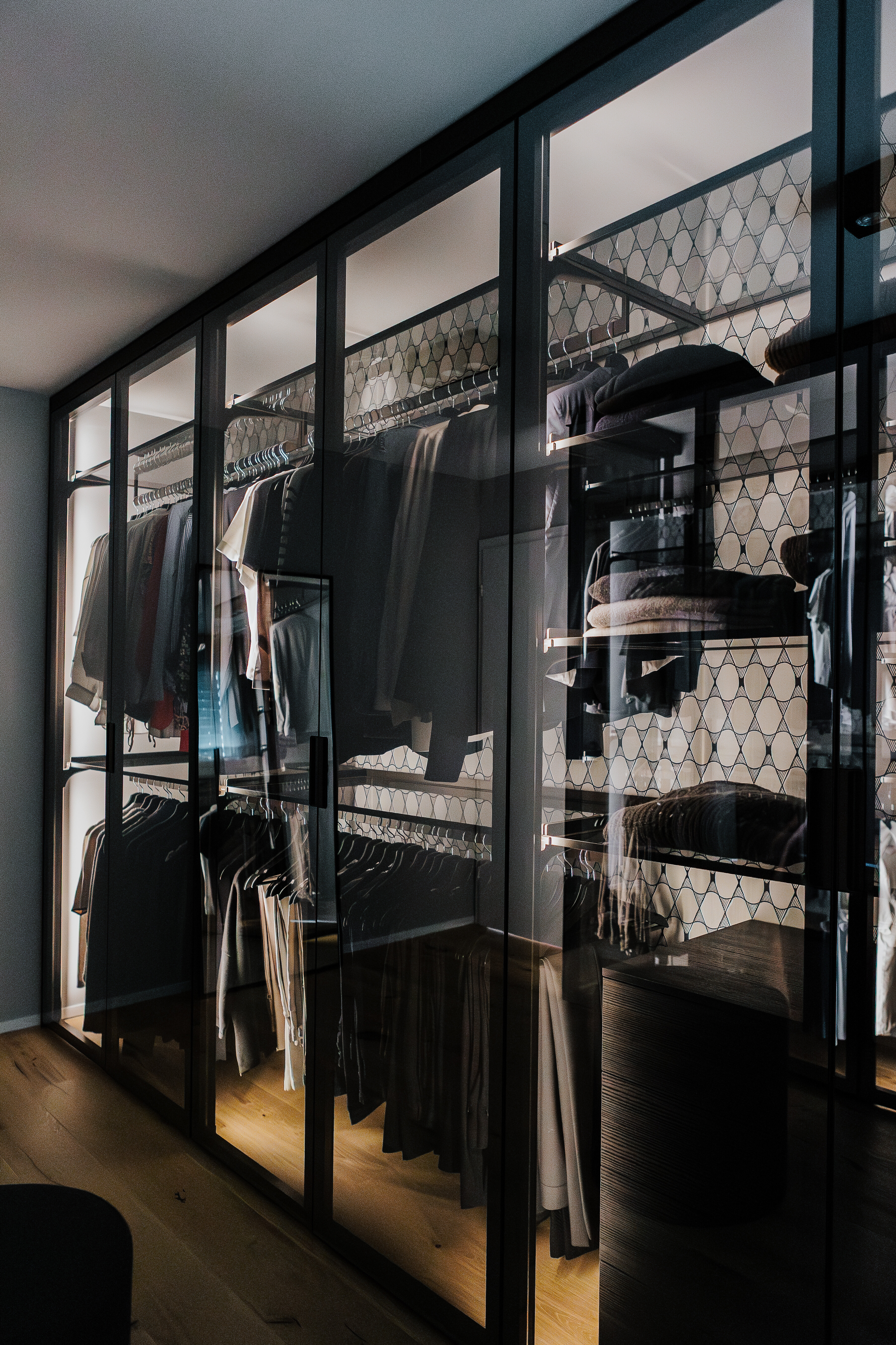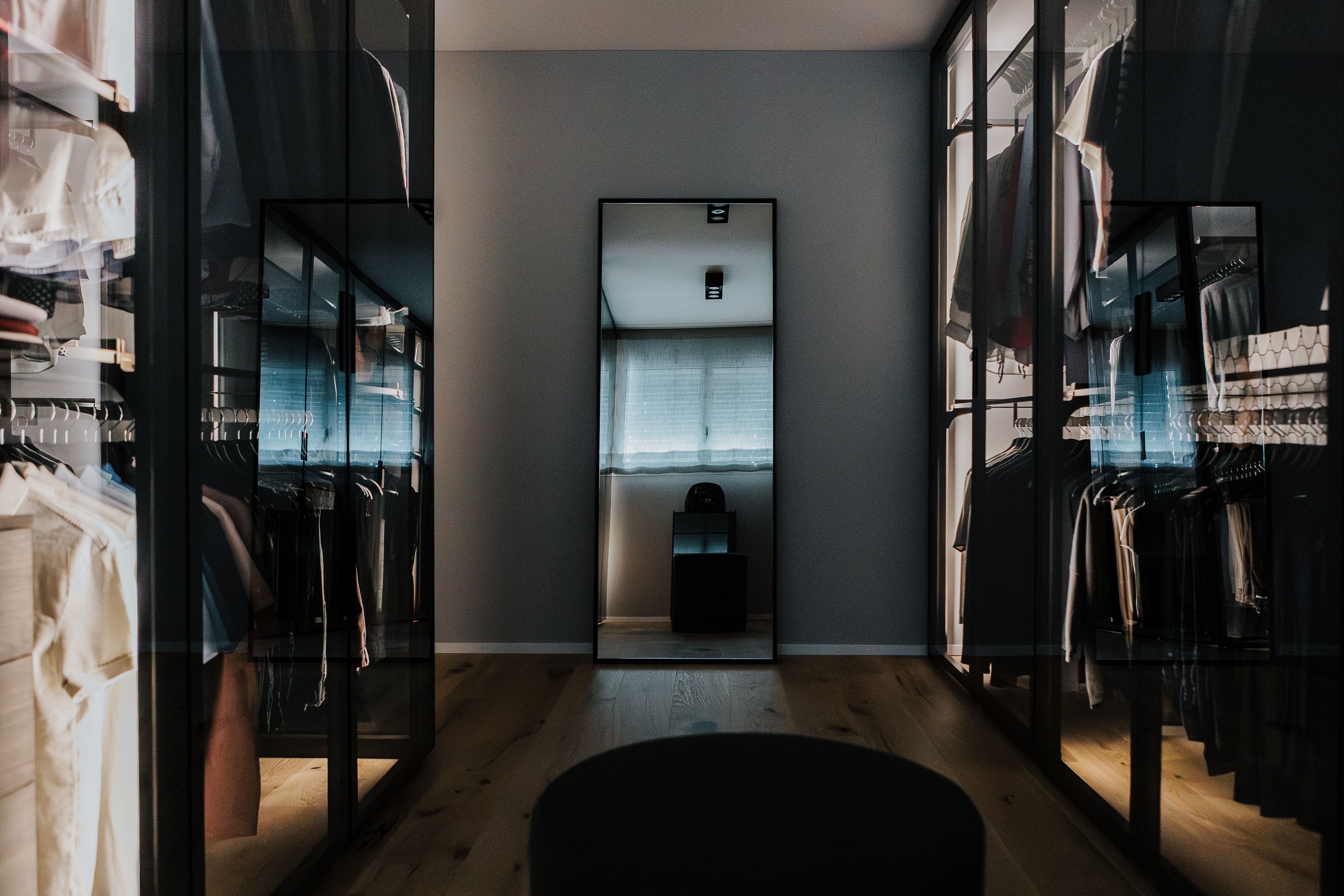 Angrenzend daran liegt die stilvolle Ankleide, die mit dunklen Tönen und hochwertigen Materialien einen spannungsvollen Kontrast setzt. Besonders ins Auge fällt der Spiegel Reflection von Porro, der dem Raum Tiefe verleiht und ihn zugleich optisch erweitert. Die Glastüren der Schrankelemente sorgen für Transparenz und Eleganz – ein durchdachtes Detail, das Funktion und Ästhetik miteinander verbindet. So entsteht ein Bereich, der Ruhe, Klarheit und Hochwertigkeit auf stimmige Weise vereint.