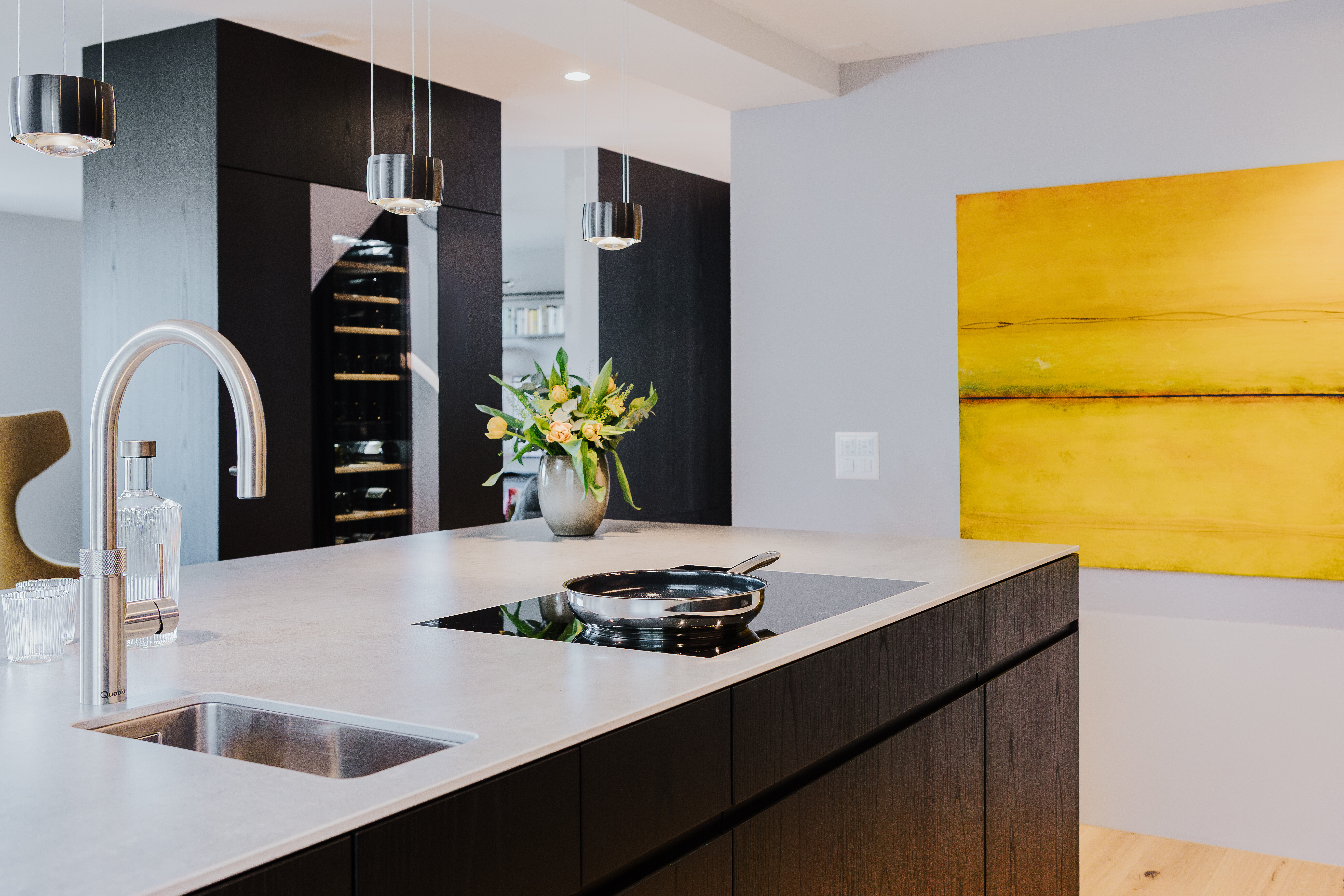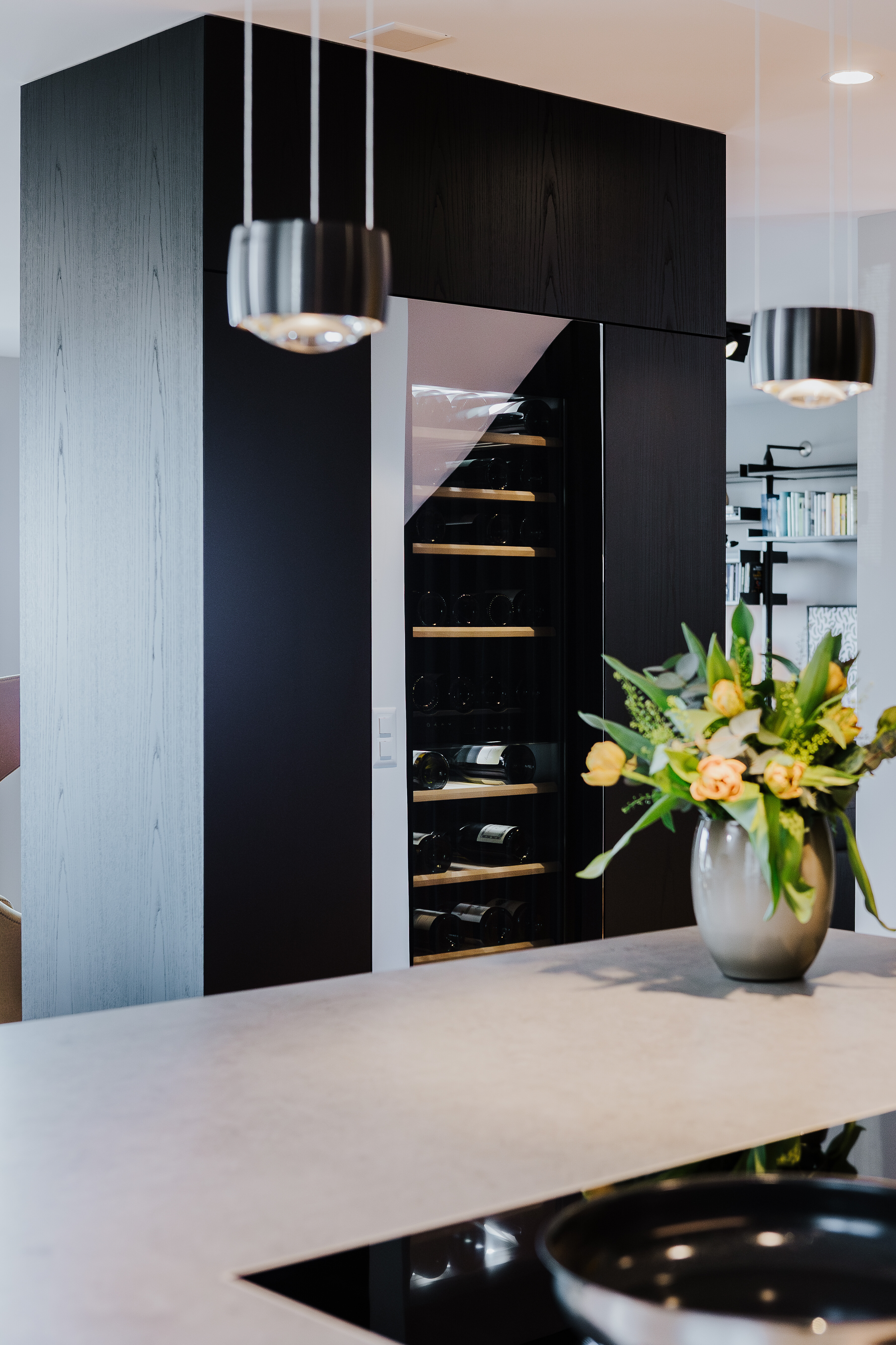 Ein markantes gelbes Bild bildet den visuellen Mittelpunkt und verbindet die Küche elegant mit dem angrenzenden Wohnbereich. Es setzt einen mutigen Akzent, der Energie verleiht und zugleich die grafische Klarheit des Konzepts unterstreicht. Der freistehende Weinkühlschrank fügt sich als hochwertiges Detail harmonisch ein und akzentuiert die funktionale Ausrichtung. So entsteht eine Küche, die sowohl gestalterisch als auch praktisch überzeugt – als zentraler Raum für Genuss, Begegnung und stilvolles Miteinander.