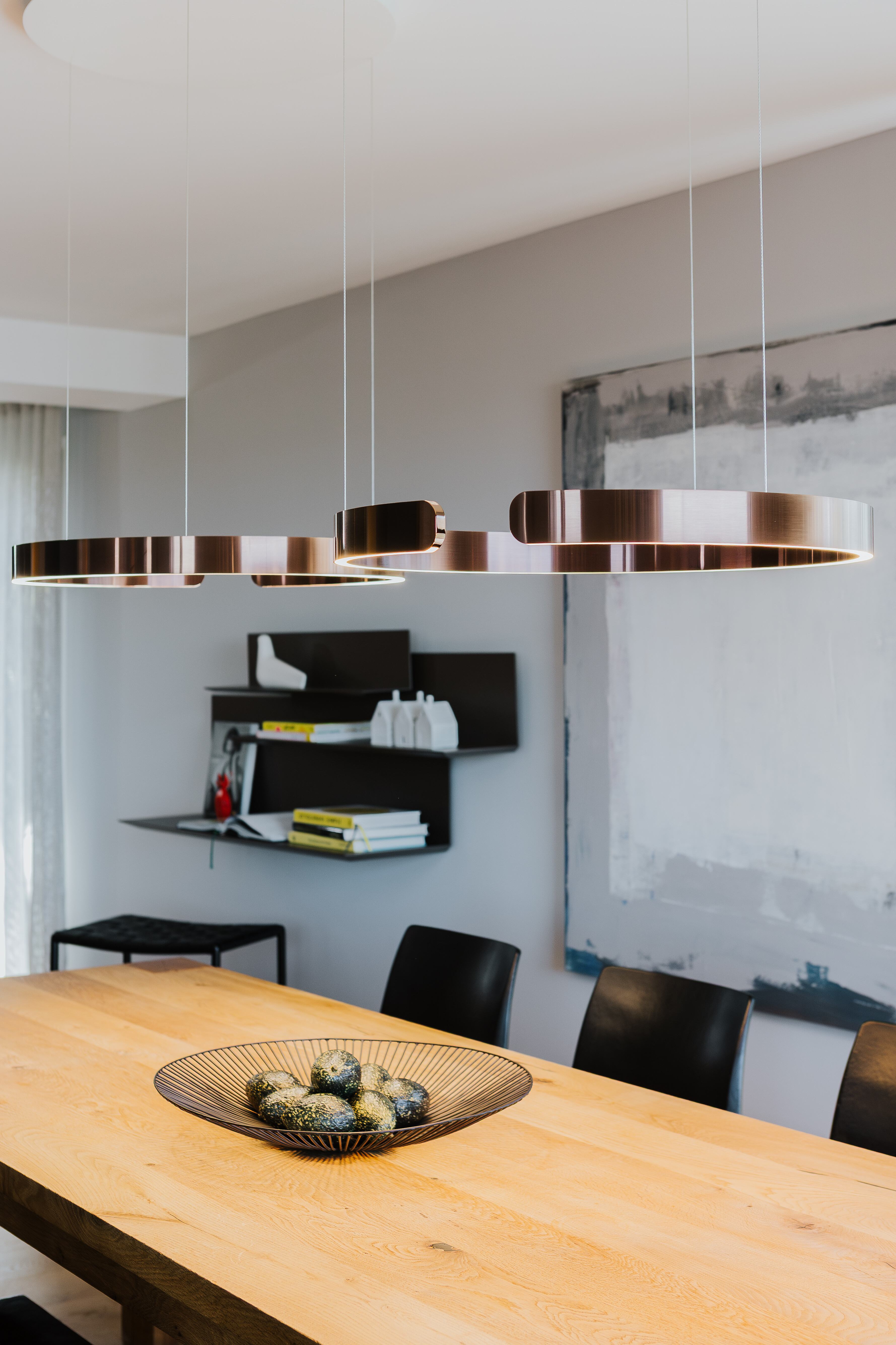 Für die passende Atmosphäre sorgen zwei Hängeleuchten Mito sospeso von Occhio in einem eleganten Roségold. Ihr schwebender Charakter und das präzise Lichtspiel setzen den Tisch stilvoll in Szene, ohne den Raum zu dominieren. Im Hintergrund ergänzt das Wandregal Lilu von Interlübke den Bereich mit Leichtigkeit und Struktur. Es schafft Platz für Bücher, Objekte oder Alltagsdinge – und fügt sich dabei dezent in das gestalterische Gesamtkonzept ein. So entsteht ein Essbereich mit Tiefe, Charakter und funktionaler Raffinesse.