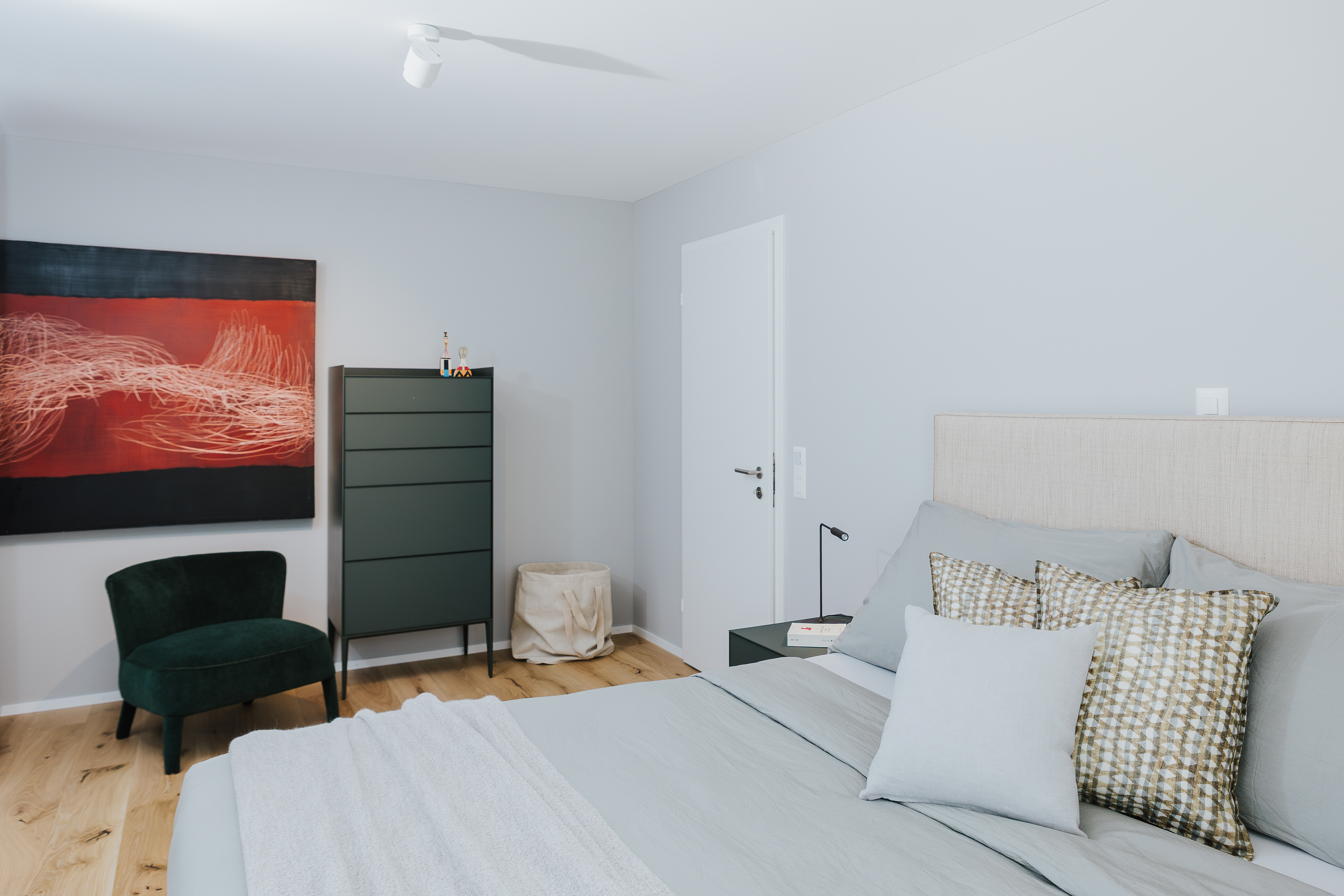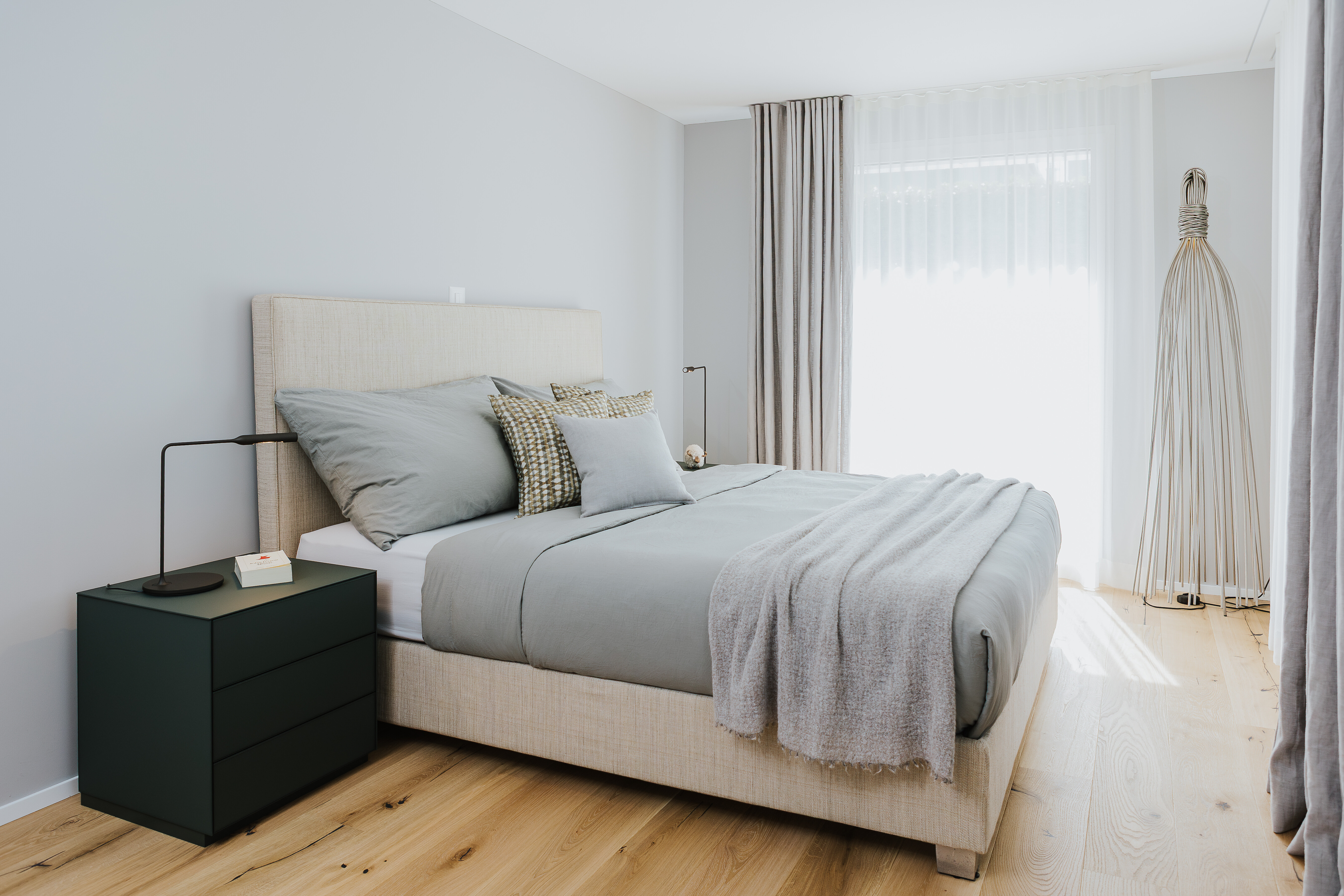 Der Schlafbereich strahlt mit seiner natürlichen Farbgebung Ruhe und Leichtigkeit aus. Ein helles Polsterbett von Treca bildet den Mittelpunkt des Raumes und lädt dazu ein, zur Ruhe zu kommen. Der Nachttisch Self von Rimadesio fügt sich mit seiner klaren Gestaltung unaufdringlich in das Gesamtbild ein und bietet funktionalen Stauraum. Die Tischleuchte Flo Bedside von Lumina ergänzt das Ensemble durch ihr zurückhaltendes, präzises Licht – ideal für die abendliche Lektüre.