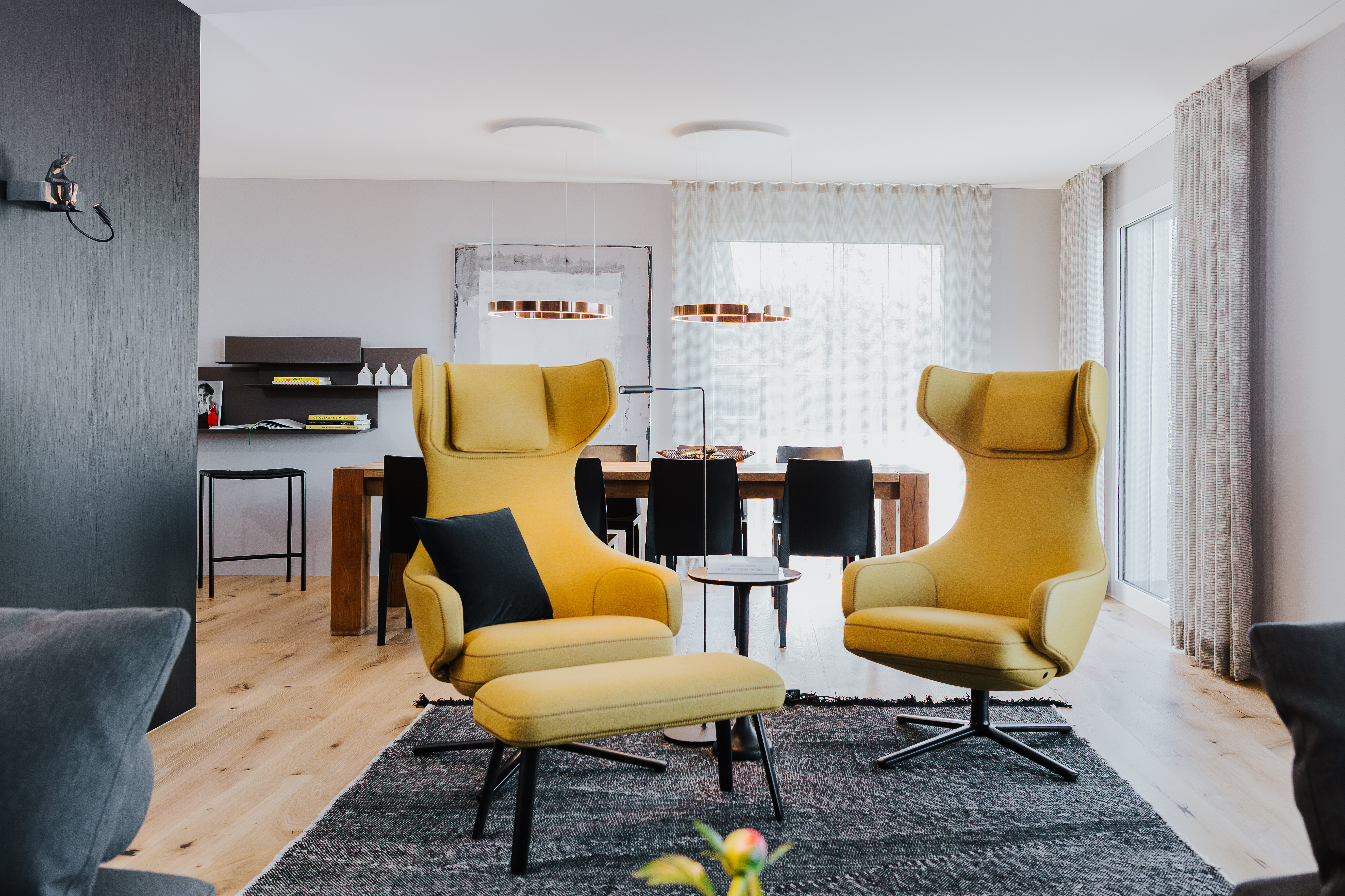 Zwei Sessel Grand Repos von Vitra in einem kräftigen Gelb setzen gezielte Farbakzente und bringen eine lebendige Note ins Konzept. Zusammen mit dem farblich abgestimmten Wandbild entsteht eine visuelle Verbindung zum gesamten Einrichtungskonzept. Der Wohnbereich wirkt dadurch nicht nur ausdrucksstark, sondern auch einladend und ausgewogen – ein Ort, der Tiefe, Eleganz und Komfort auf eindrucksvolle Weise vereint.