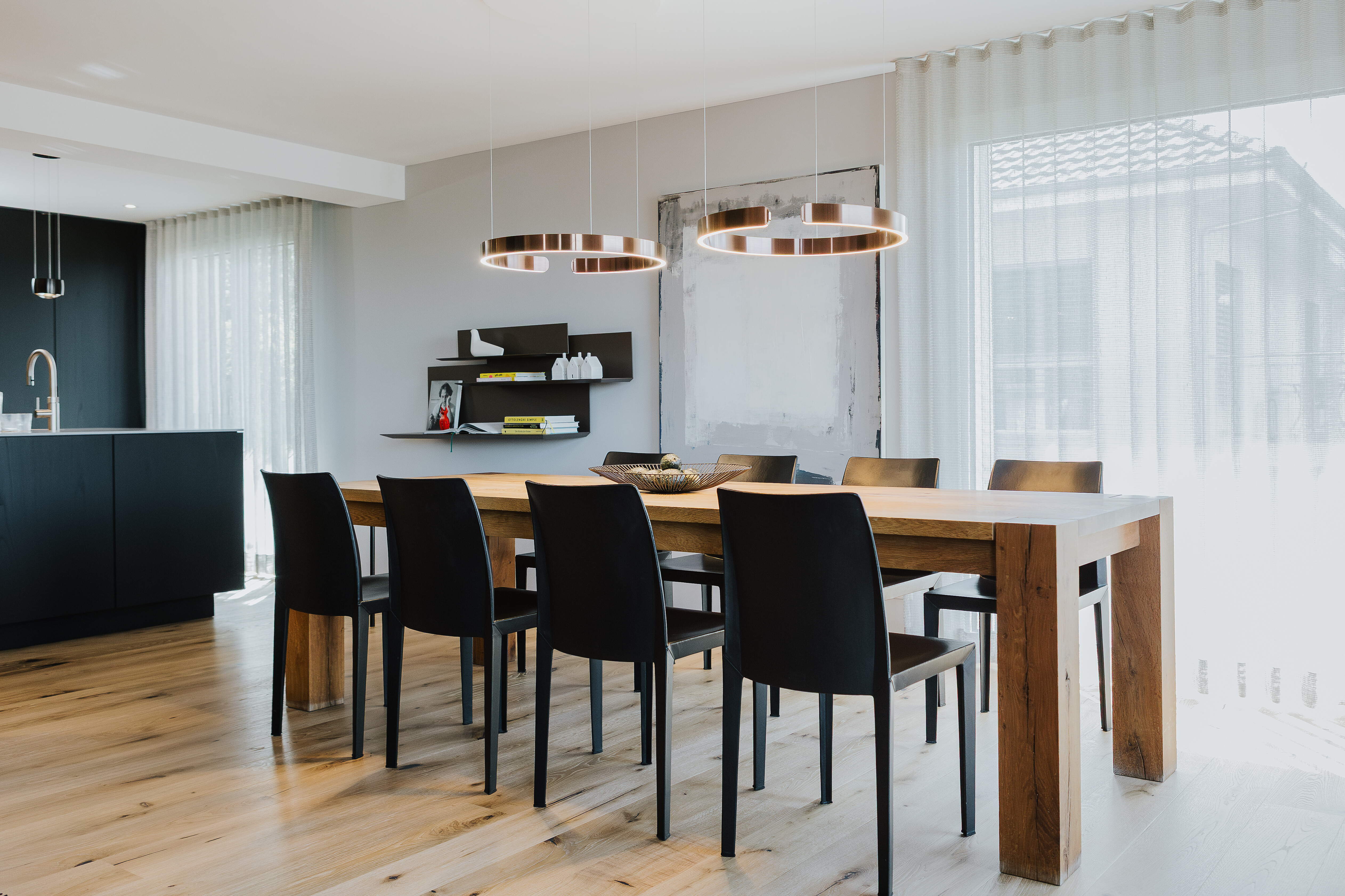 Der Essbereich wird durch den charaktervollen Holztisch Bigfoot von e15 bestimmt. Mit seiner massiven Eichenplatte und den markanten Tischbeinen verleiht er dem Raum eine geerdete Präsenz. Dazu stehen schlichte, schwarze Stühle im Kontrast, die durch ihre klare Linienführung Ruhe in das Ensemble bringen und den Blick auf das Materialspiel lenken. Die Kombination wirkt modern und einladend zugleich – ein Ort, der Wertigkeit und Alltagstauglichkeit miteinander verbindet.
