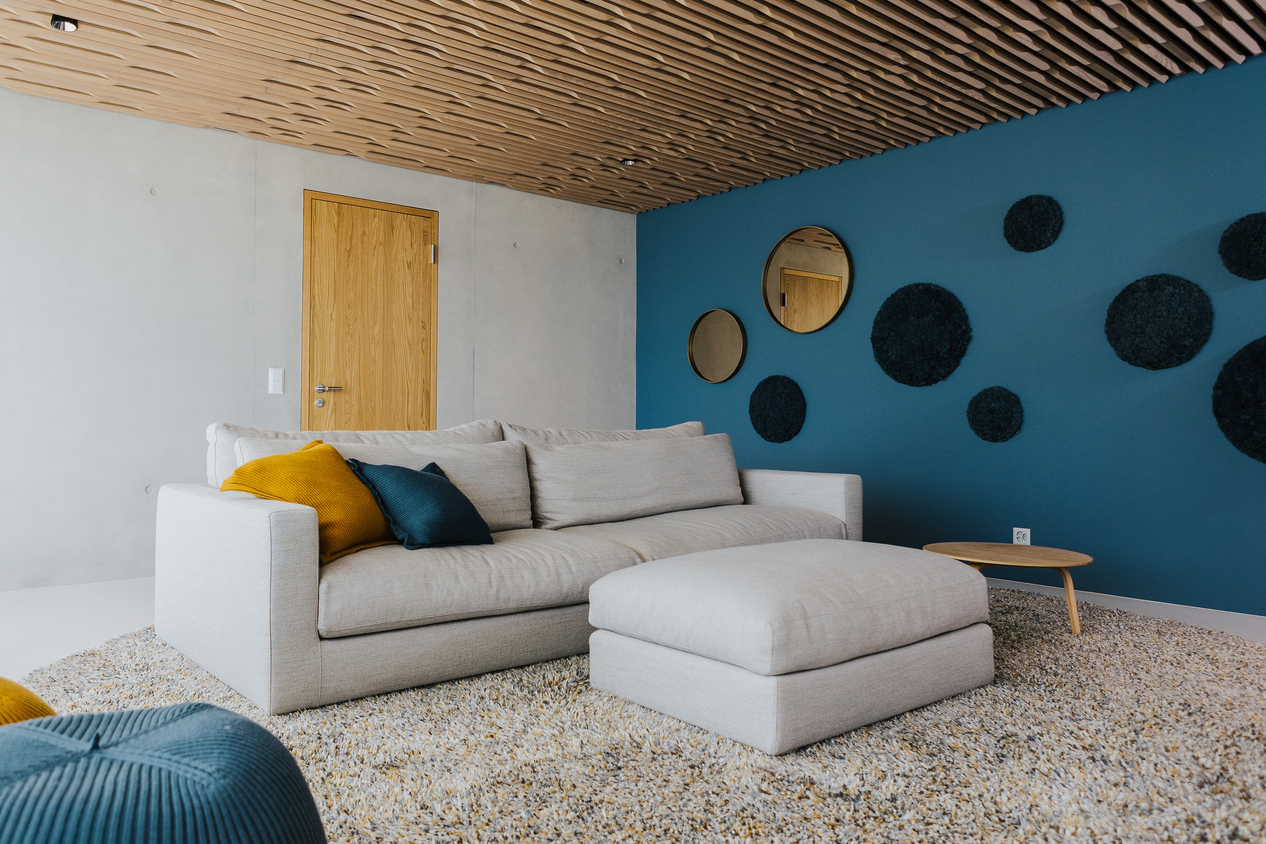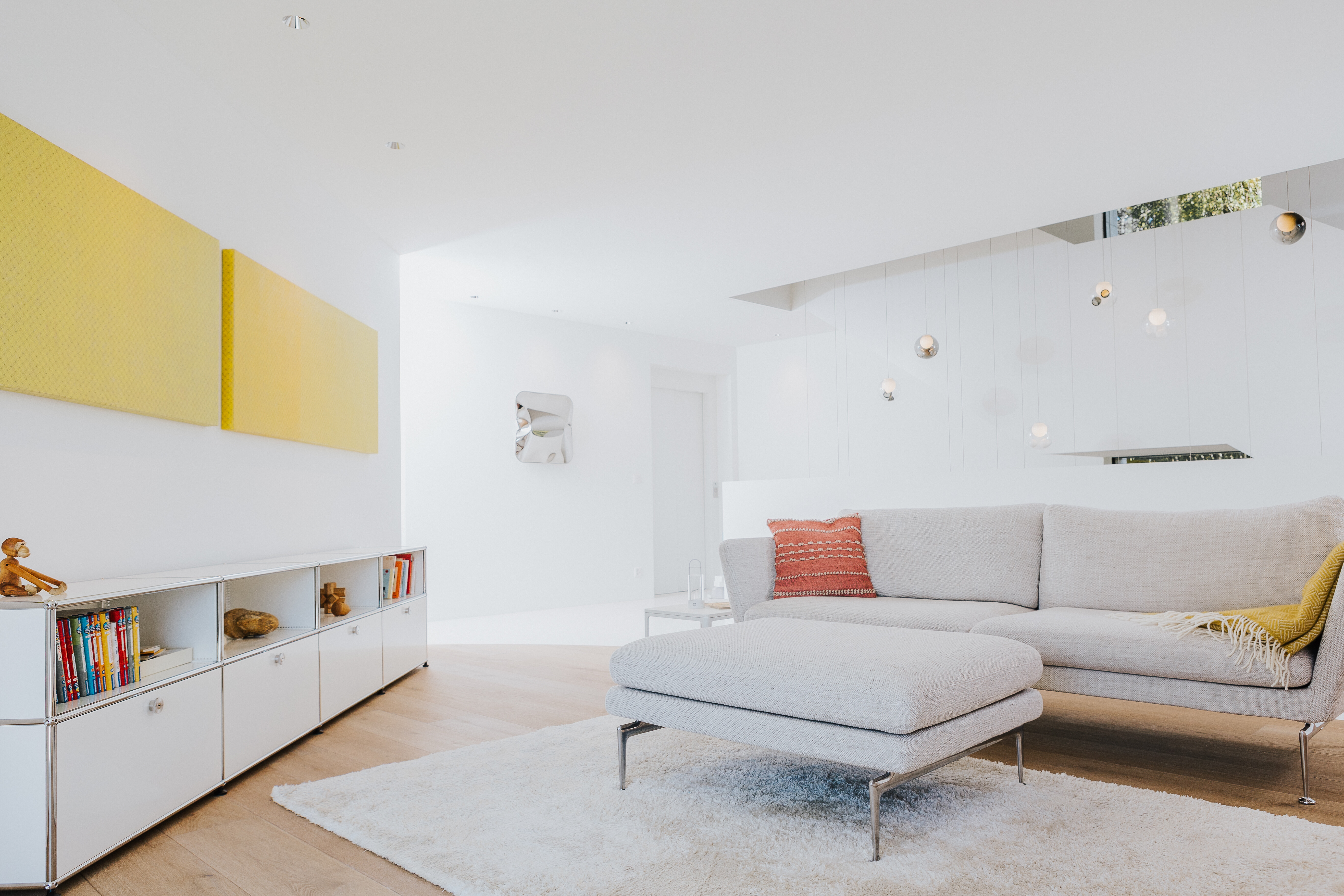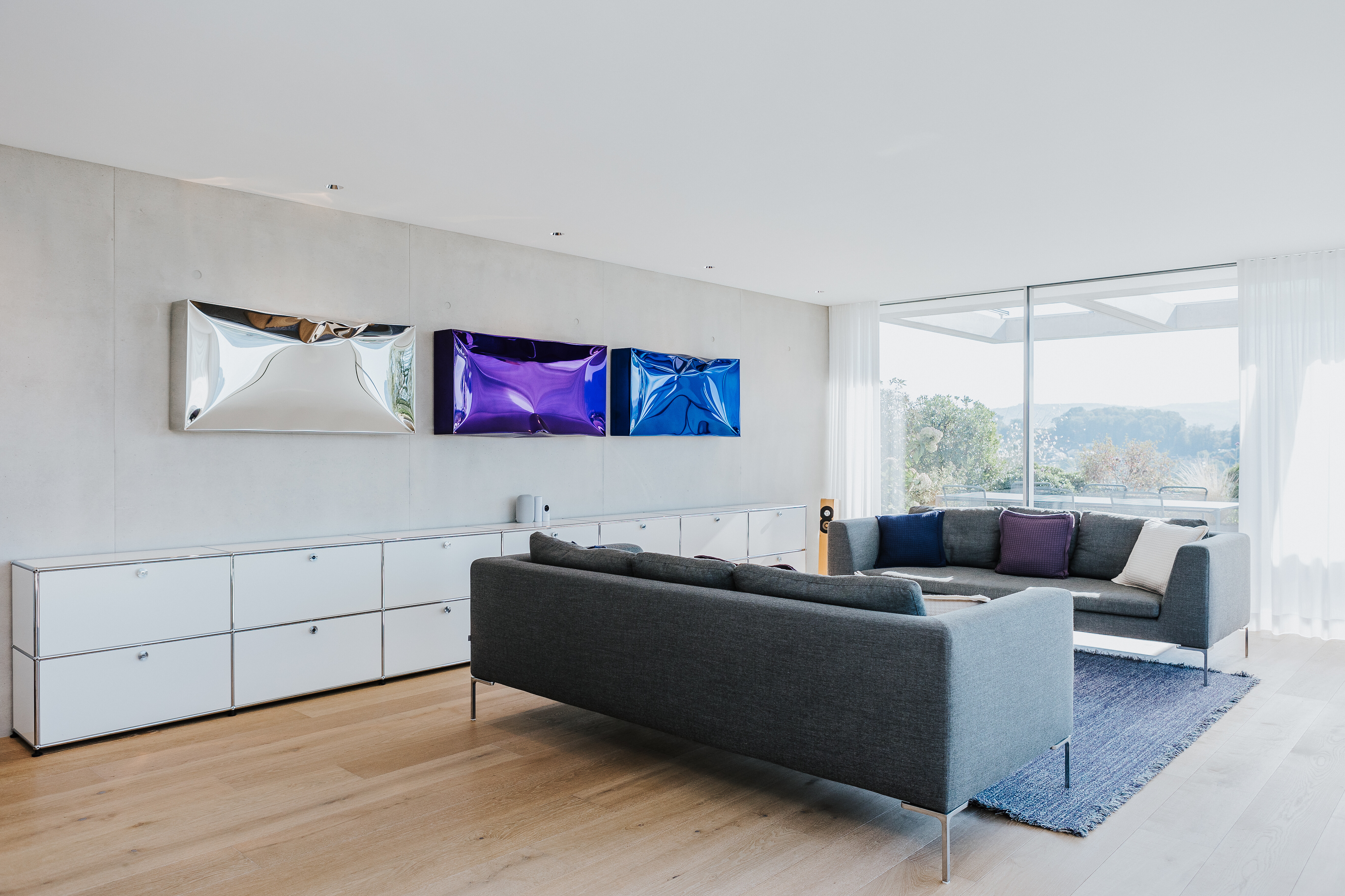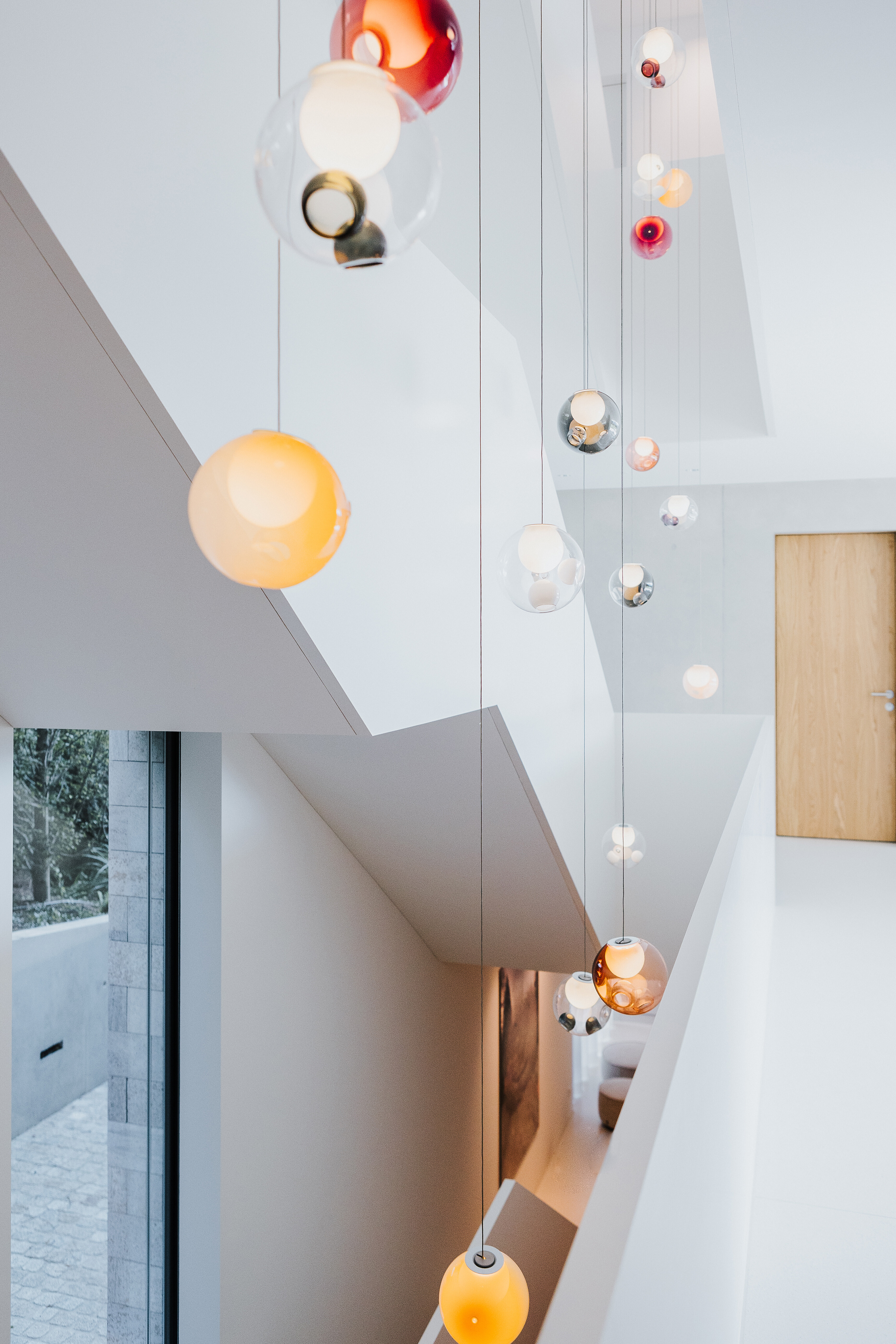 Im Treppenhaus entfaltet die Leuchte 28.1 von Bocci ihre volle Wirkung: In bunten Tönen schimmernde Glaskugeln hängen wie schwerelose Tropfen in den Raum und bringen eine spielerische, fast poetische Dimension in das architektonische Konzept. Ergänzt wird das Lichtkonzept durch ausgewählte Sofas: Im Fernsehzimmer das Modell Mauro von Linteloo, im Übergang Suita von Vitra und Charles von B&B Italia im Wohnbereich. Alle ruhen in feinen Grautönen und bilden stilvolle Rückzugsorte, durch Licht perfekt in Szene gesetzt.