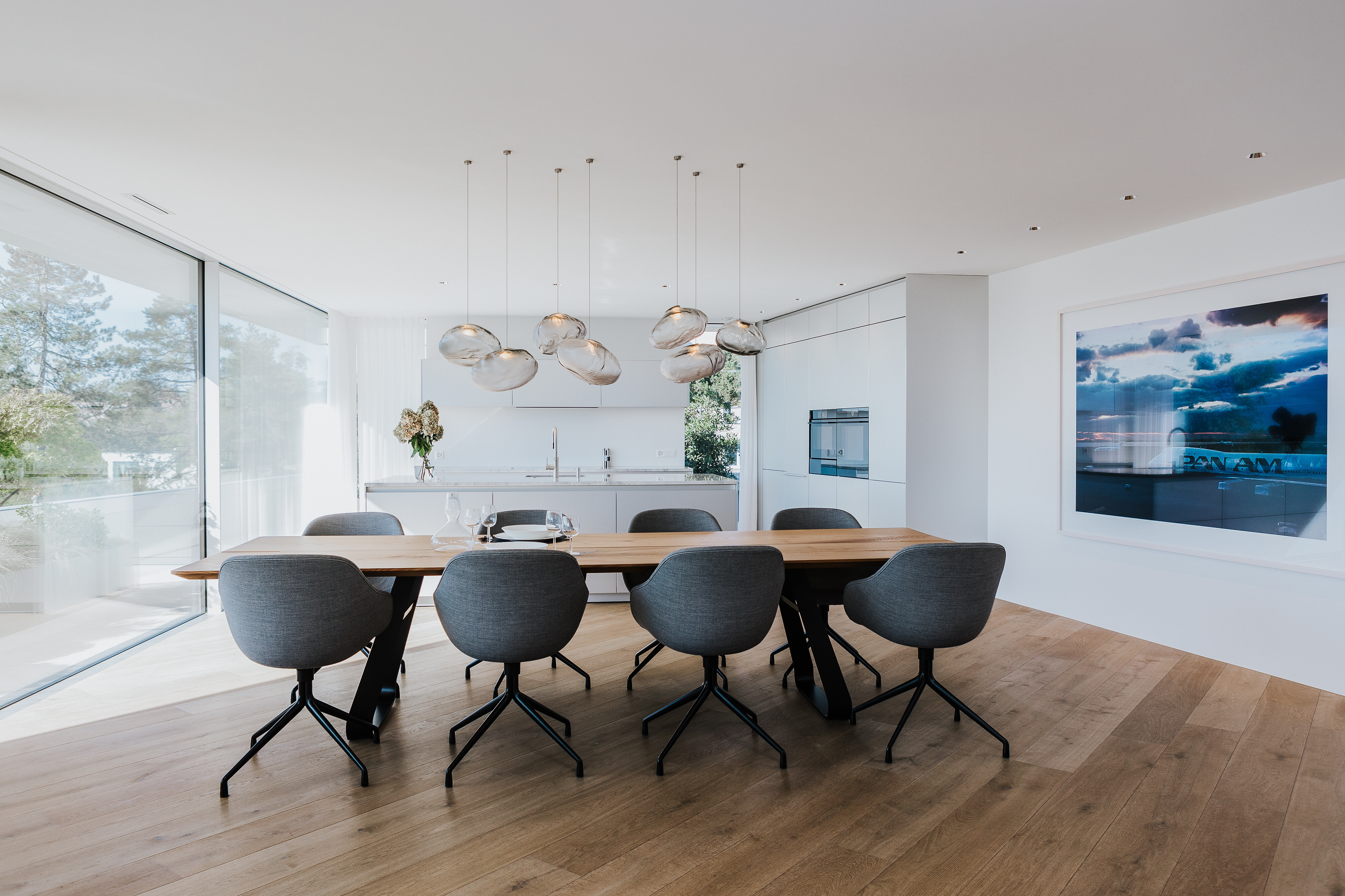 Die ovale Leuchtenkonstruktion über dem großen Esstisch wird zum Herzstück des Raumes: Ihre schwebende Präsenz setzt einen eleganten Kontrapunkt zur reduzierten Einrichtung und bringt gleichzeitig Leichtigkeit ins Gesamtkonzept. Der Holztisch und die About A Chair AAC 121 Stühle von HAY fügen sich harmonisch in die offene Gestaltung ein. Hinter der Szene strahlt die weiß gehaltene bulthaup b3 Einbauküche in klarer Zurückhaltung – ein Zusammenspiel von Funktion, Design und feiner Beleuchtung.