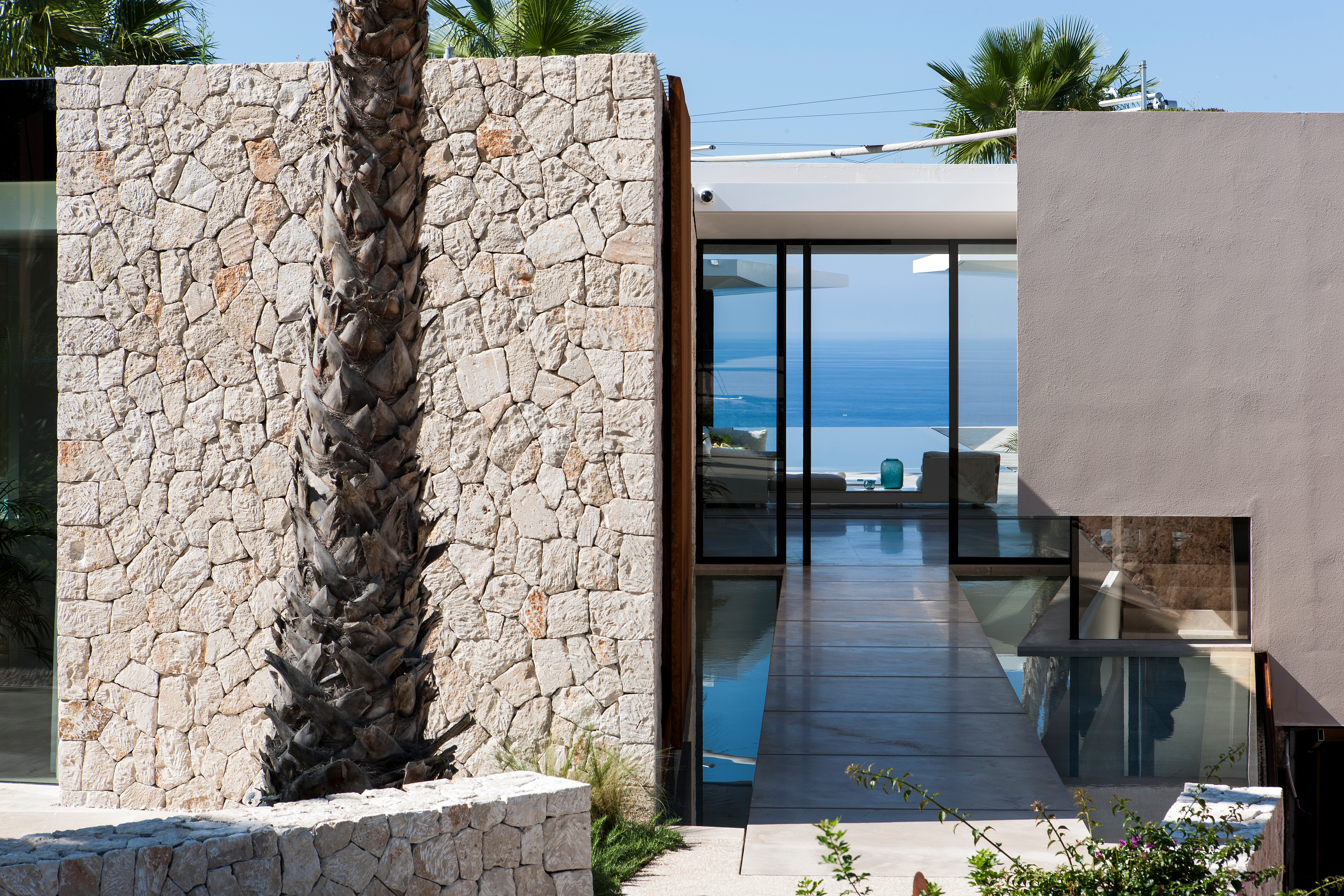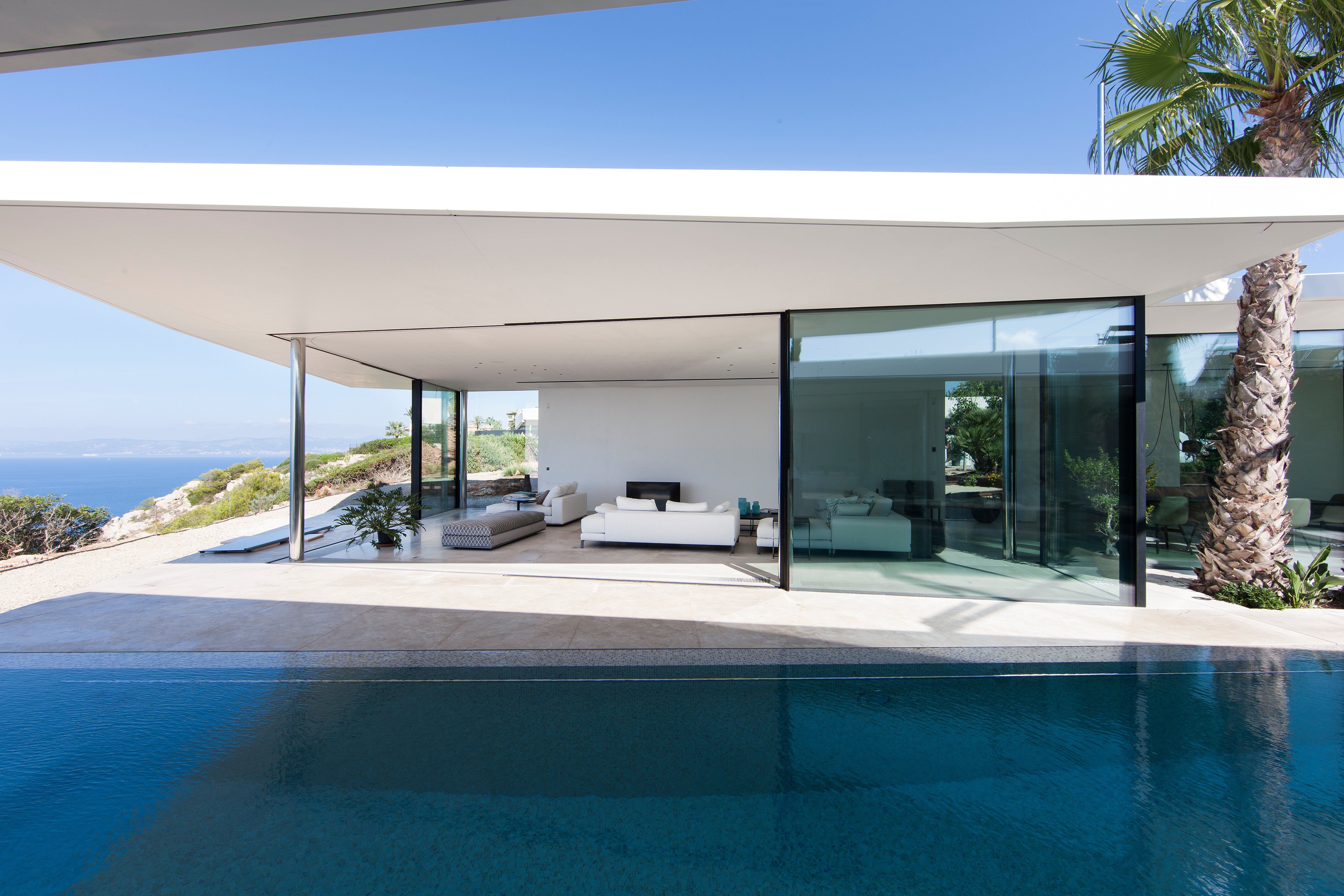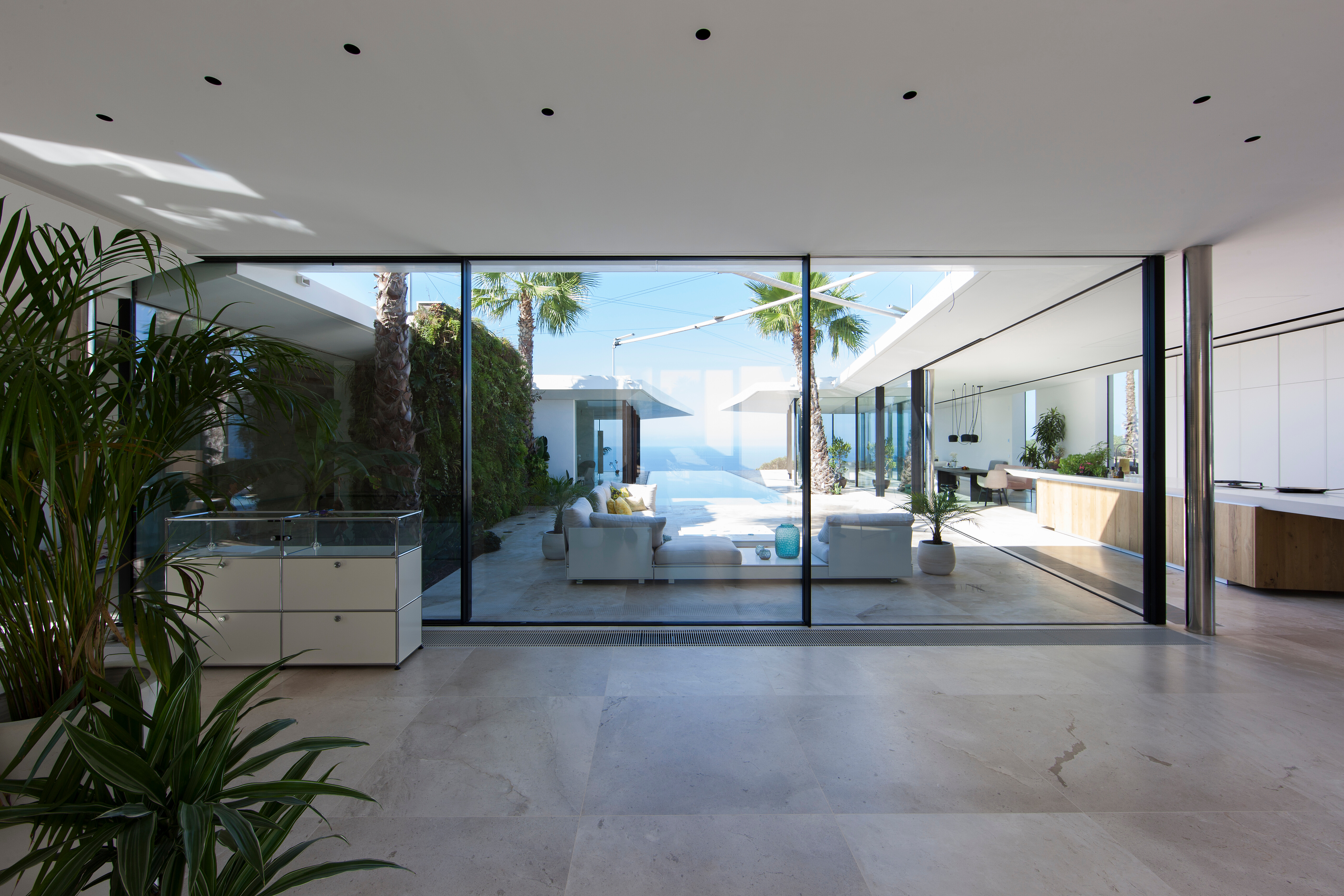 Im Zentrum der Immobilie öffnet sich das Haus zu einem weitläufigen Innenhof, der zugleich den Übergang zum Pool und den freien Blick auf das Meer inszeniert. Die Architektur schafft fließende Raumverhältnisse – durch vollständig zu öffnende Fensterfronten verschmelzen Innen- und Außenbereich zu einer großzügigen Wohnlandschaft unter freiem Himmel.