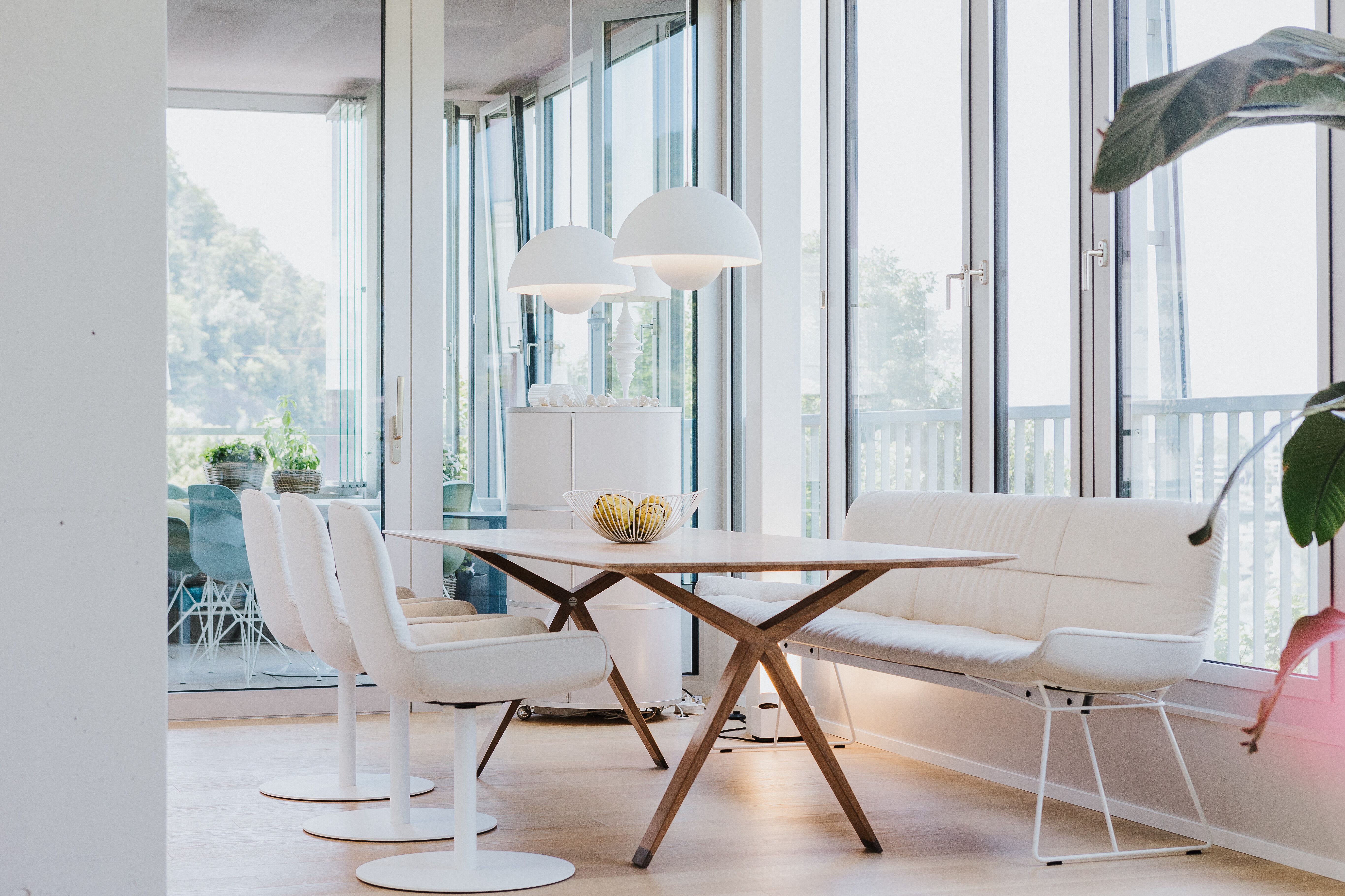 Der Essbereich dieses lichtdurchfluteten Zuhauses überzeugt mit seiner klaren, offenen Gestaltung. Der dunkle Holztisch bildet einen eleganten Kontrast zu den schneeweißen Leya-Stühlen und der passenden Sitzbank von Freifrau. Darüber setzen zwei weiße Hängeleuchten Flowerpot von &Tradition stilvolle Lichtakzente und unterstreichen die luftige Raumwirkung. Die ruhige Farbwahl schafft in Verbindung mit dem natürlichen Licht und den grünen Pflanzen eine ausgeglichene und freundliche Atmosphäre – perfekt für entspannte Mahlzeiten im Familienkreis oder mit Gästen.