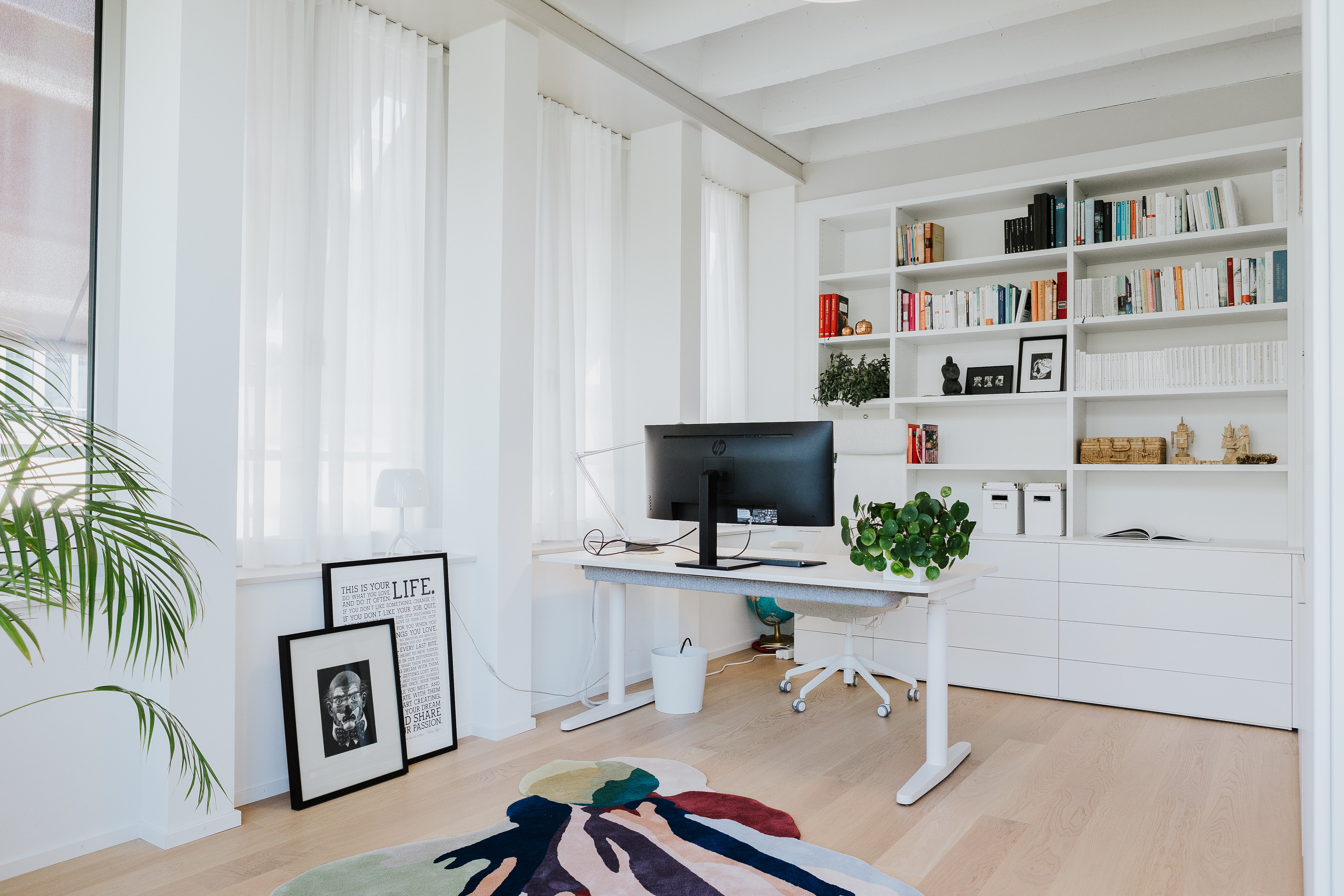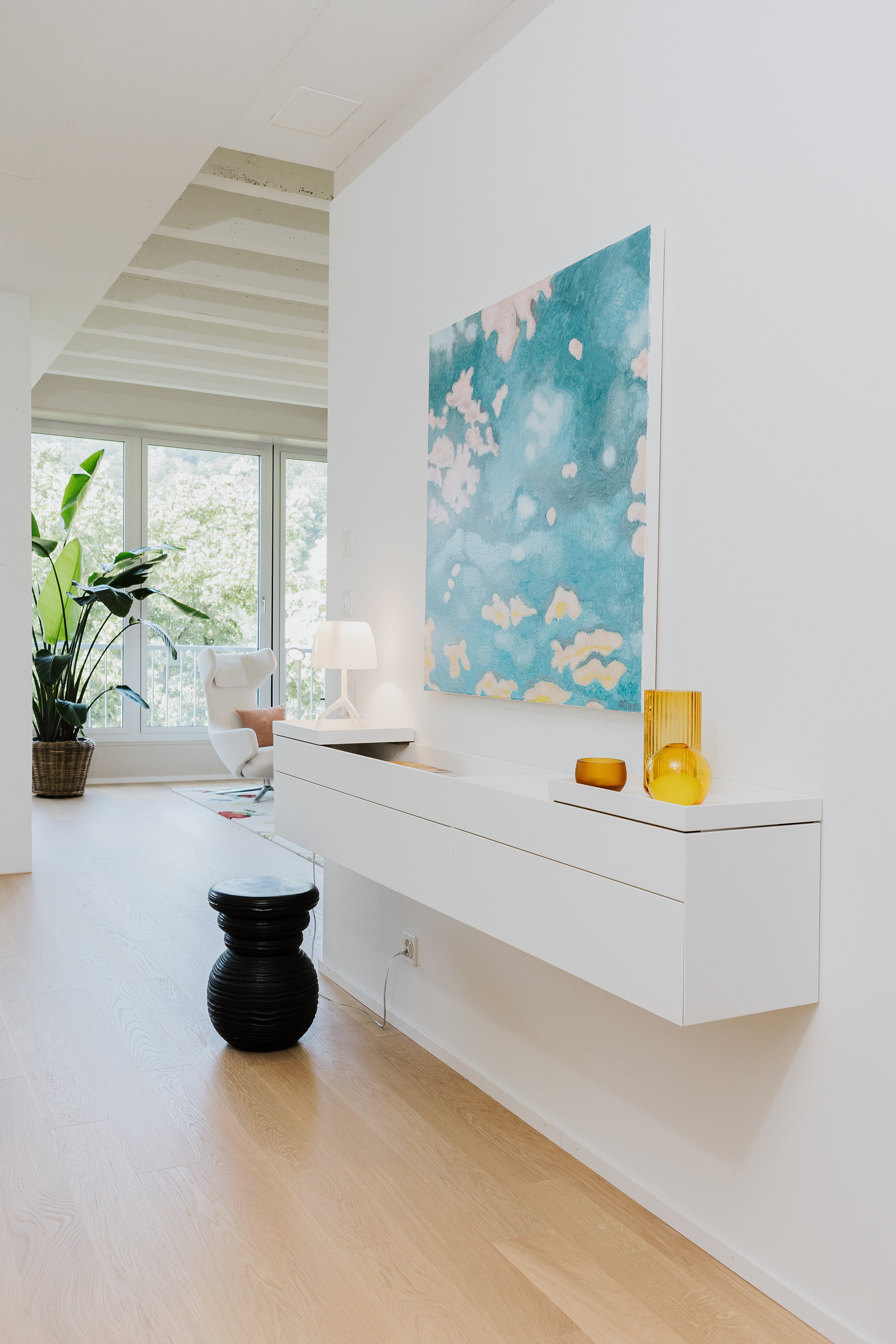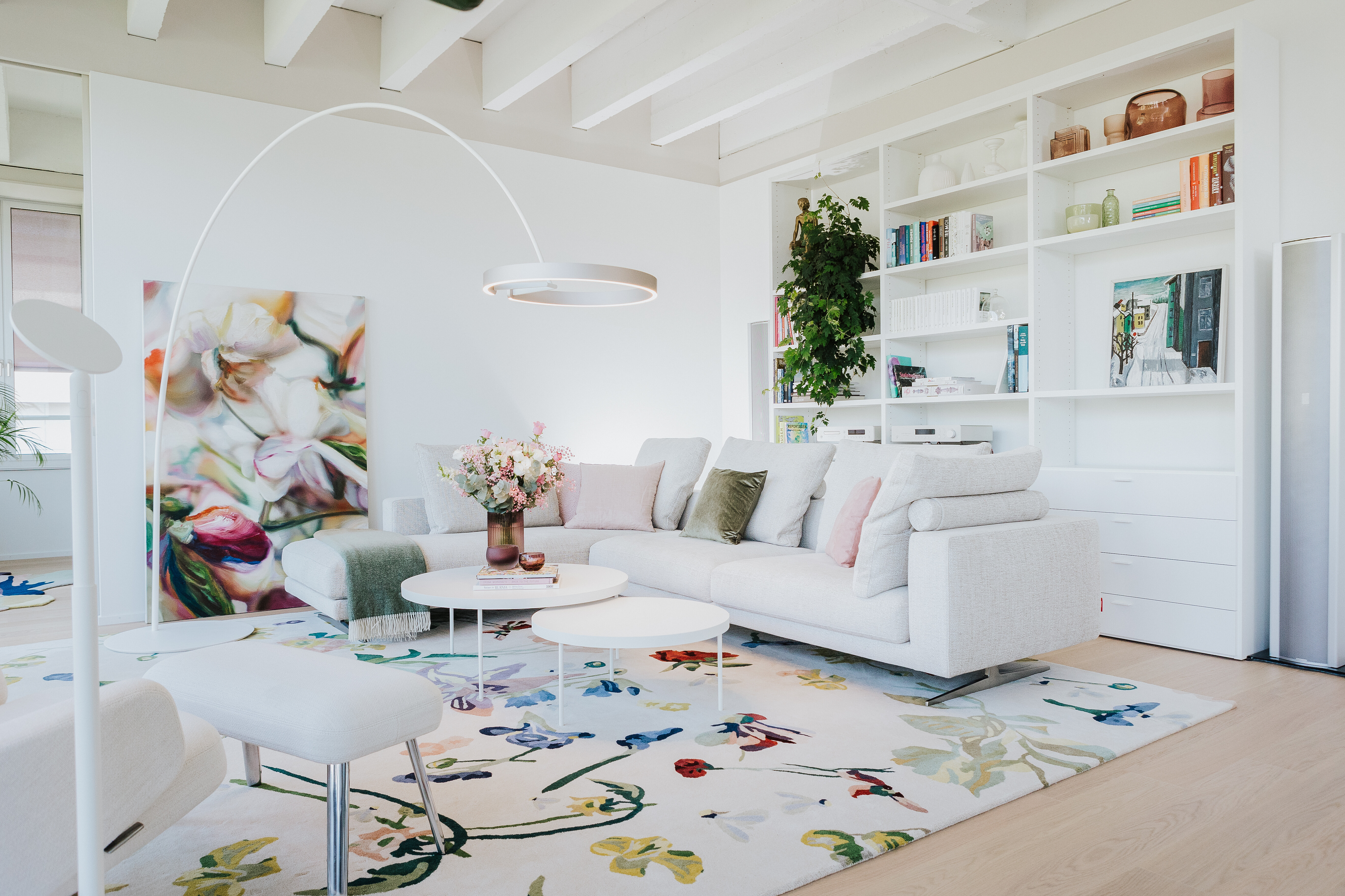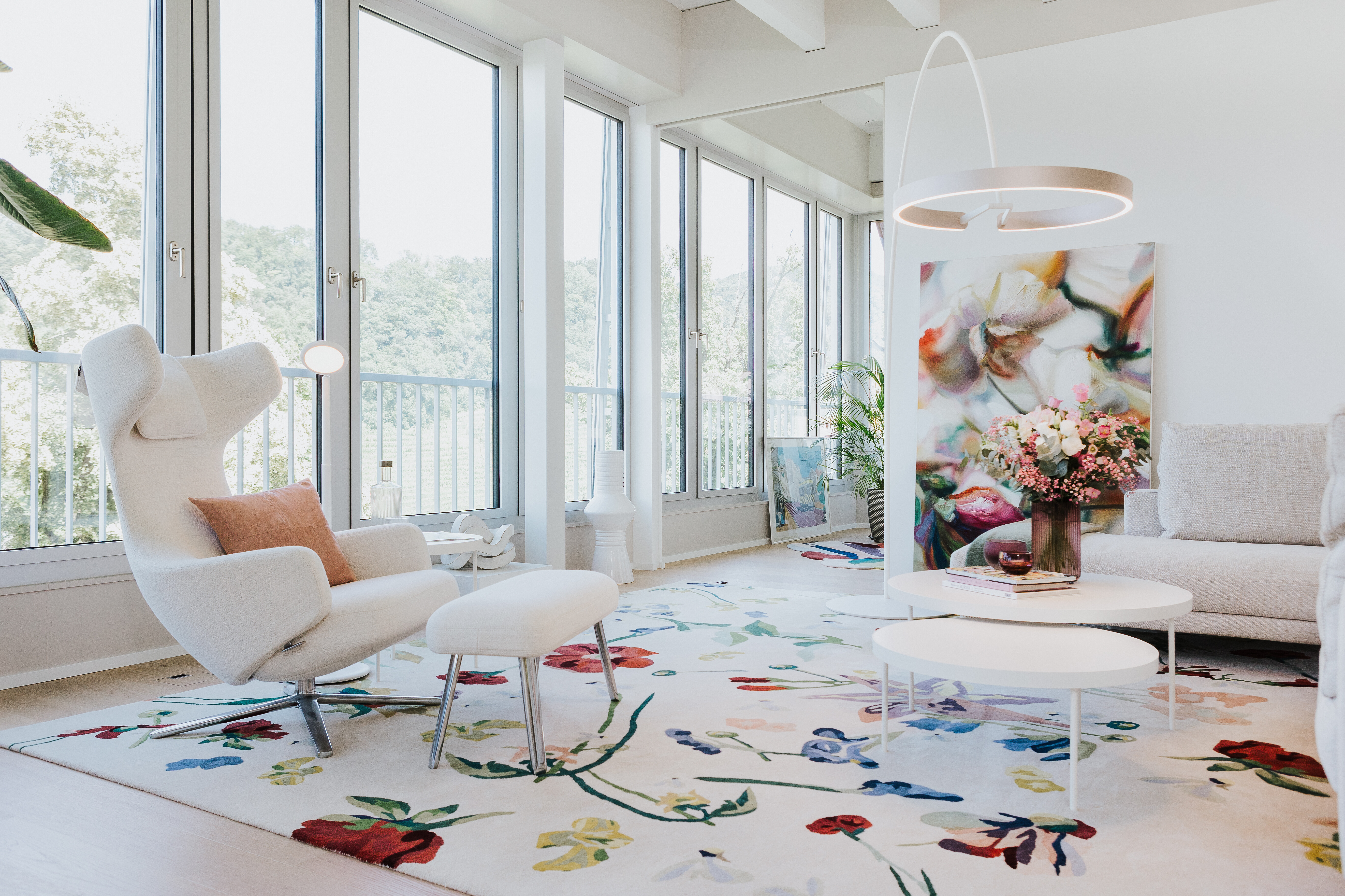 Im Wohnbereich trifft moderne Eleganz auf verspielte Leichtigkeit. Das großzügige Sofa Campiello von Flexform in Weiß wird ergänzt durch den komfortablen Sessel Grand Repos von Vitra mit passender Panchina. Zwei Couchtische Gau von Treku strukturieren die Mitte des Raumes, während der Teppich Flora von Nanimarquina mit seinem feinen Blütenmuster für lebendige Farbakzente sorgt. Ein echtes Highlight ist die Stehleuchte Mito Largo von Occhio in Weiß, die nicht nur funktional überzeugt, sondern auch visuell ein klares Statement setzt. Zusammen entsteht ein harmonischer Raum, der Ruhe und Charakter ausstrahlt.