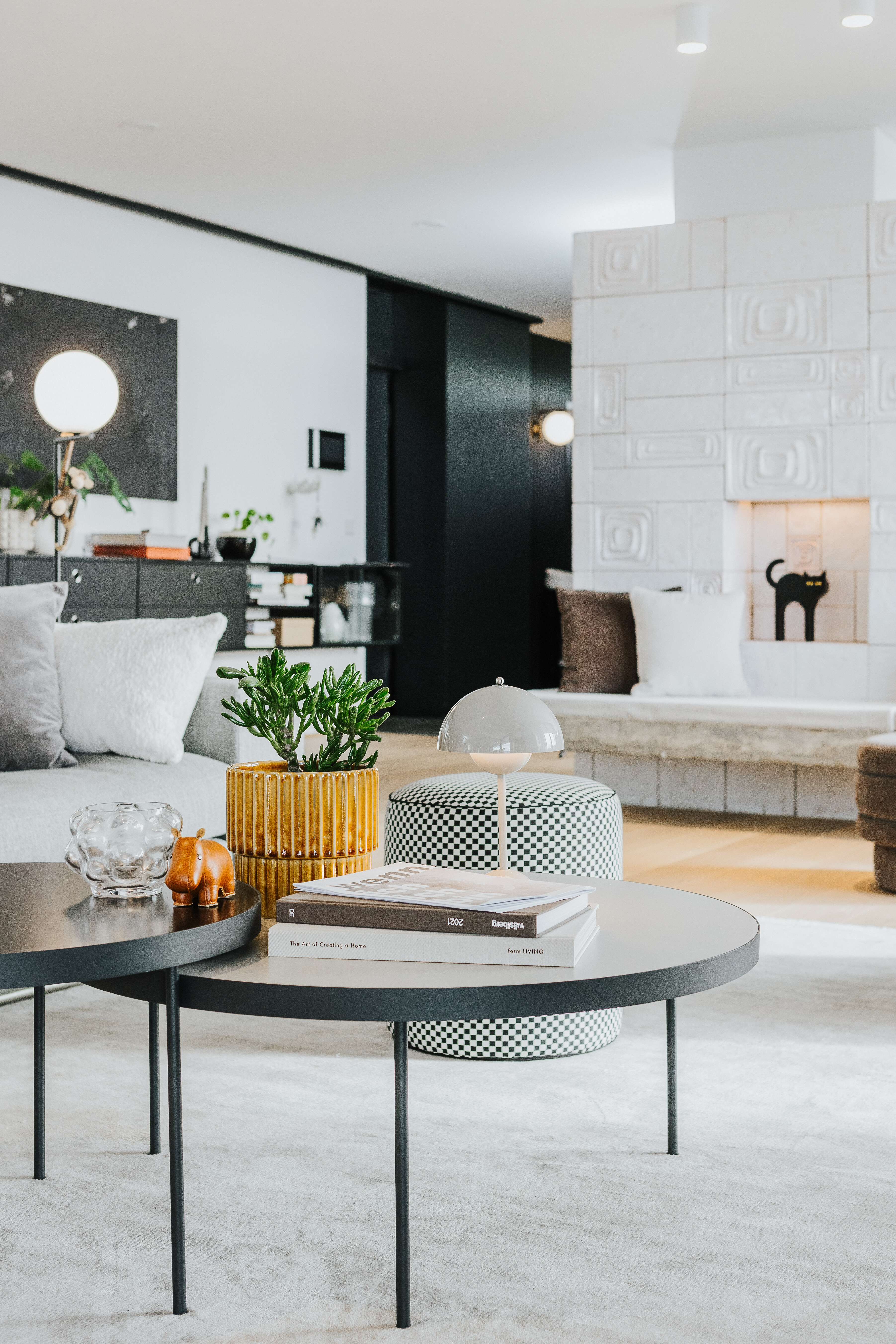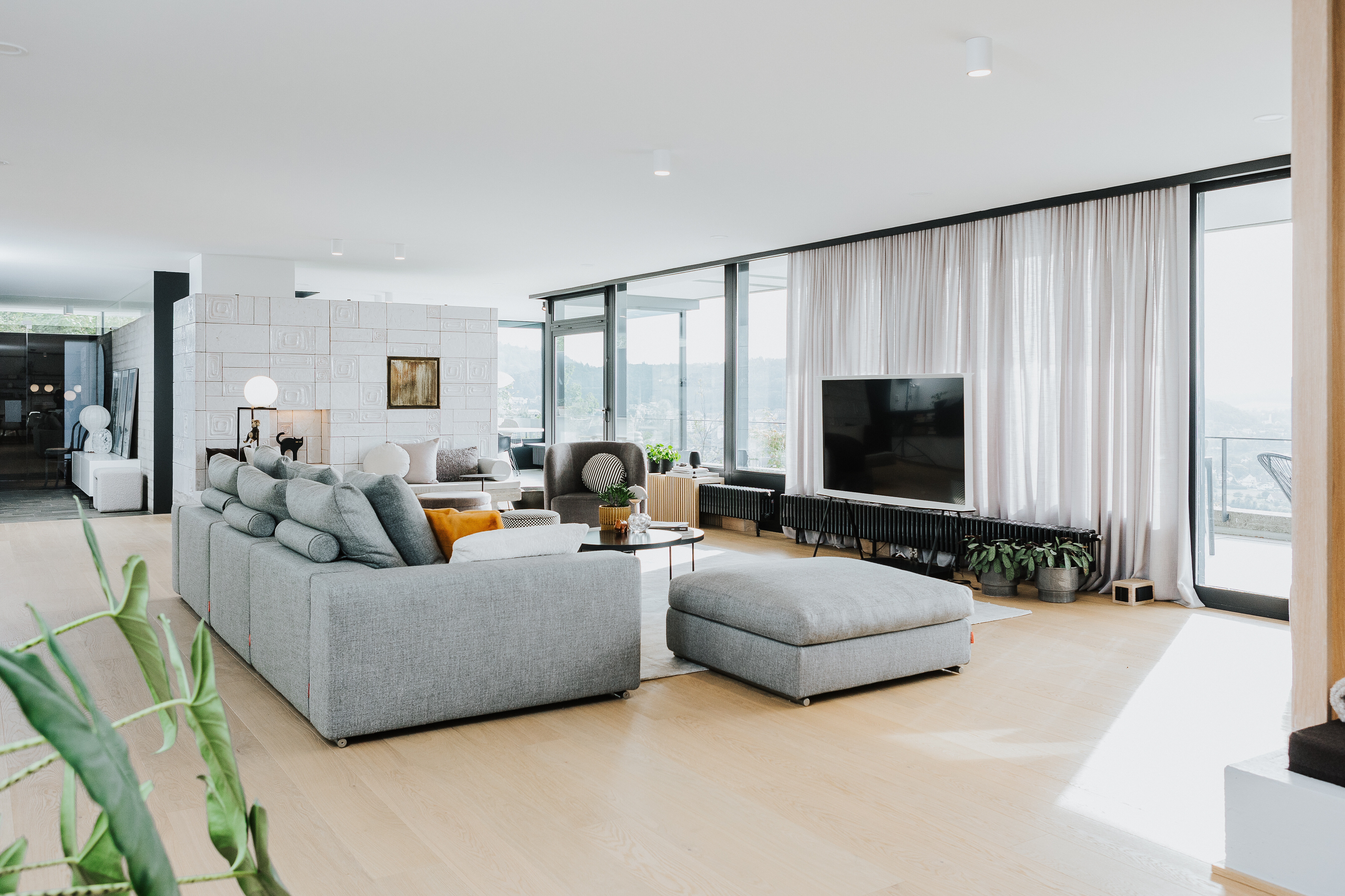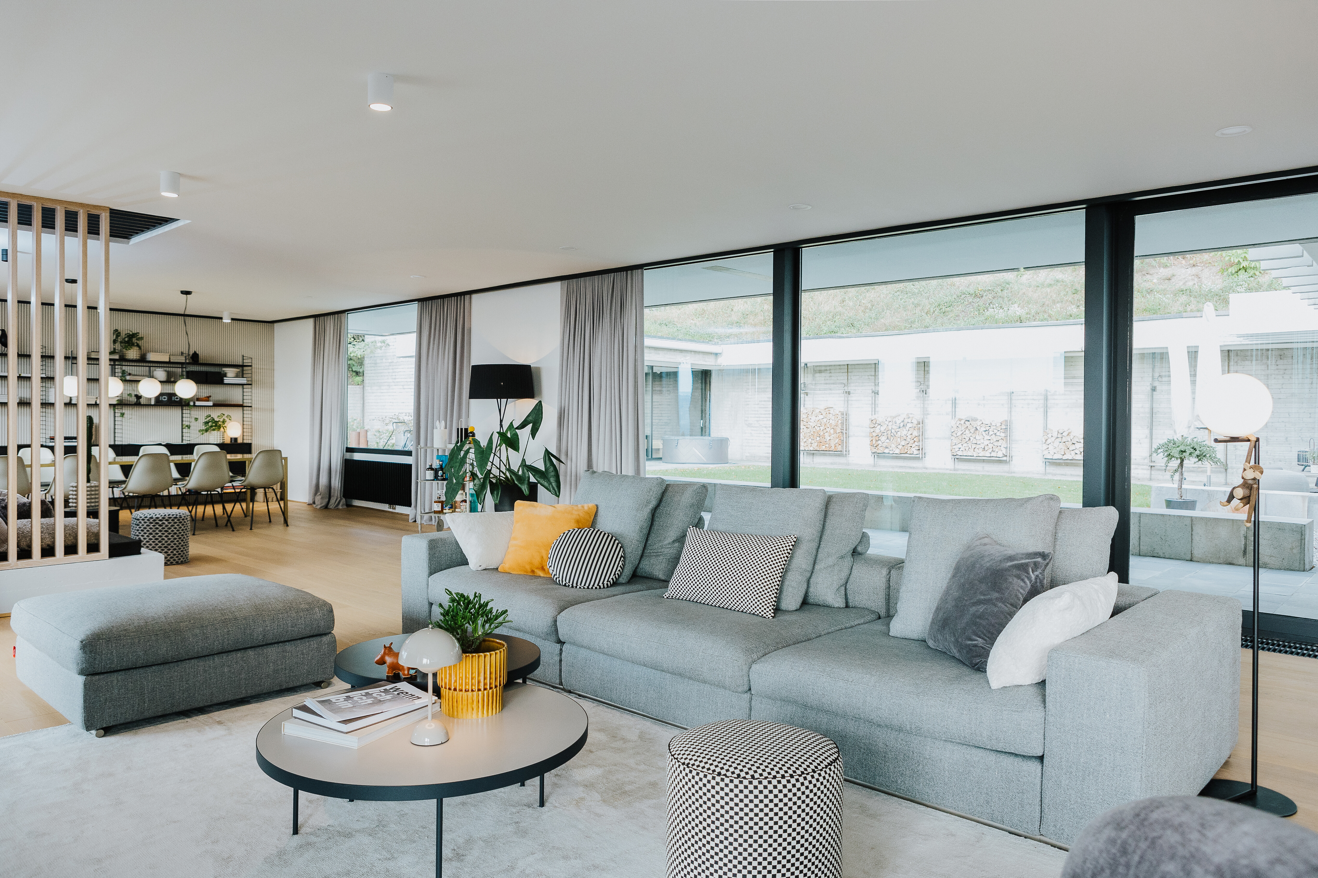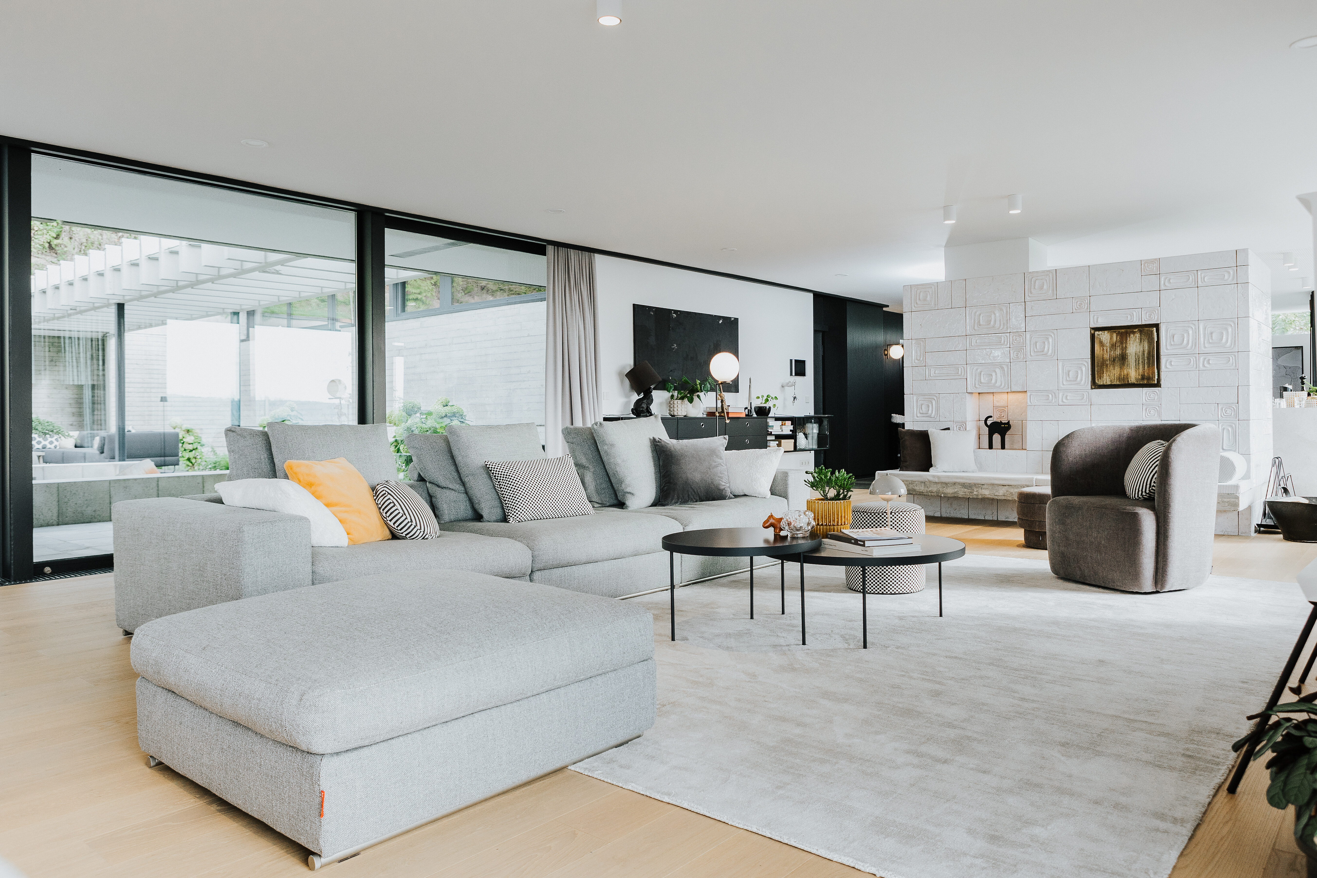 Im Mittelpunkt steht eine großformatige Sofalandschaft in hellem Grau, die mit ihrem klaren Volumen Ruhe in den Raum bringt. Ein farblich abgestimmter Sessel in hellem Braun ergänzt das Ensemble und unterstreicht den wohnlichen Charakter. Dunkle, runde Couchtische setzen einen kontrastierenden Akzent und bieten Fläche für Bücher, Getränke oder kleine Alltagsrituale. Auf einem der Tische sorgt eine hell getönte Flowerpot Tischleuchte von &Tradition für weiches Licht – funktional und zugleich ein gestalterisches Detail, das Leichtigkeit und Stil verbindet.