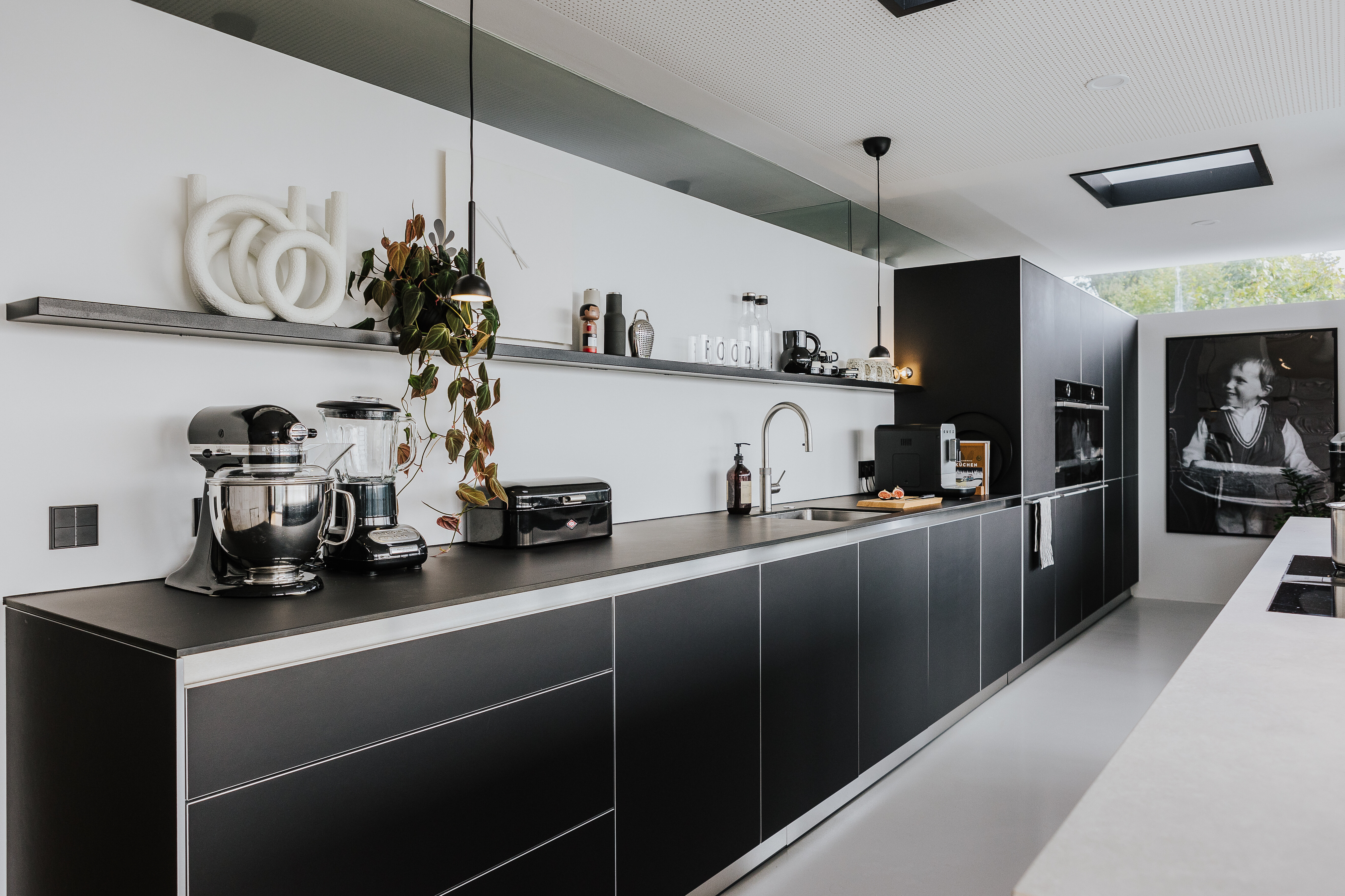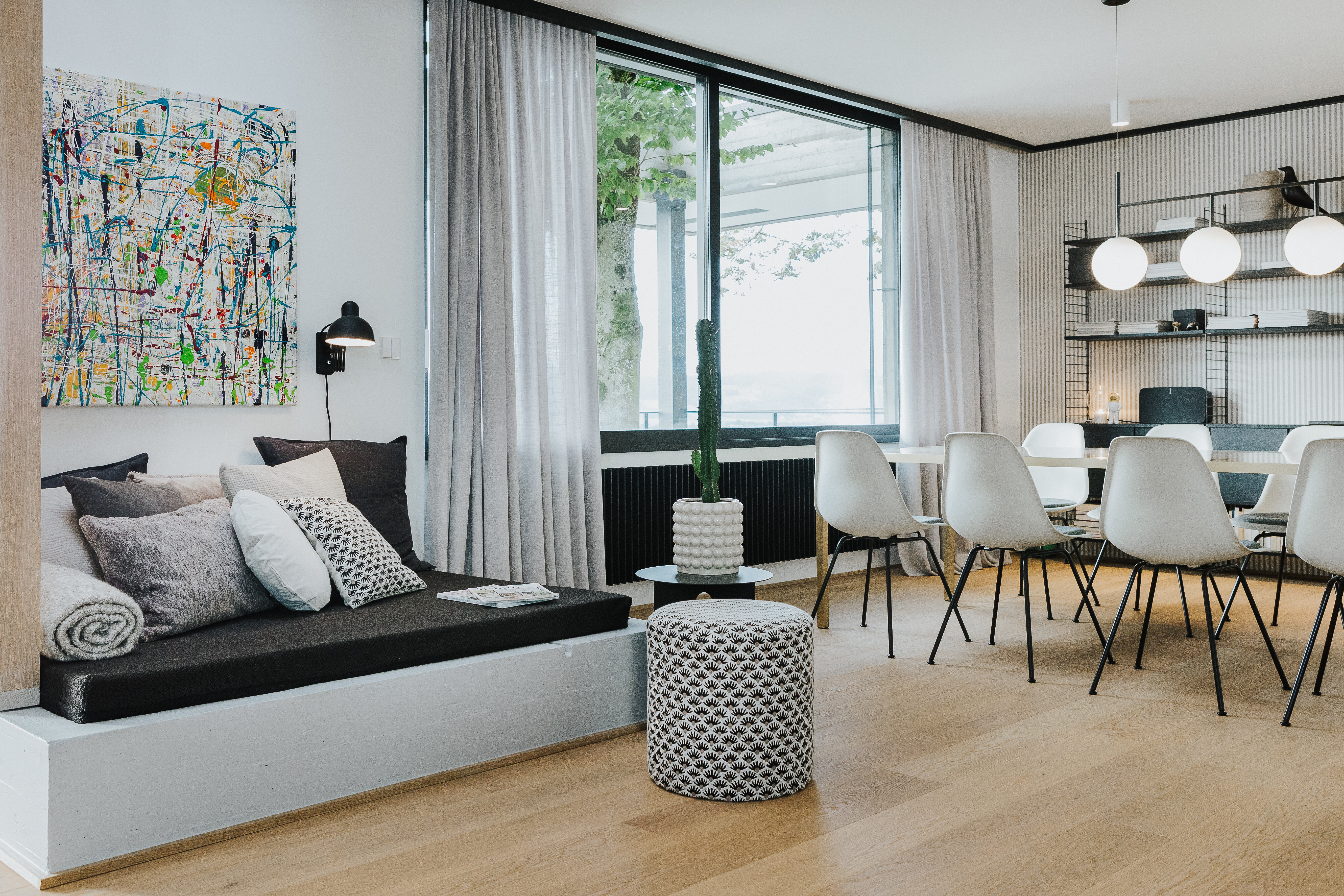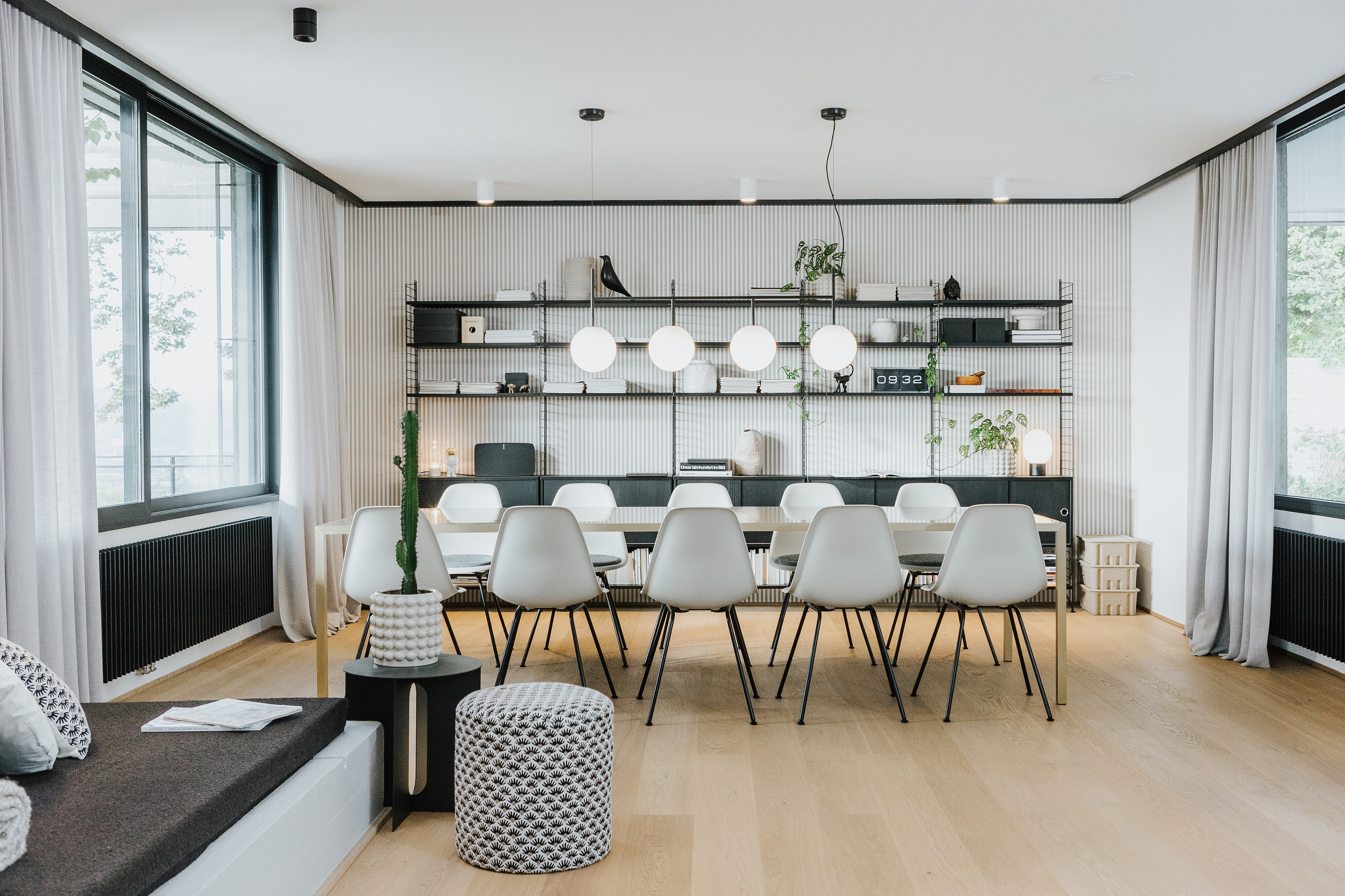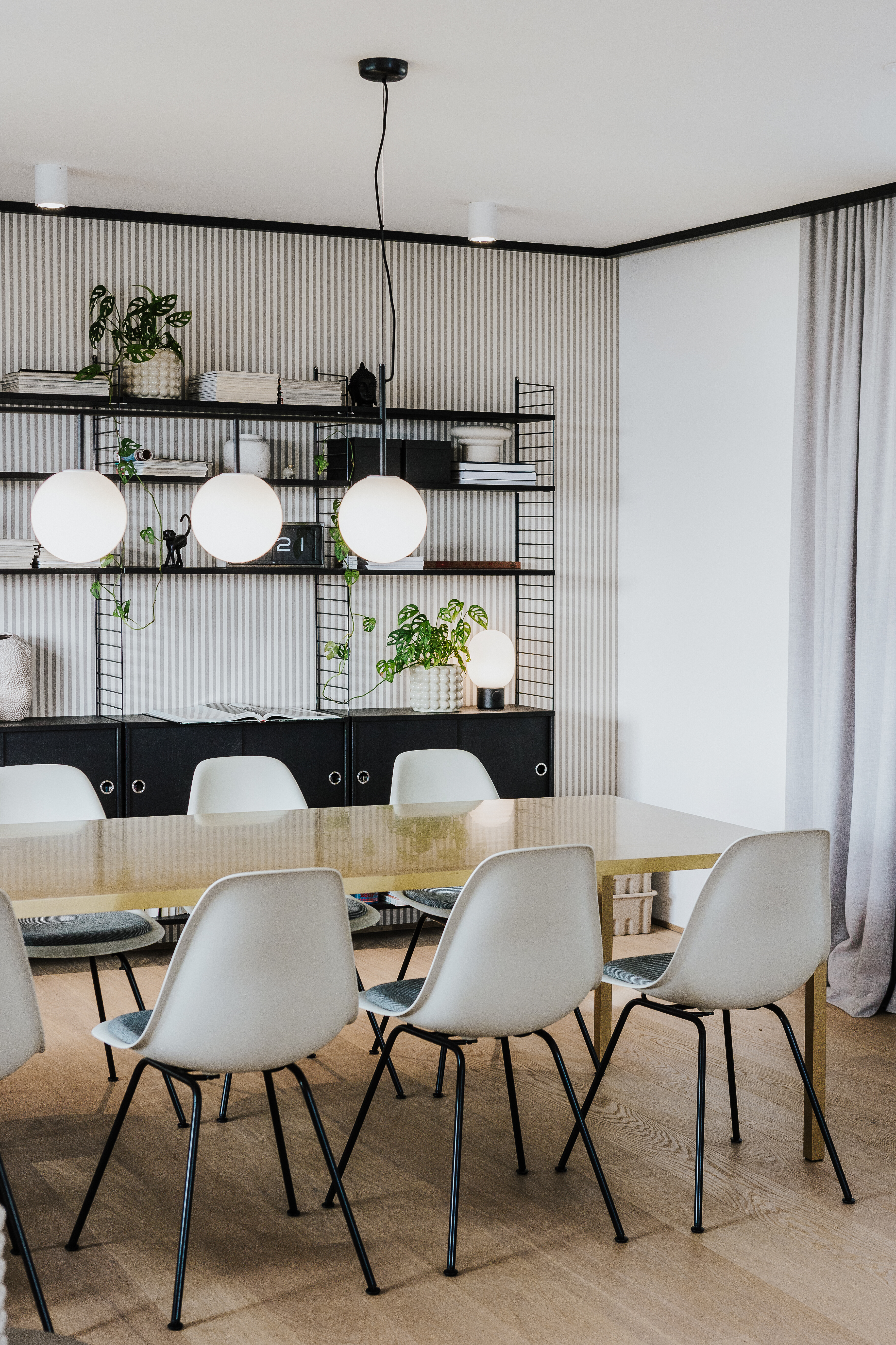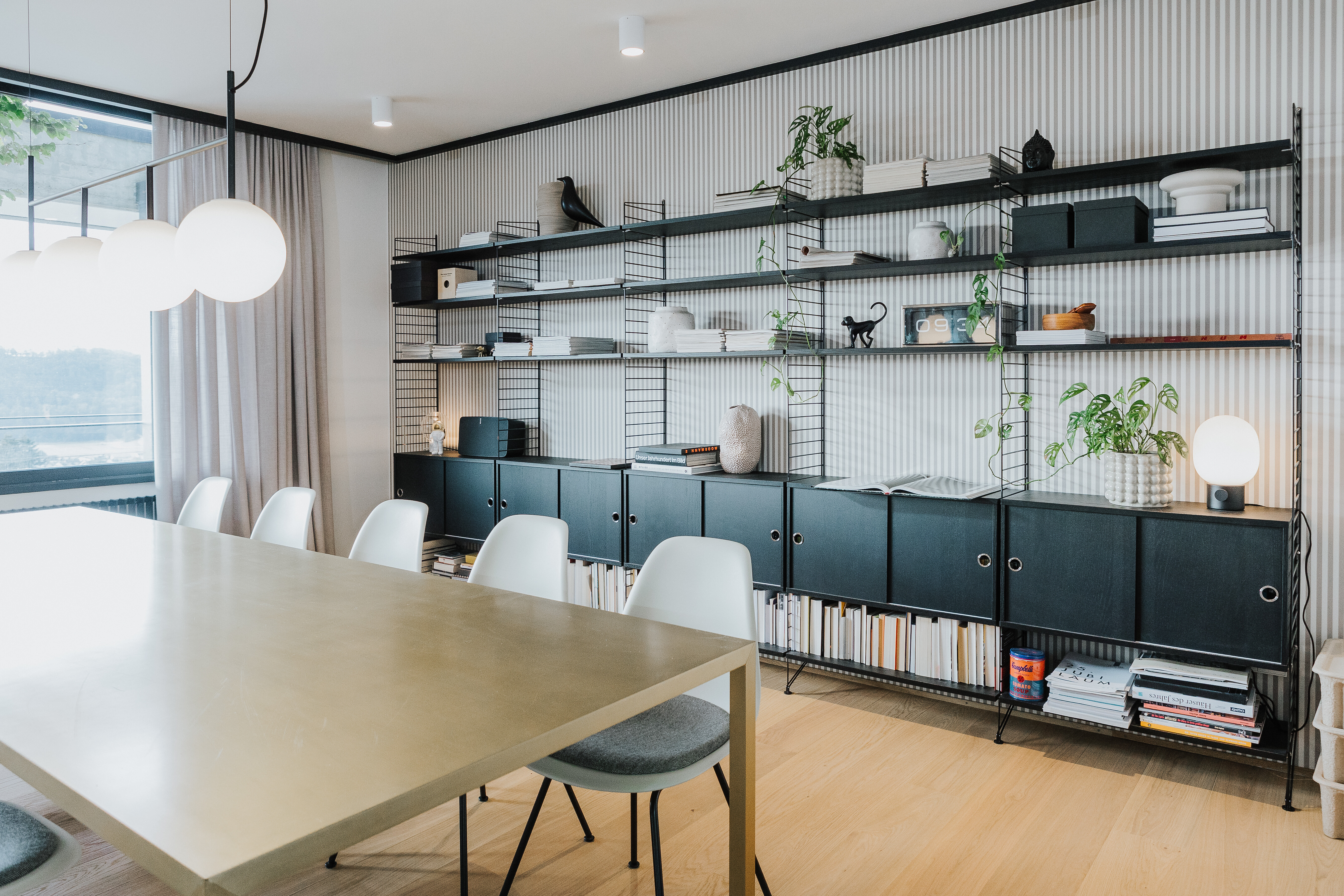 Ein schwarzes String System Regal von String Furniture sorgt entlang der Wand für viel Stauraum – offen, leicht und individuell konfigurierbar. Dekorative Objekte, Geschirr oder Bücher finden hier ebenso Platz wie persönliche Akzente, die dem Raum Leben verleihen. Eine Hängeleuchte mit runden Leuchtelementen sorgt für gleichmäßiges Licht über dem gesamten Tisch. Grüne Pflanzen setzen bewusst frische Akzente – sie bringen Natürlichkeit in den klar gestalteten Raum und ergänzen das Schwarz-Weiß-Schema um eine sanfte Lebendigkeit.