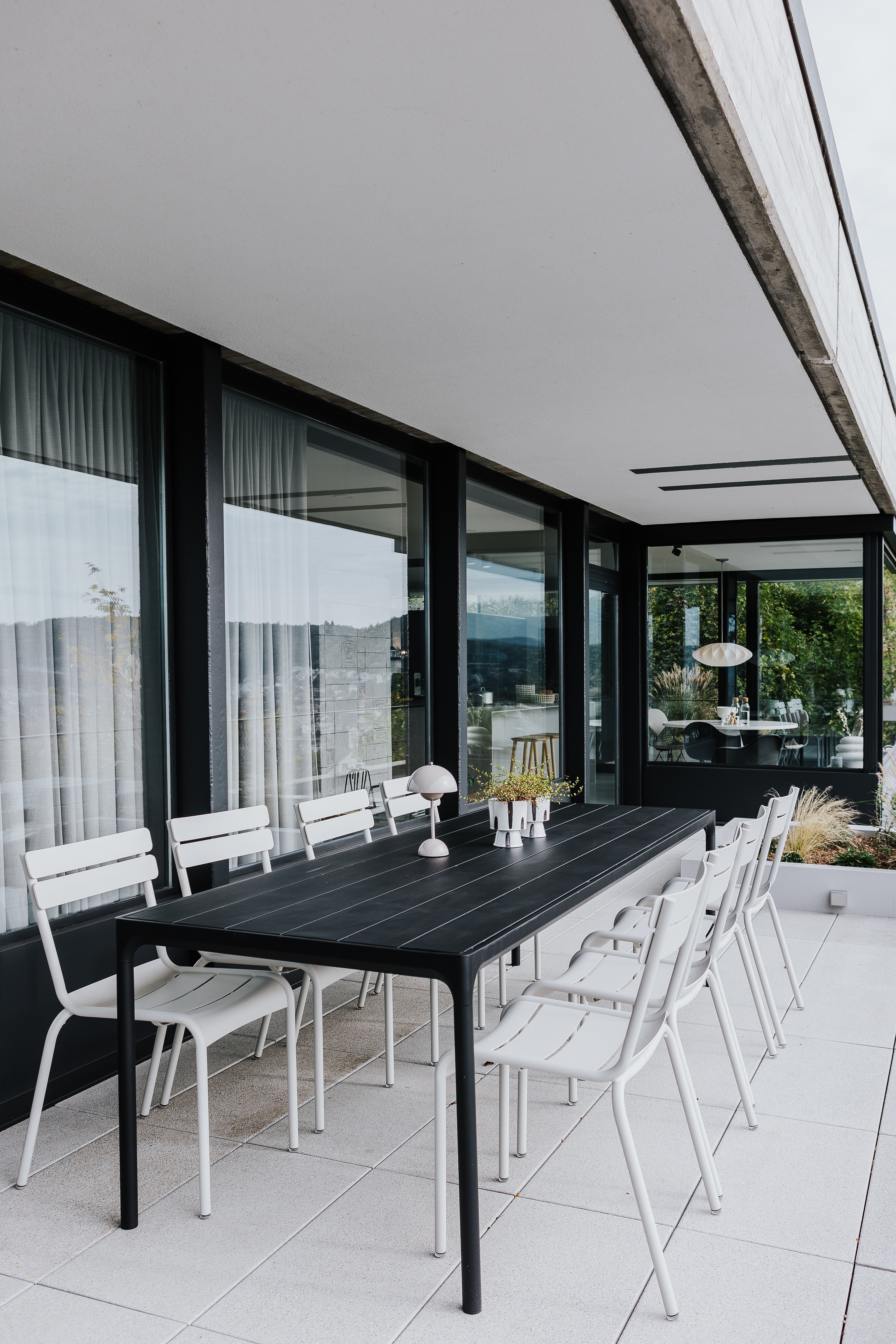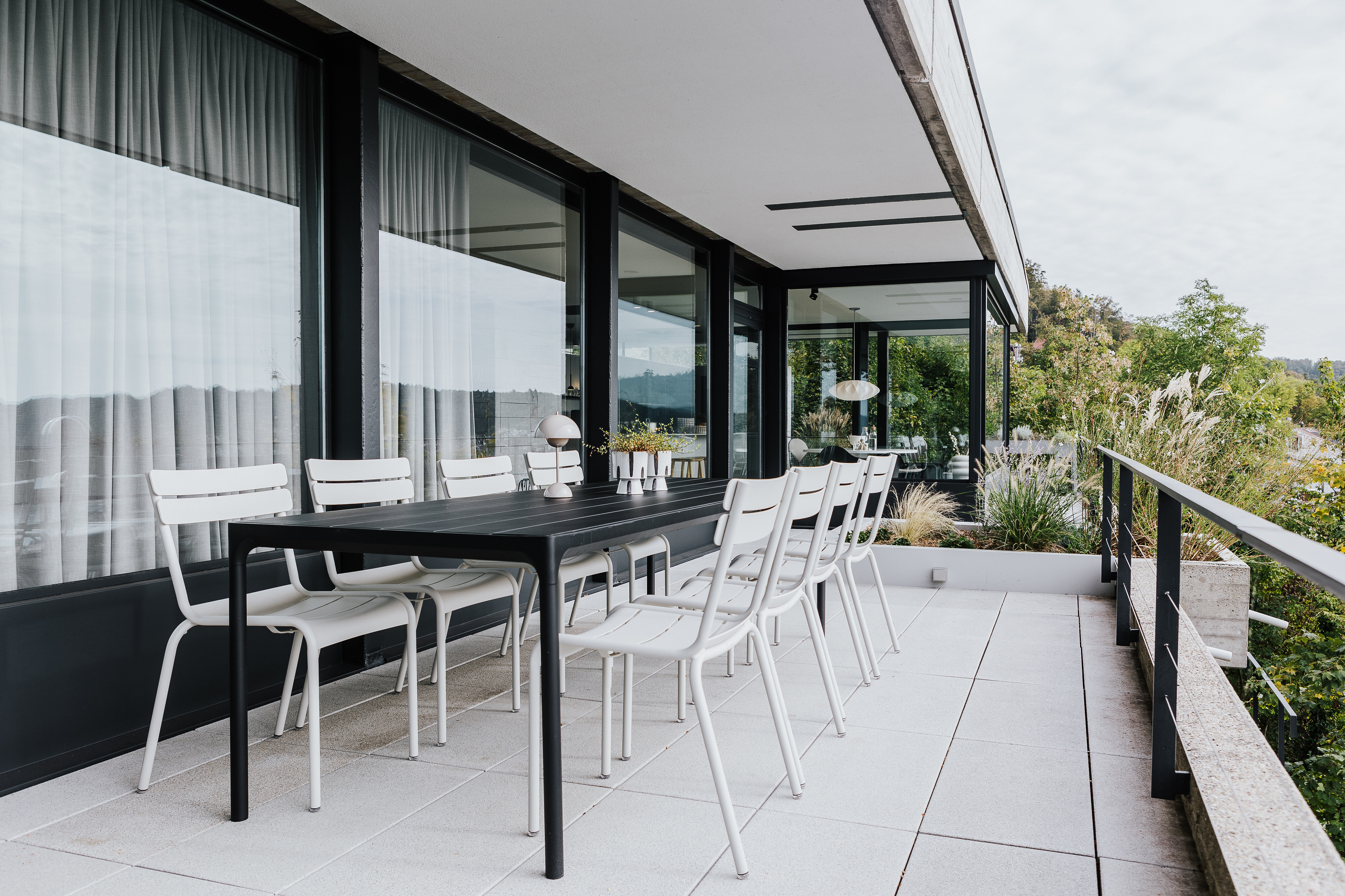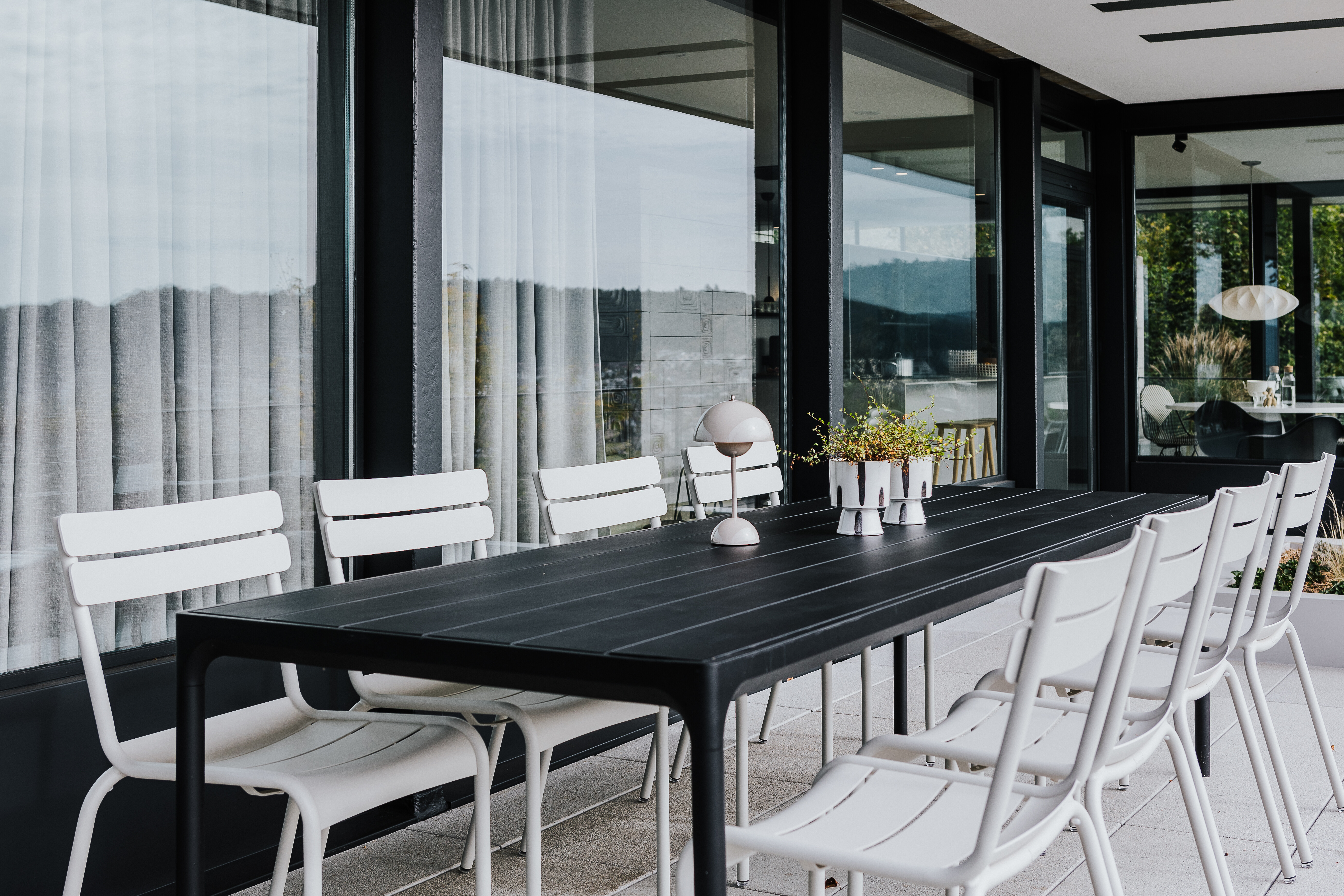 Die angrenzende Terrasse erweitert den Wohnraum ins Freie und bietet mit einem großen, schwarzen Tisch und insgesamt acht Sitzplätzen genügend Raum für gesellige Runden unter freiem Himmel. Das zurückhaltende Farbspiel in Schwarz und Weiß greift die Gestaltung des Innenbereichs auf und führt sie stimmig nach außen weiter. Die weißen Luxembourg Stühle von Fermob bringen Leichtigkeit und klare Linien, während der schwarze Tisch durch seine schlichte Präsenz Struktur gibt.