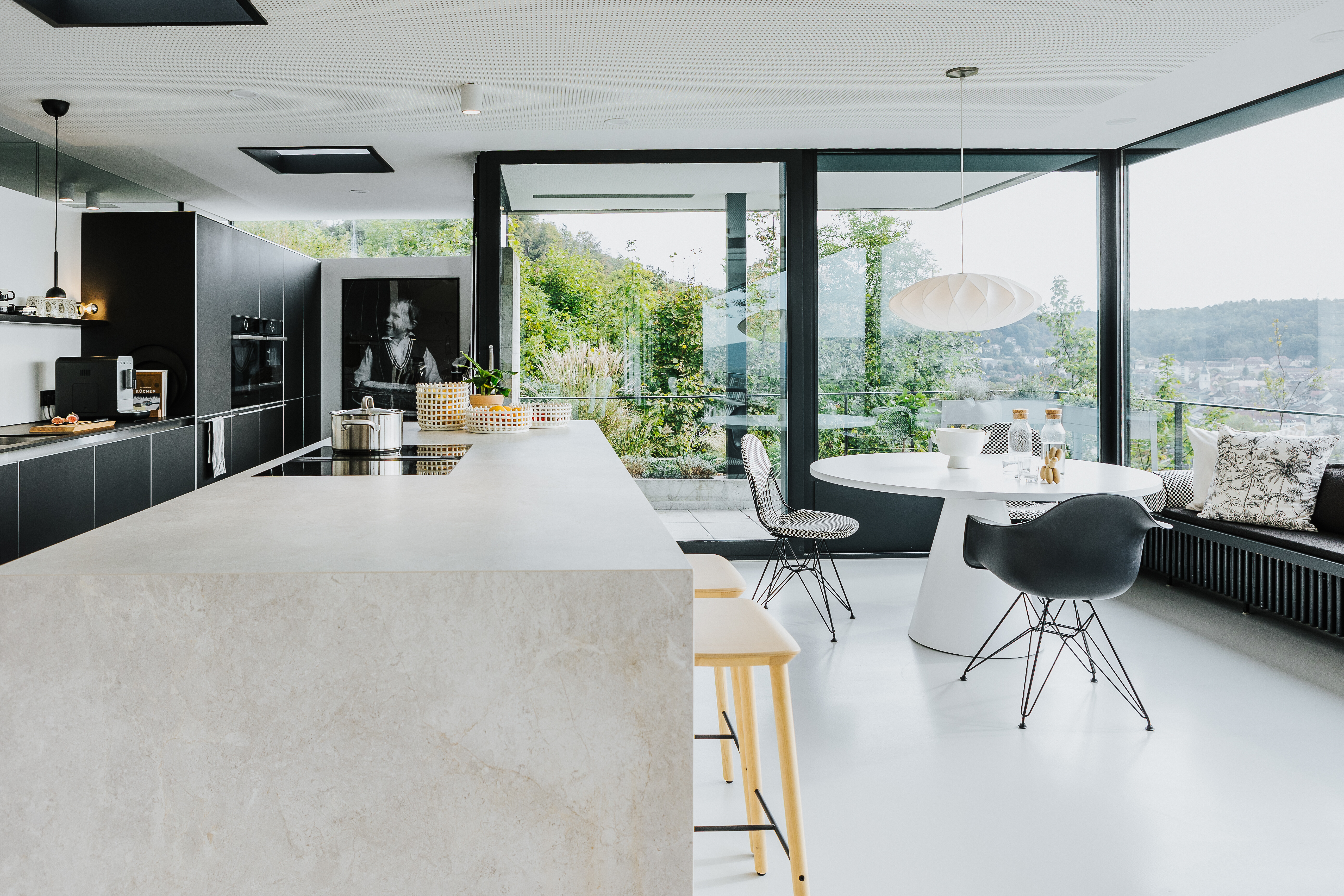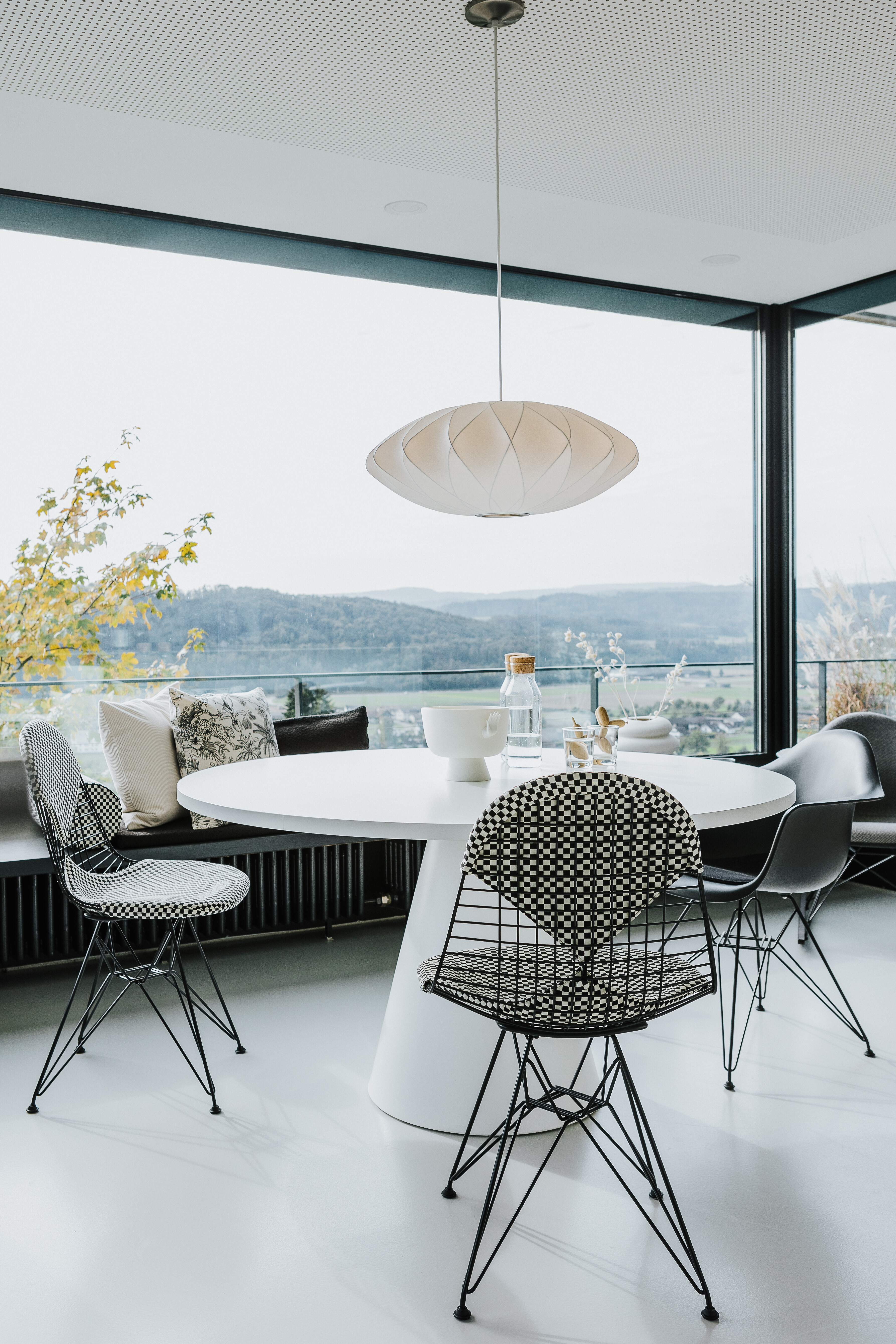 Direkt an die Küche schließt sich ein kleiner, runder Essplatz an – perfekt für Frühstück, schnelle Mahlzeiten oder entspannte Gespräche im Alltag. Der Essbereich verfügt über eine Fensterbank und nutzt den Raum effizient, ohne seine Offenheit zu verlieren. Zwei Wire Chairs DKR-2 von Vitra mit schwarz-weiß kariertem Muster greifen das übergeordnete Farbkonzept subtil auf, ergänzt durch einen schwarzen Eames Plastic Armchair DAR. Die Kombination wirkt grafisch klar, gleichzeitig wohnlich und funktional. Die Aussicht auf den Rhein macht diesen Platz zu einem der charmantesten Orte des Hauses – nah an der Küche, aber weit im Blick.
