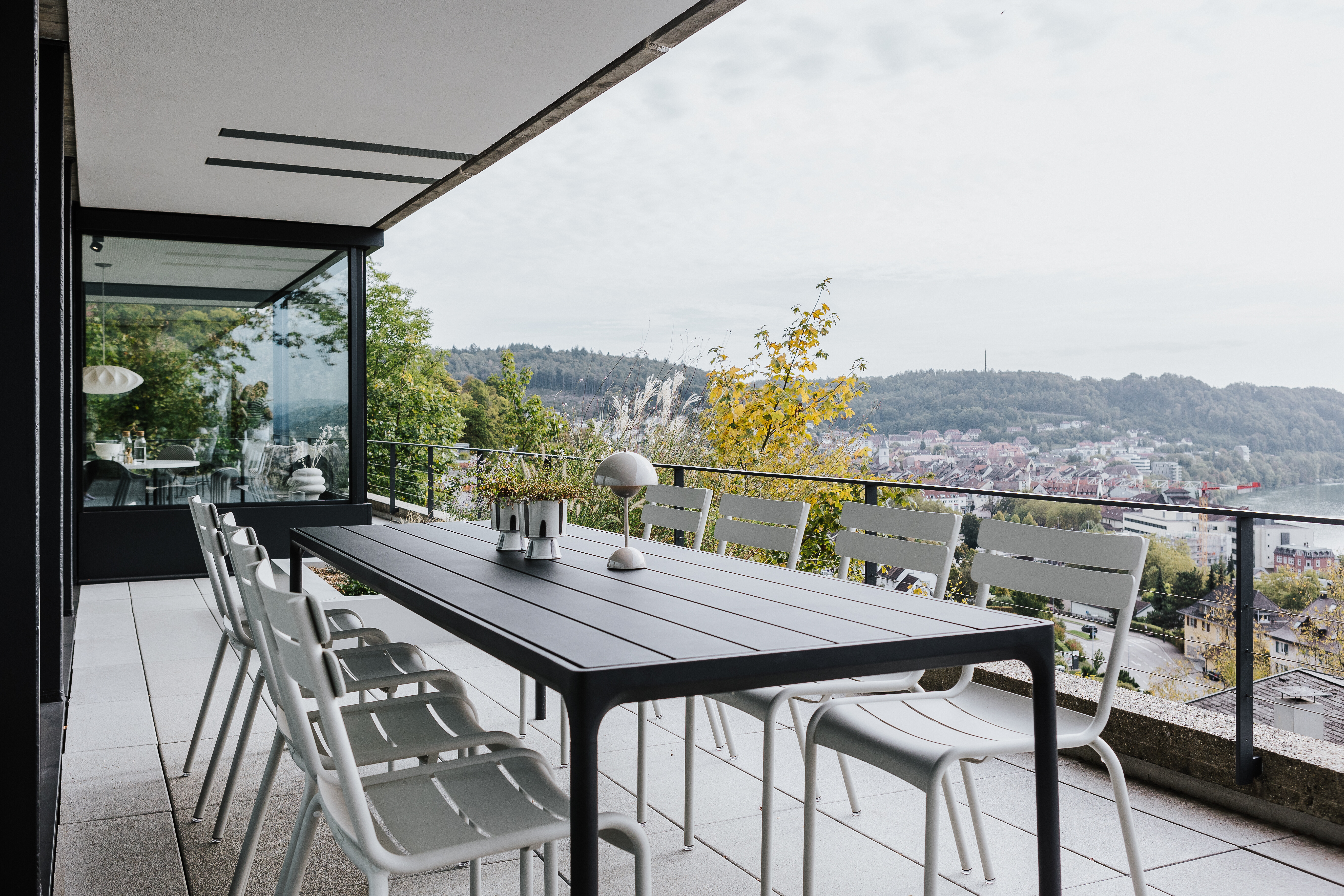 Eine Flowerpot Leuchte von &Tradition ergänzt das Ensemble um ein feines Detail – funktional und stilsicher zugleich. Die großzügige Aussicht über den Rhein bildet die natürliche Kulisse dieser ruhigen Außenfläche. Ob für ein gemeinsames Essen, ein Glas Wein bei Sonnenuntergang oder einen Moment der Stille: Die Terrasse wird zum Ort des Rückzugs und der Begegnung – mit Weitblick und gestalterischer Klarheit.