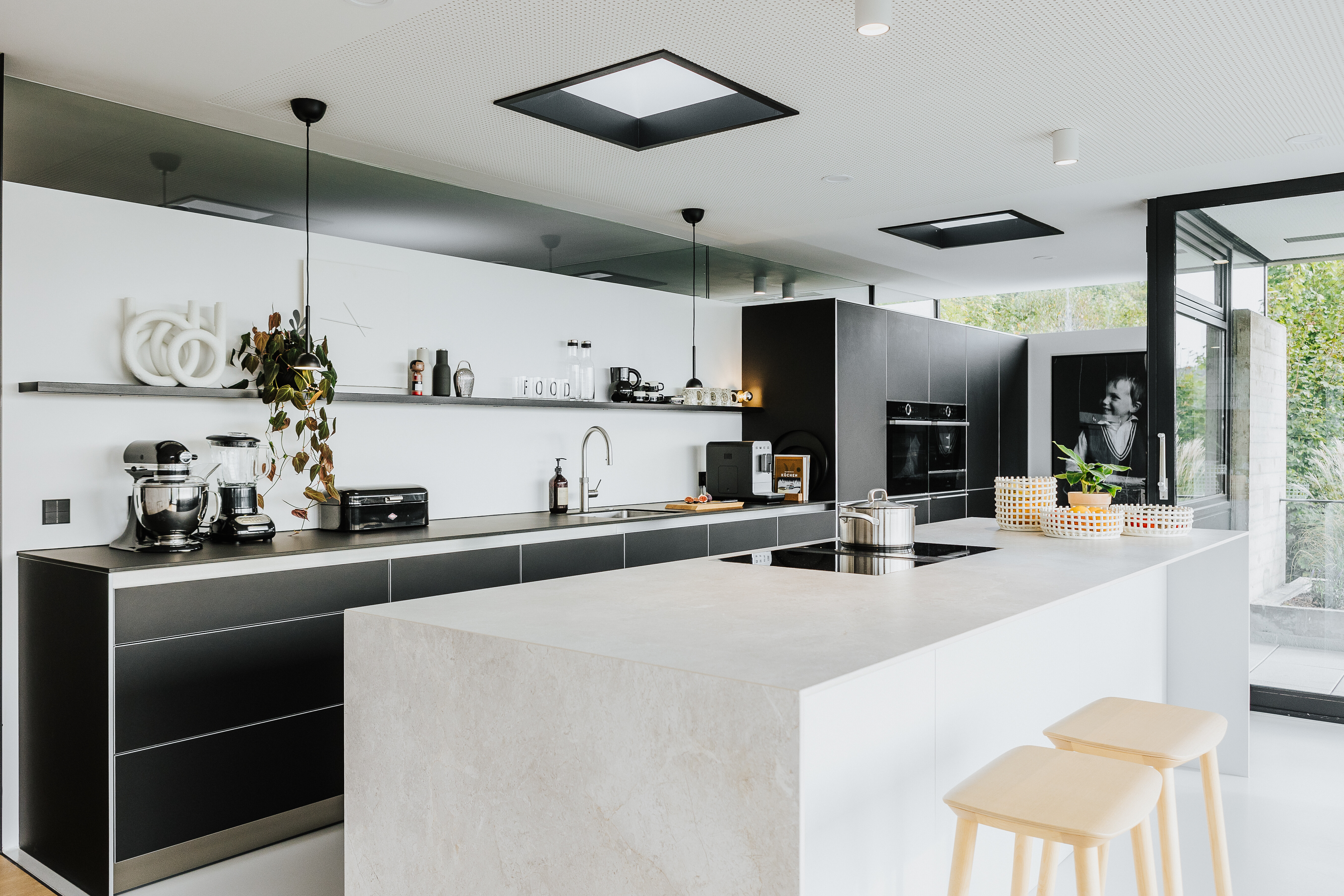 Im linken Flügel des Hauses verbindet die Küche elegante Zurückhaltung mit hoher Funktionalität. Eine dunkle Rückwand trifft hier auf eine helle Arbeitsinsel aus Stein – ein spannungsvolles Zusammenspiel, das Tiefe und Struktur in den Raum bringt. Die großflächige Fensterfront sorgt für Helligkeit und öffnet den Blick weit über den Rhein. An der integrierten Theke mit Barhockern lässt sich nicht nur arbeiten, sondern auch verweilen – mit Aussicht, Licht und Leichtigkeit.