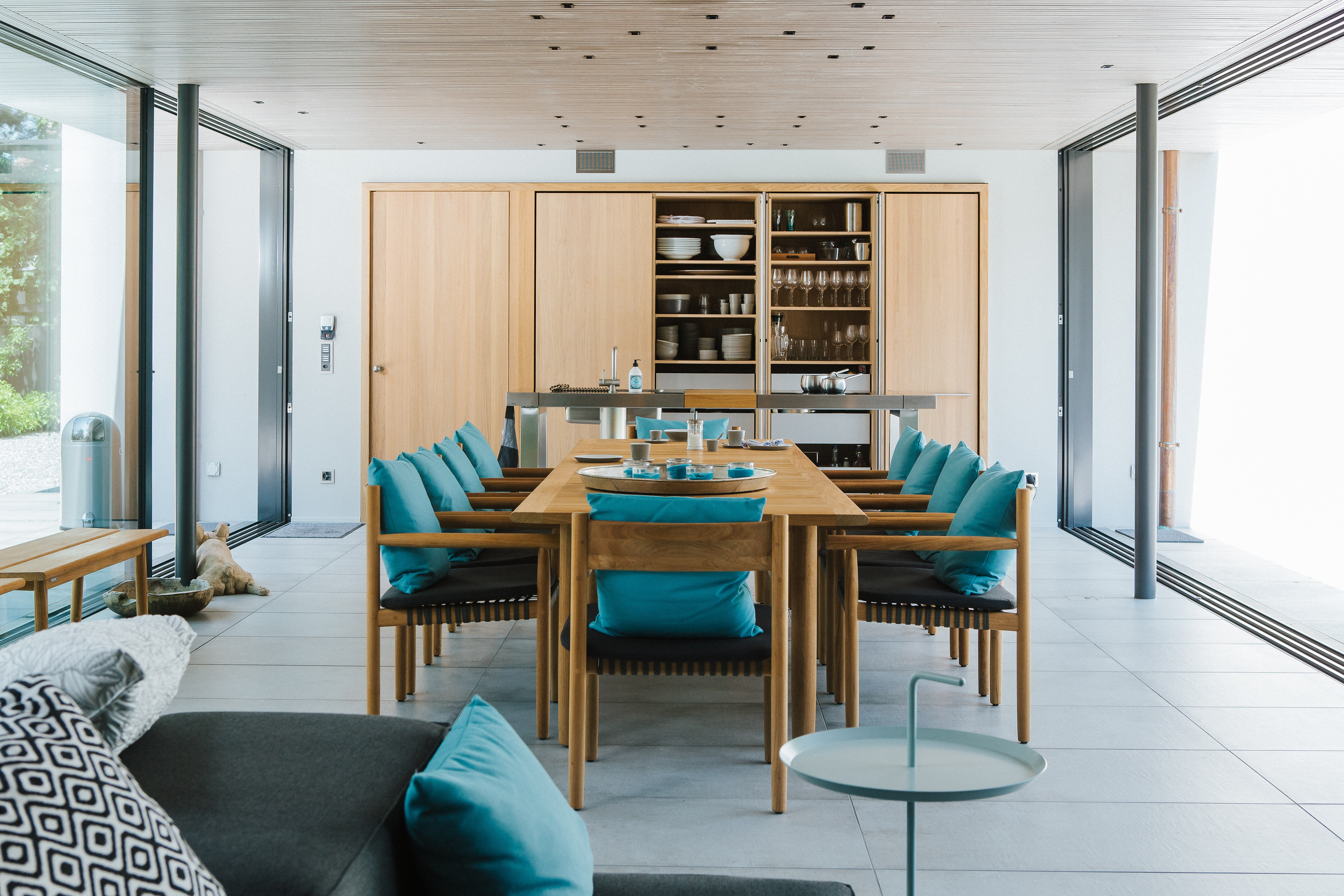 Der offene Bereich mit direktem Gartenzugang beherbergt eine weitere Esssituation: Hier wurde der Tisch Tibbo von Dedon gemeinsam mit den passenden Stühlen platziert – perfekt für ein Wohnerlebnis zwischen drinnen und draußen. Ergänzt wird dieser Übergangsraum durch das modulare Sofa Extrasoft von Living Divani, das mit seinen weichen Polstern eine entspannte Atmosphäre schafft.