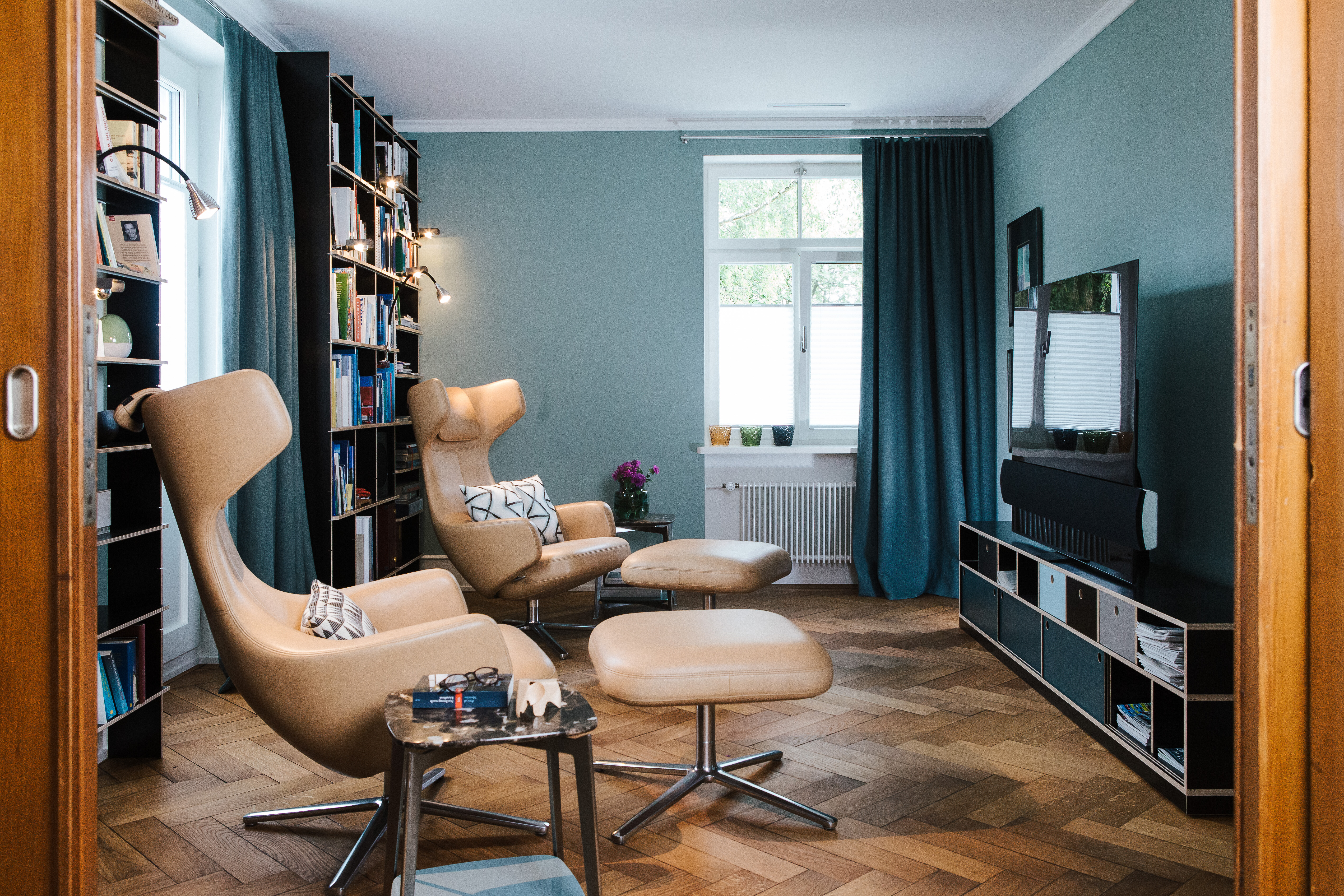 Im separaten Fernsehbereich sorgen zwei Grand Repos-Sessel von Vitra für komfortables Sitzen. Die zurückhaltenden FNP-Regale von Nils Holger Moormann schaffen Stauraum und strukturieren den Raum mit grafischer Leichtigkeit. Das gesamte Einrichtungskonzept lebt von sorgfältig ausgewählten Klassikern und präzise gesetzten Akzenten – stilvoll, funktional und mit Gespür für architektonische Klarheit.
