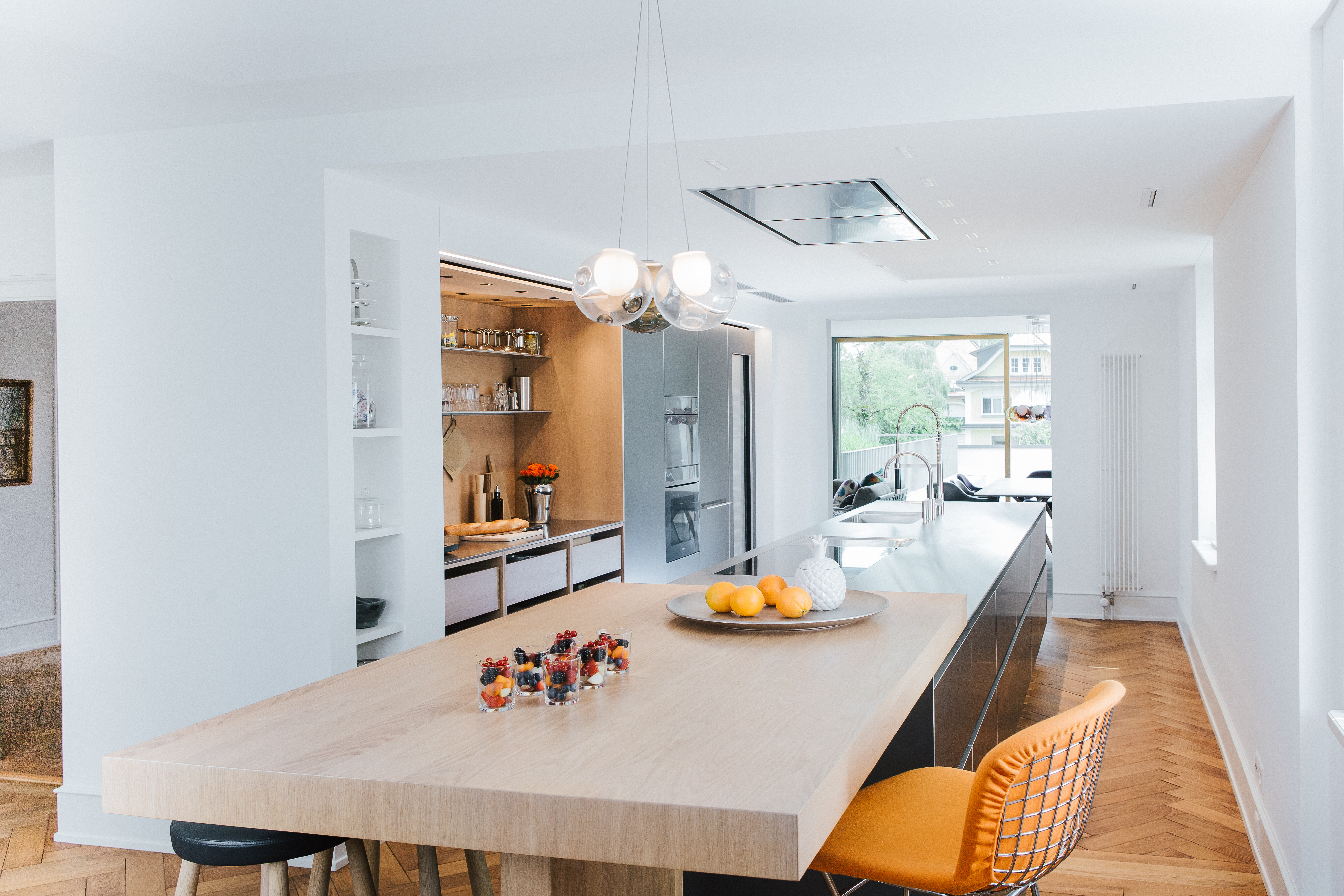 Entdecken Sie Möbel von Living DivaniIm lichtdurchfluteten Herzstück des Hauses findet sich der filigrane Esstisch X2 von Mobimex. Mit seiner schlanken, hell gehaltenen Tischplatte und dem zurückhaltenden Gestell fügt er sich dezent, aber charakterstark in das Gesamtbild ein. Die dazu kombinierten Saarinen-Stühle von Knoll International bringen mit ihrer ikonischen Formgebung klassische Eleganz ins Spiel und greifen die weichen Linien des Tischs harmonisch auf. Über dem Ensemble sorgt die farbintensive Pendelleuchte 28 Cluster von Bocci für eine ausdrucksstarke Inszenierung – jede Glaskugel ein leuchtendes Unikat, das dem Raum eine verspielte Note verleiht.