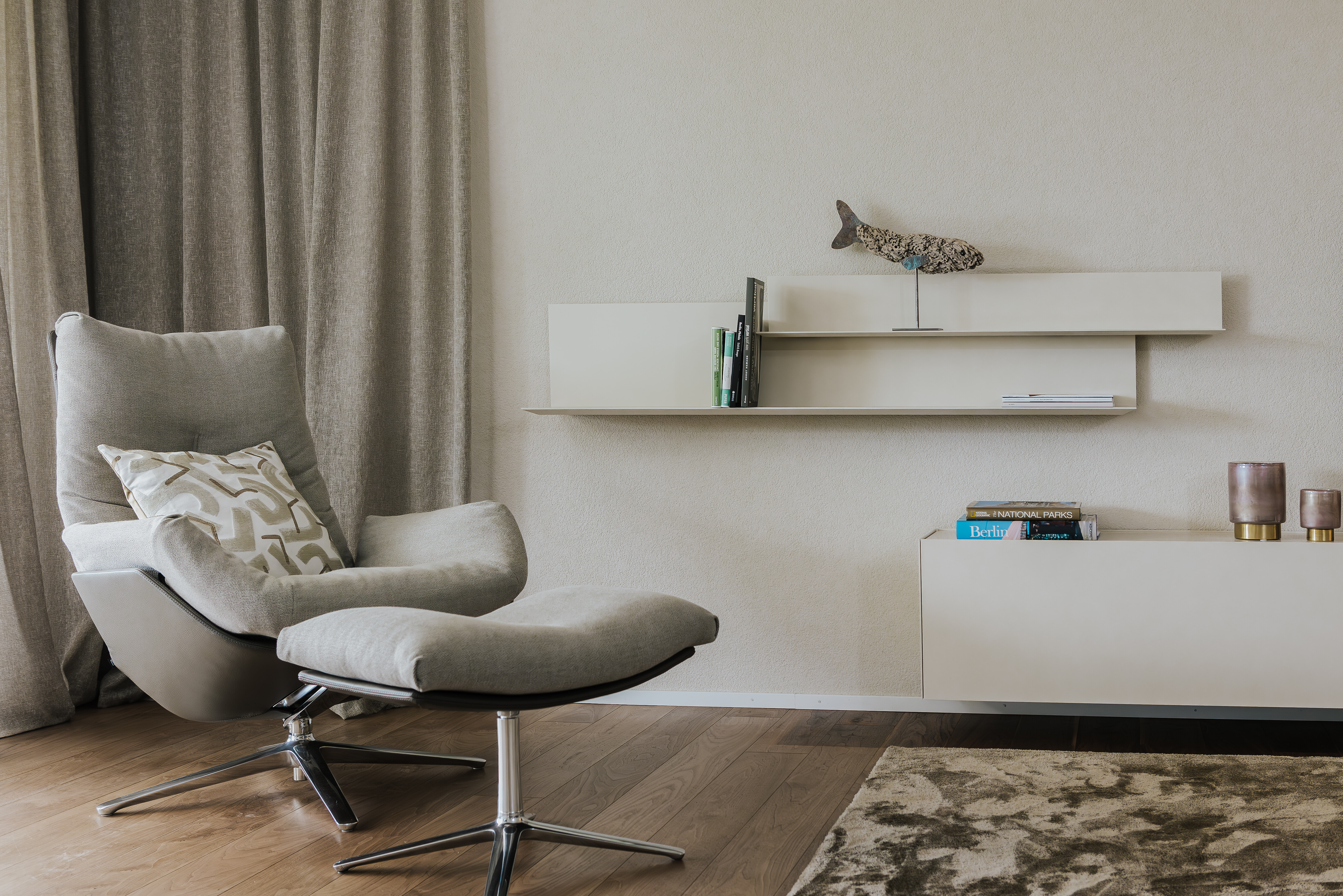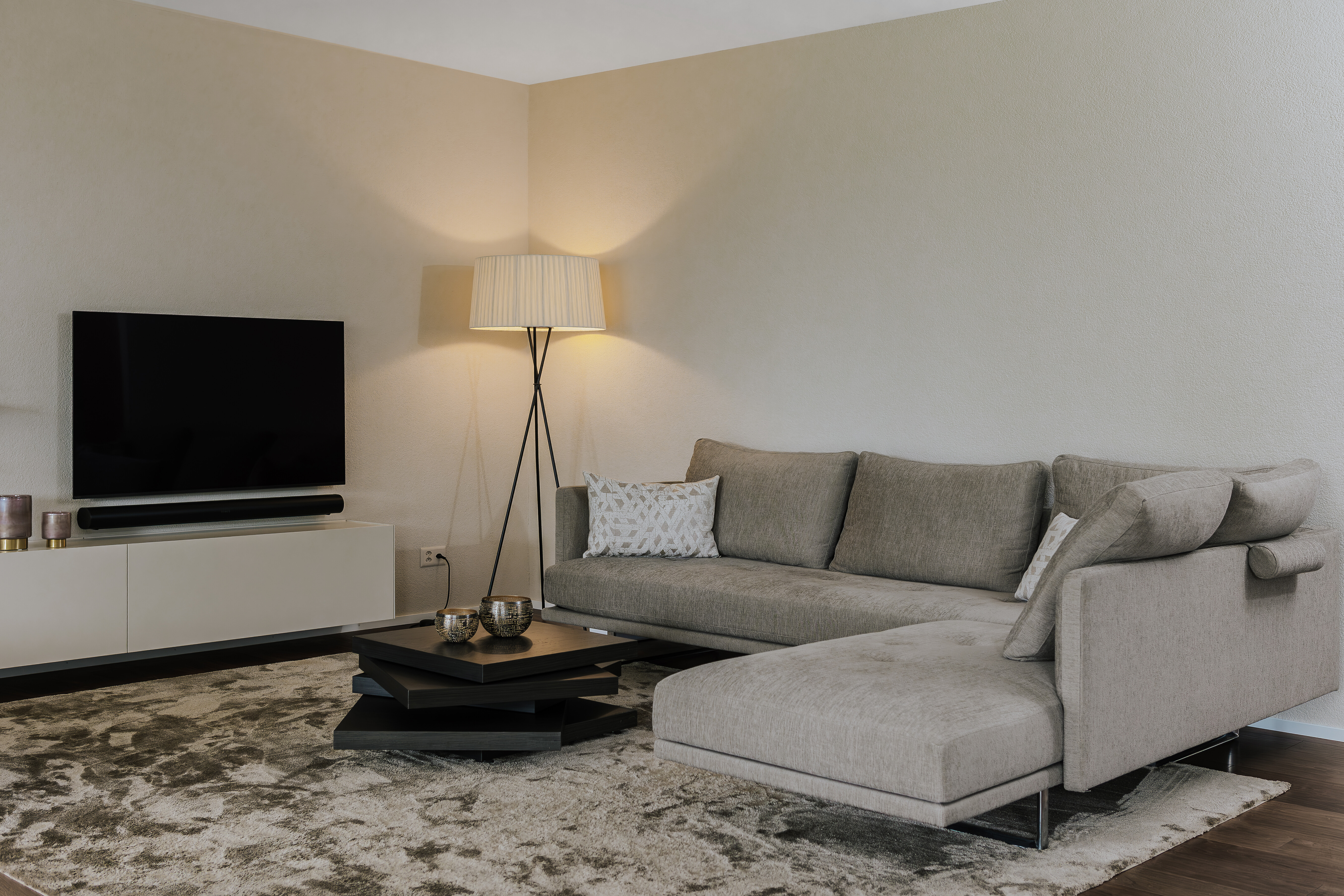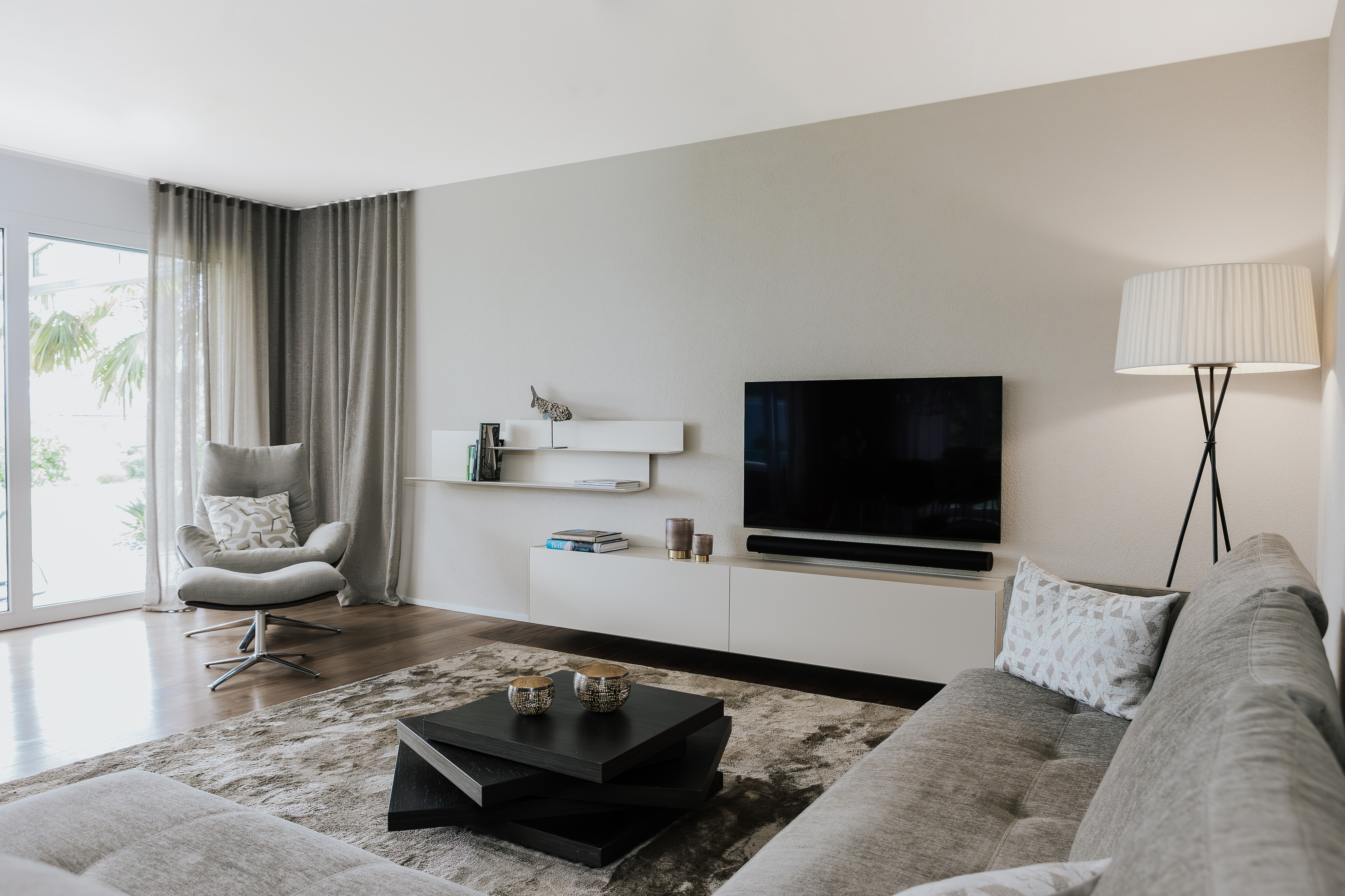 Der Wohnbereich wirkt offen und zugleich geborgen – eine ruhige Komposition aus weichen Formen, zurückhaltenden Farben und fein abgestimmten Proportionen. Die Möbel gruppieren sich locker im Raum, ohne ihn zu füllen, und schaffen eine entspannte Mitte, die nicht aufdrängt, sondern einlädt. Textilien und Oberflächen sind sorgfältig aufeinander abgestimmt; nichts ist laut, alles trägt zur Gelassenheit des Raumes bei. Die Stehleuchte setzt einen rhythmischen Akzent, während die transparenten Vorhänge das Tageslicht weich brechen und den Raum im Verlauf des Tages immer wieder neu erscheinen lassen. So entsteht ein Ort, der nicht nur eingerichtet, sondern bewusst gestaltet ist – mit spürbarer Ruhe, ohne Stillstand.