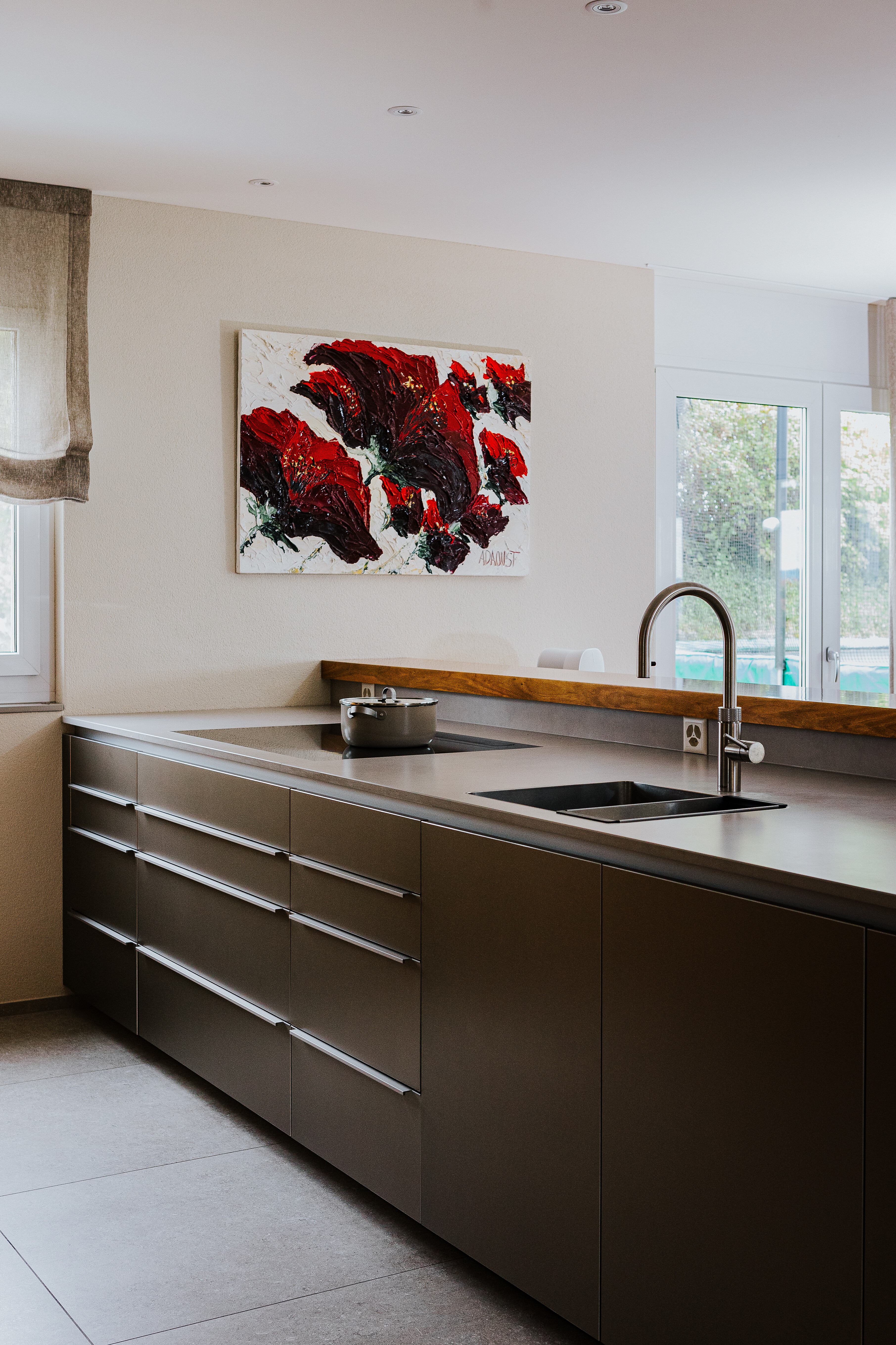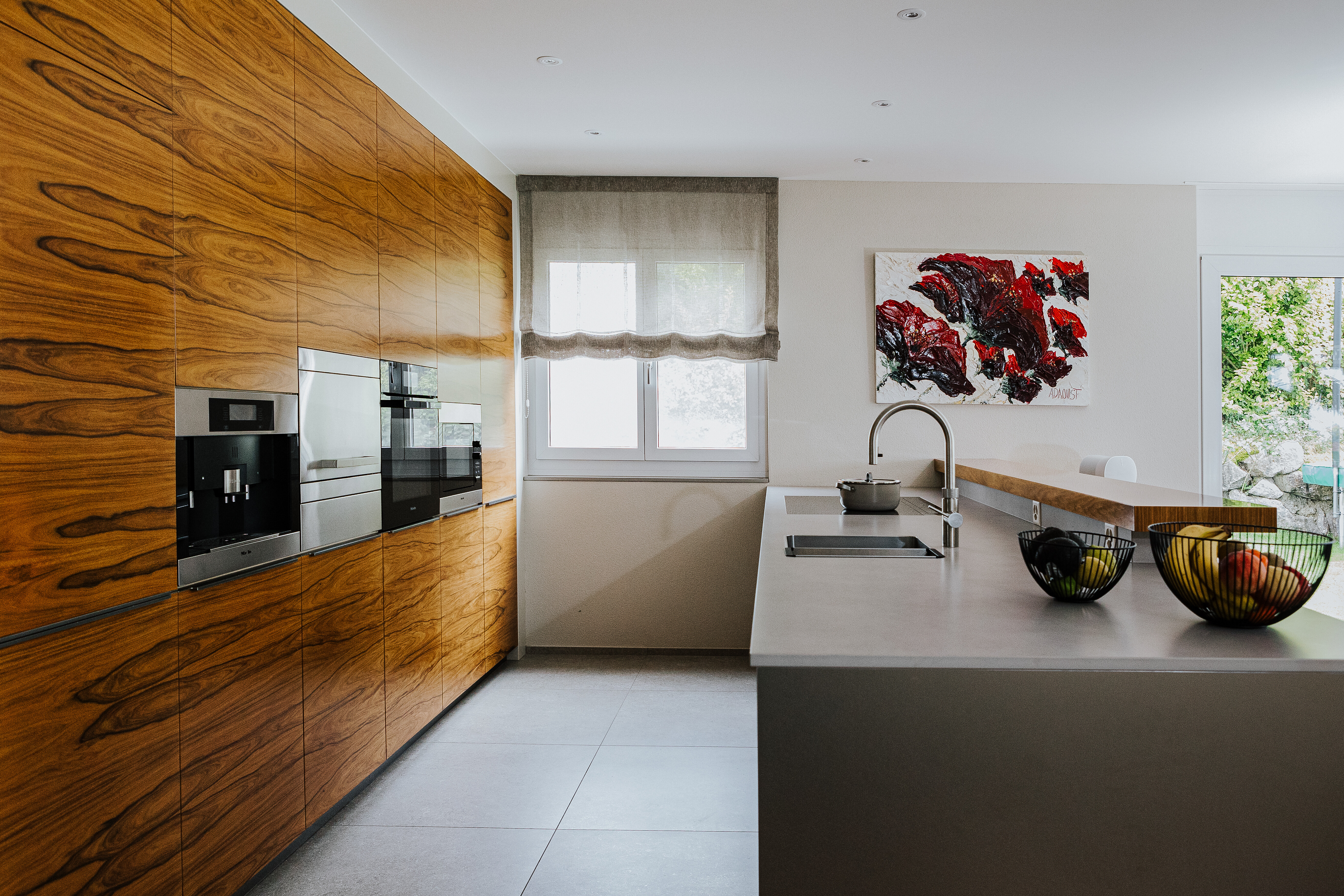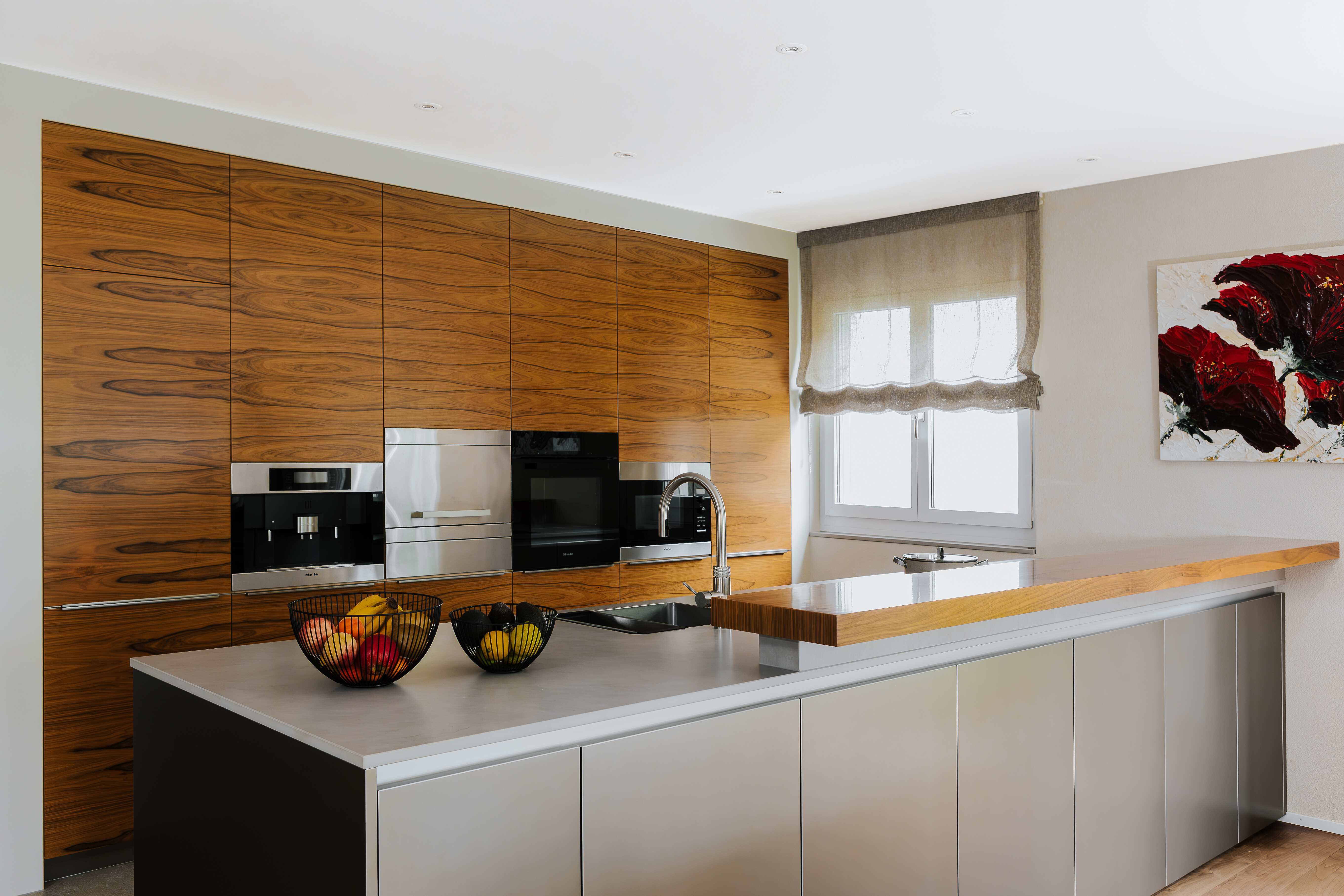 Die Küche von Poggenpohl ist präzise geplant und zurückhaltend inszeniert. Auf der einen Seite prägen grifflose Fronten in markant gemasertem Holz das Bild, während die gegenüberliegenden Unterschränke mit fein gearbeiteten Griffleisten aus Metall gestaltet sind – funktional und dennoch zurückhaltend. Eingebaut wurden hochwertige Geräte von Miele, darunter das Induktionskochfeld KM 7897-1 FL Diamond mit Vollflächeninduktion sowie der Backofen H 7860 BP. Die Arbeitszeile mit aufgesetzter Thekenplatte aus Holz wird durch das Quooker Armaturensystem ergänzt und verbindet Arbeitskomfort mit einer gestalterisch ruhigen Anmutung. Das Faltrollo von Silent Gliss sorgt für eine sanfte Lichtstimmung und rundet das Raumgefühl ab.